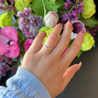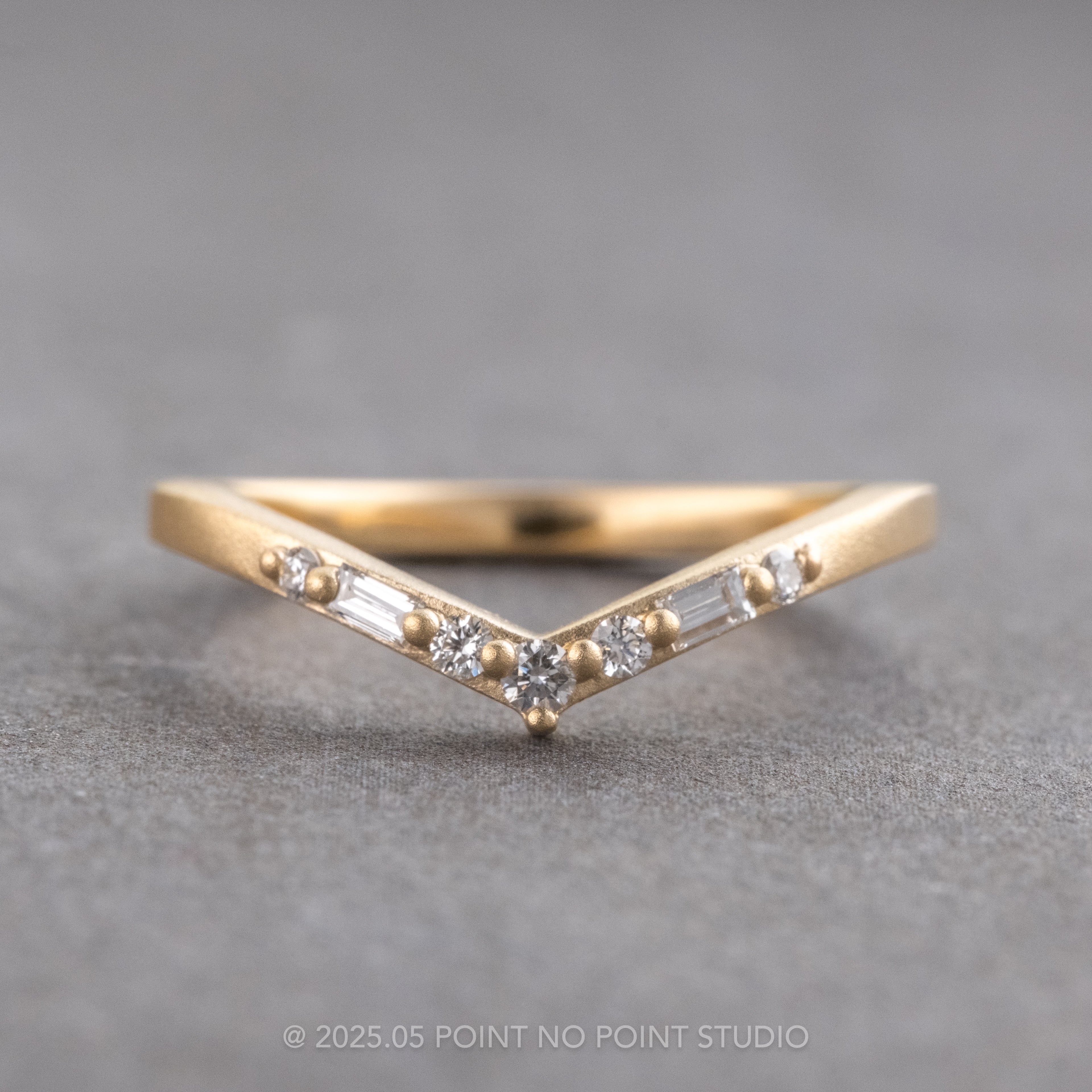 Round and Baguette Diamond V Band, Paloma Setting, Sandblasted Finish, 14K Yellow Gold