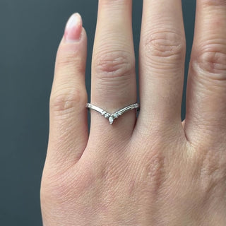 This timeless and unique diamond wedding band features a gradient of white, grey and black diamonds. This V shaped diamond band can be worn alone, stacked in multiples, or to match any number of engagement rings!