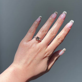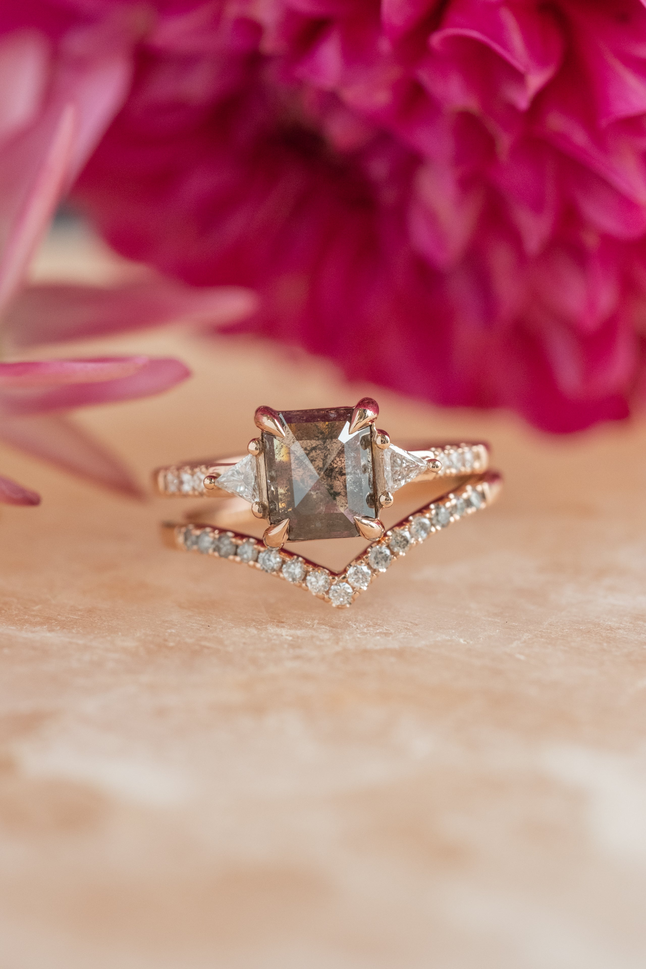 This engagement ring features a mesmerizing and incredibly sparkly 1.31 carat black speckled rose cut emerald shaped diamond. The emerald is a top quality natural diamond; it is semi-translucent with unique tones and facets that catch the light. Flanked on either side by GHSI white triangle diamonds, followed by GHSI white round accent diamonds set into the band for that extra sparkle!