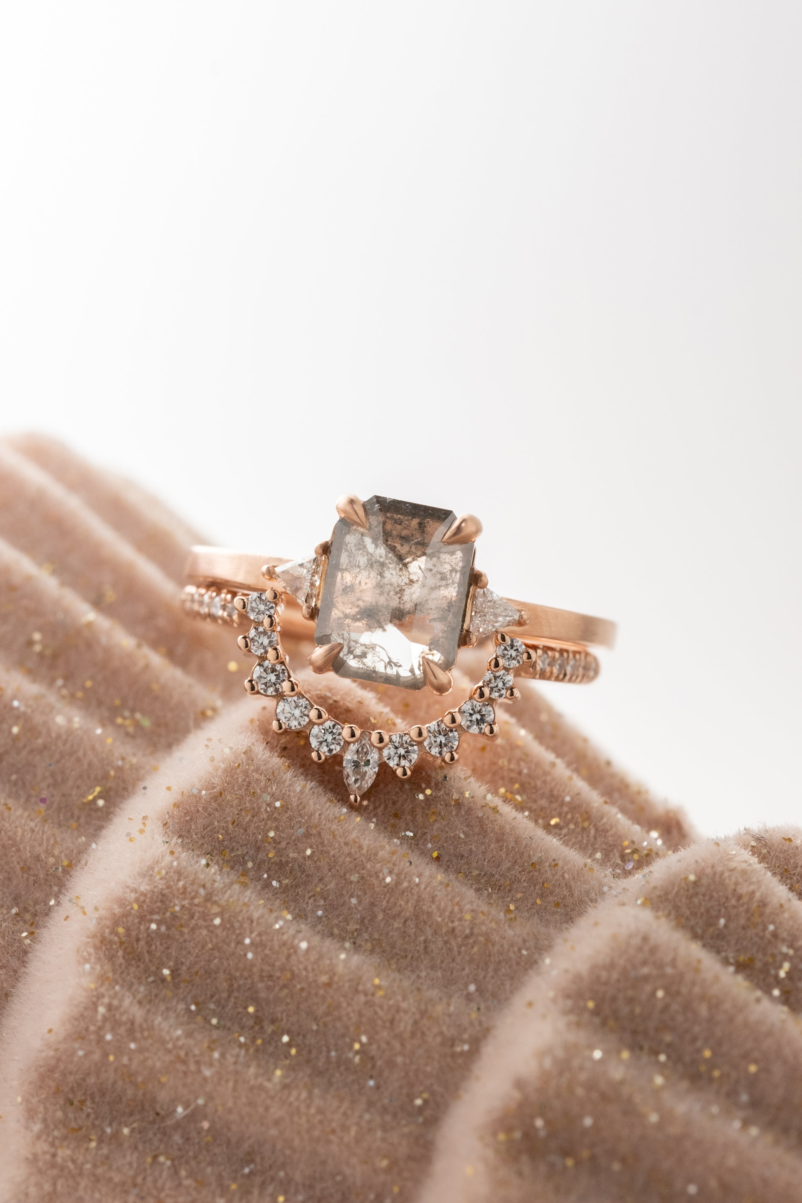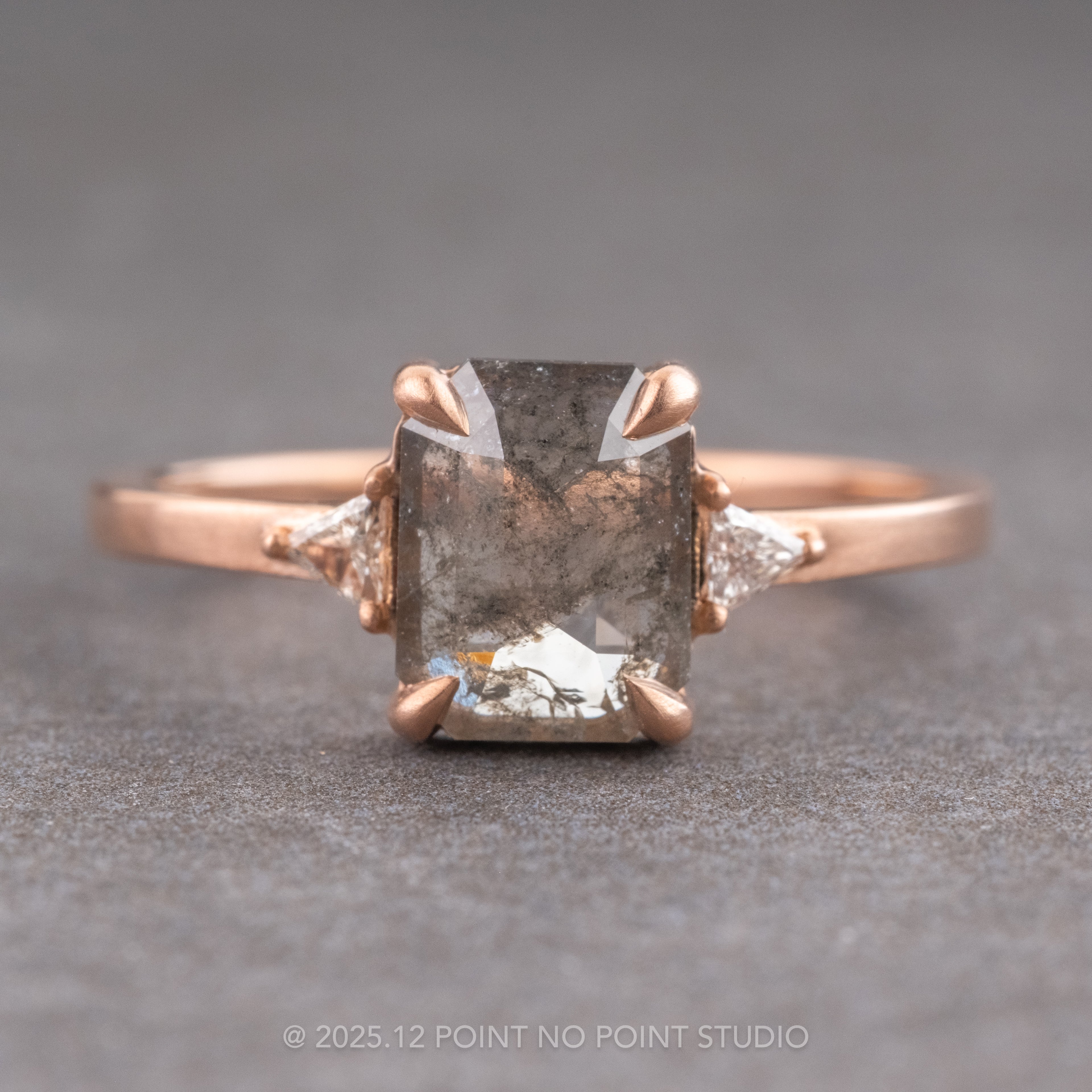 This ring features a beautiful salt and pepper emerald rose cut diamond. The diamond is a top quality, un-enhanced, semi-translucent natural grey speckled diamond; set on either side of the center stone are white brilliant cut triangle accent diamonds. The diamond is set into an open back setting which allows you to see and admire the unique inner structure, tones, and marbling of the diamond.
