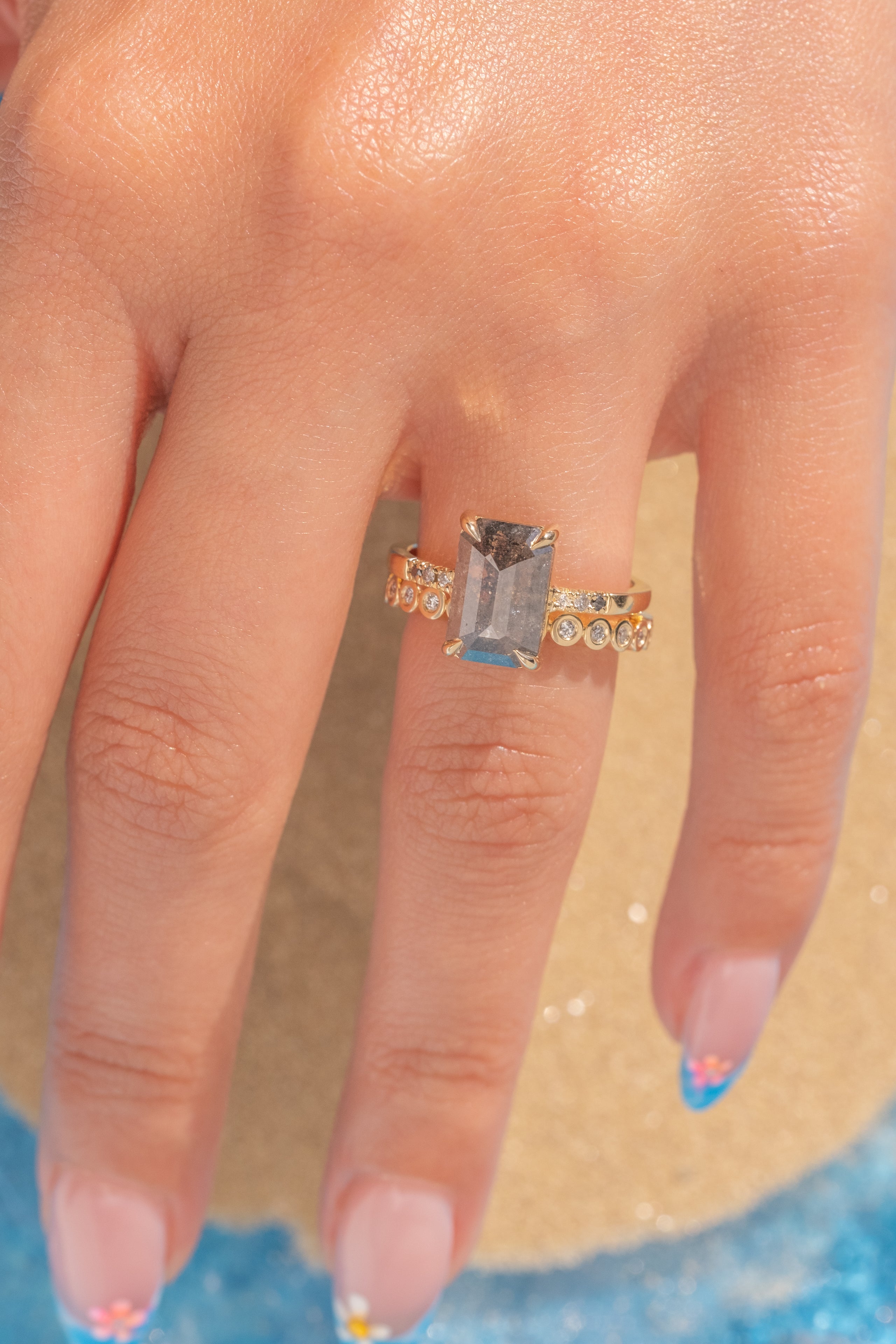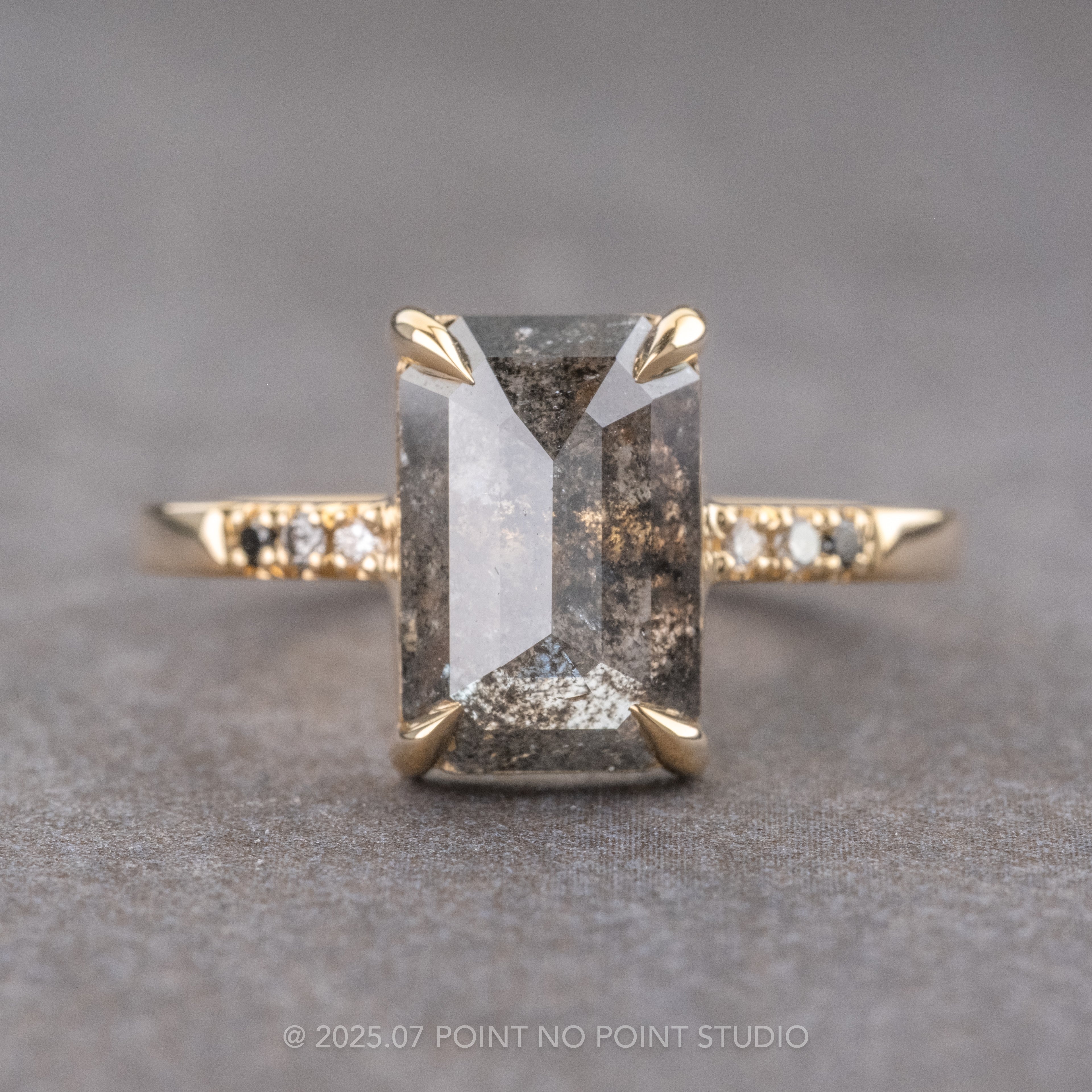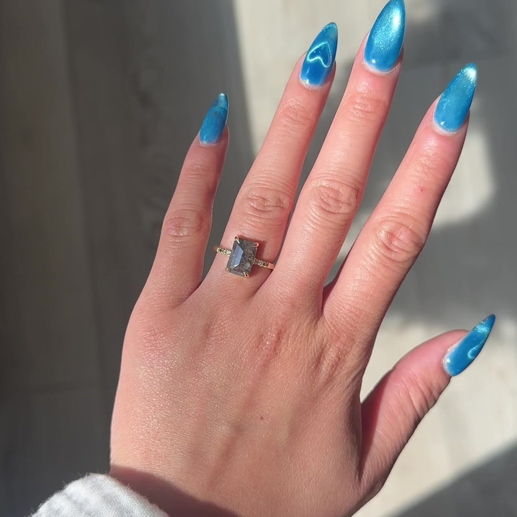 Salt and Pepper Emerald Shaped Diamond Engagement Ring