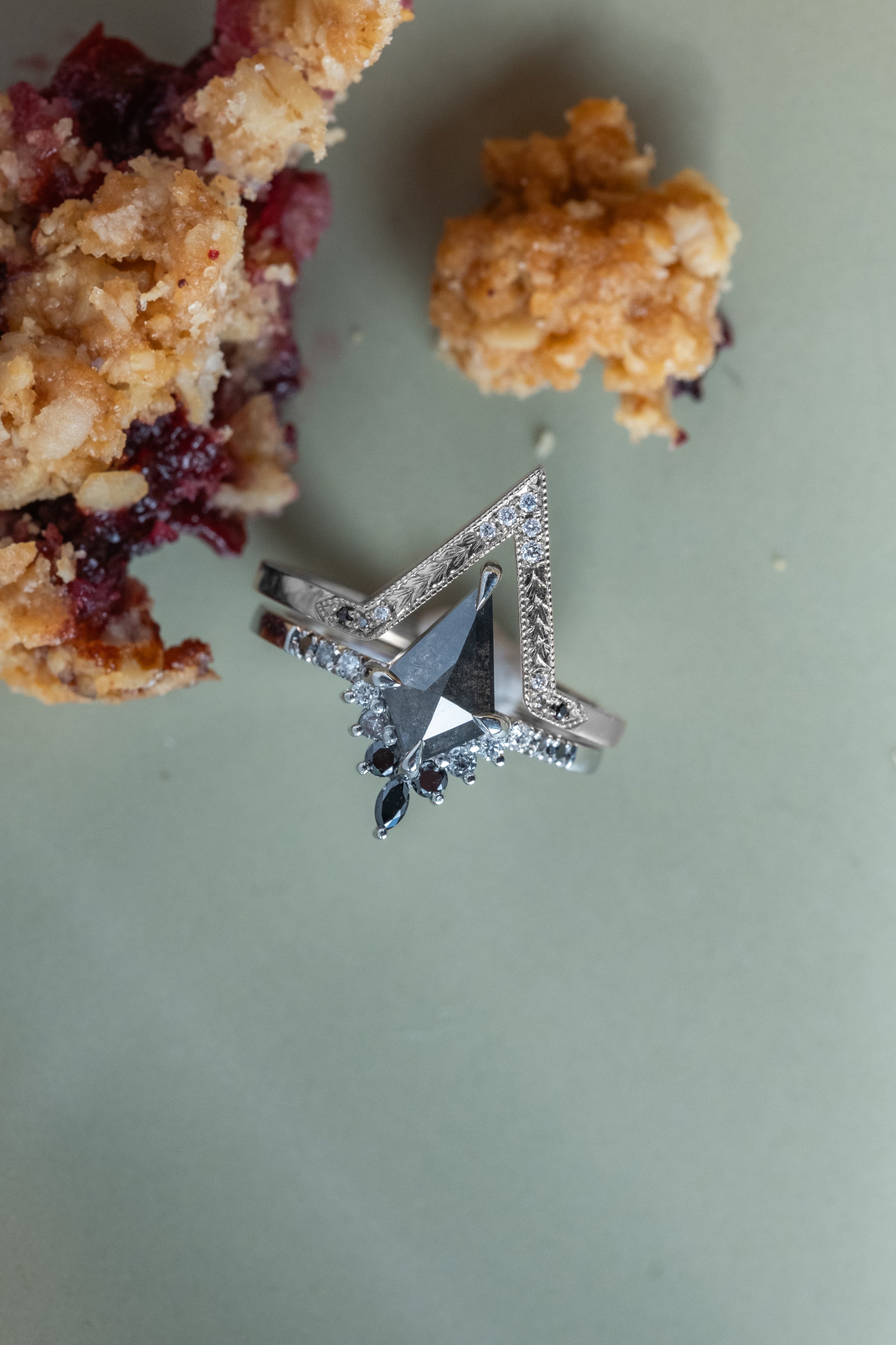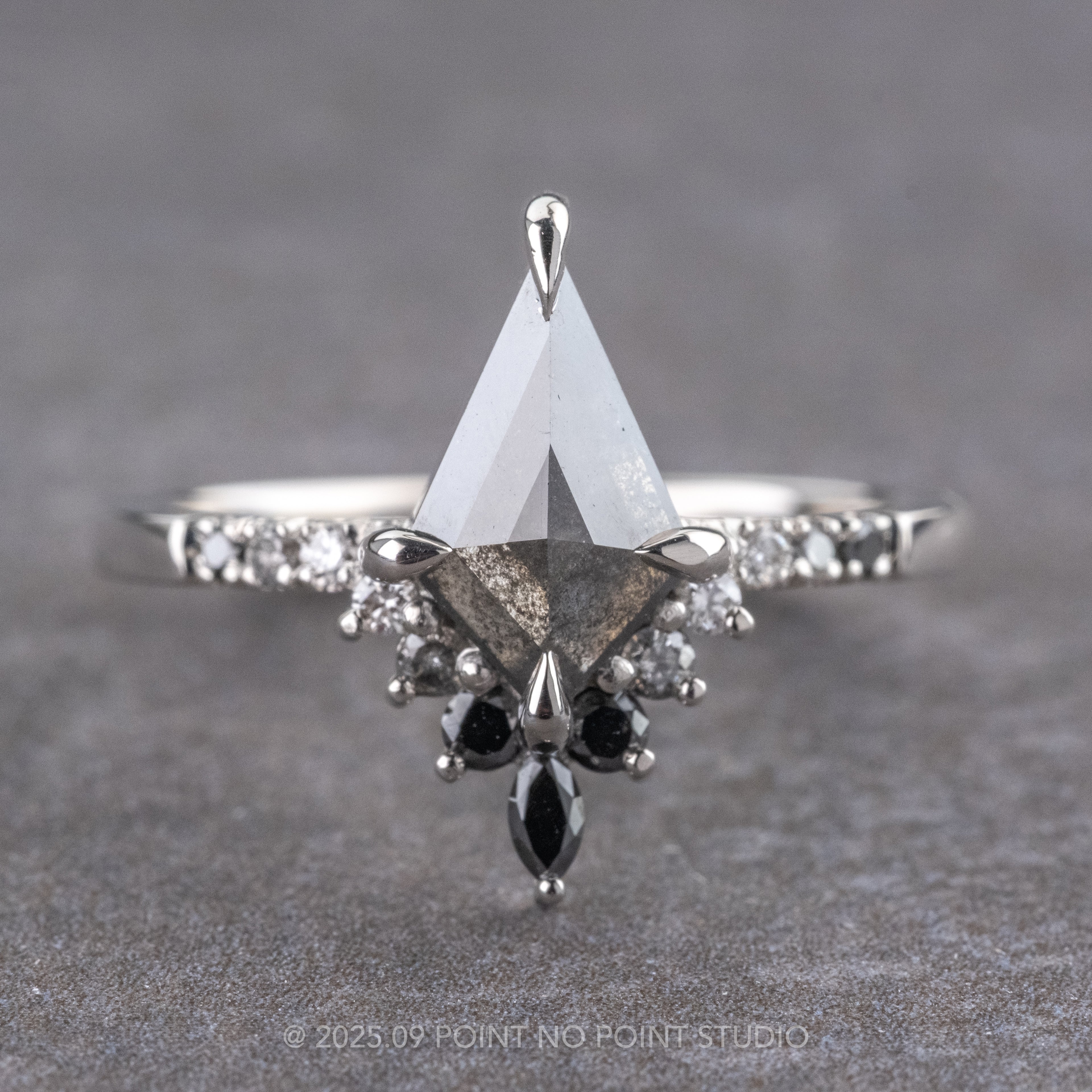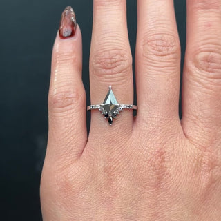 This timeless engagement ring features a .99 carat black speckled kite shaped diamond. The diamond is a top quality natural diamond; it is semi-translucent with unique facets that catch the light. The diamond is surrounded by a gradient of round brilliant cut diamonds with a sparkly black marquise diamond as the focal point. Followed by one white, grey and black brilliant cut diamond set into the band to complete the look!