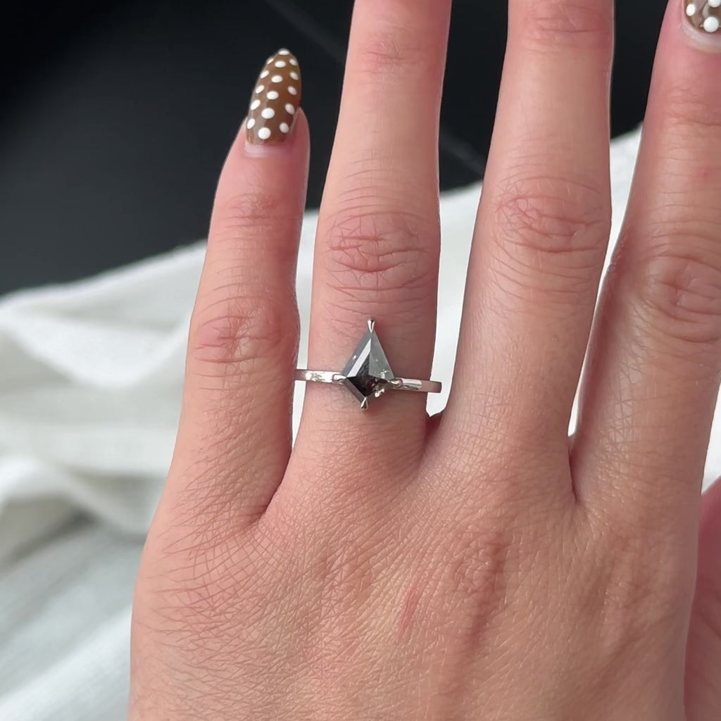 This engagement ring features a beautiful 1.54 carat black speckled kite shaped diamond. The diamond is a top quality natural diamond that has not been heated or treated in any way; it is semi-translucent with unique inner tones and facets that catch the light.