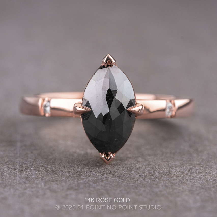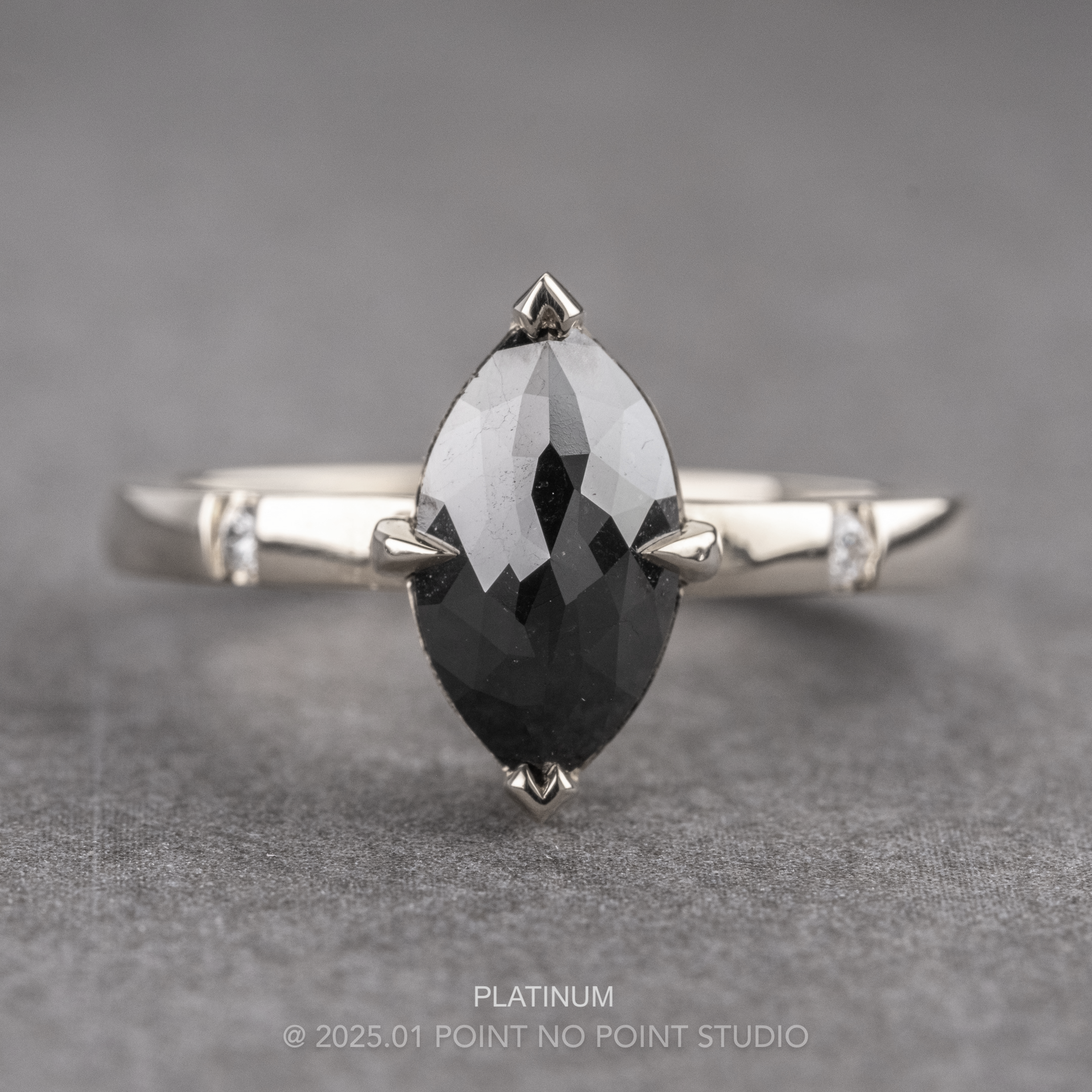 This engagement ring features a mesmerizing 1.60 carat black rose cut marquise diamond. The diamond is a top quality natural diamond; it is opaque with unique facets that catch the light. Off-set into the band on either side is a sparkly GHSI white brilliant cut diamond for that extra sparkle!