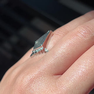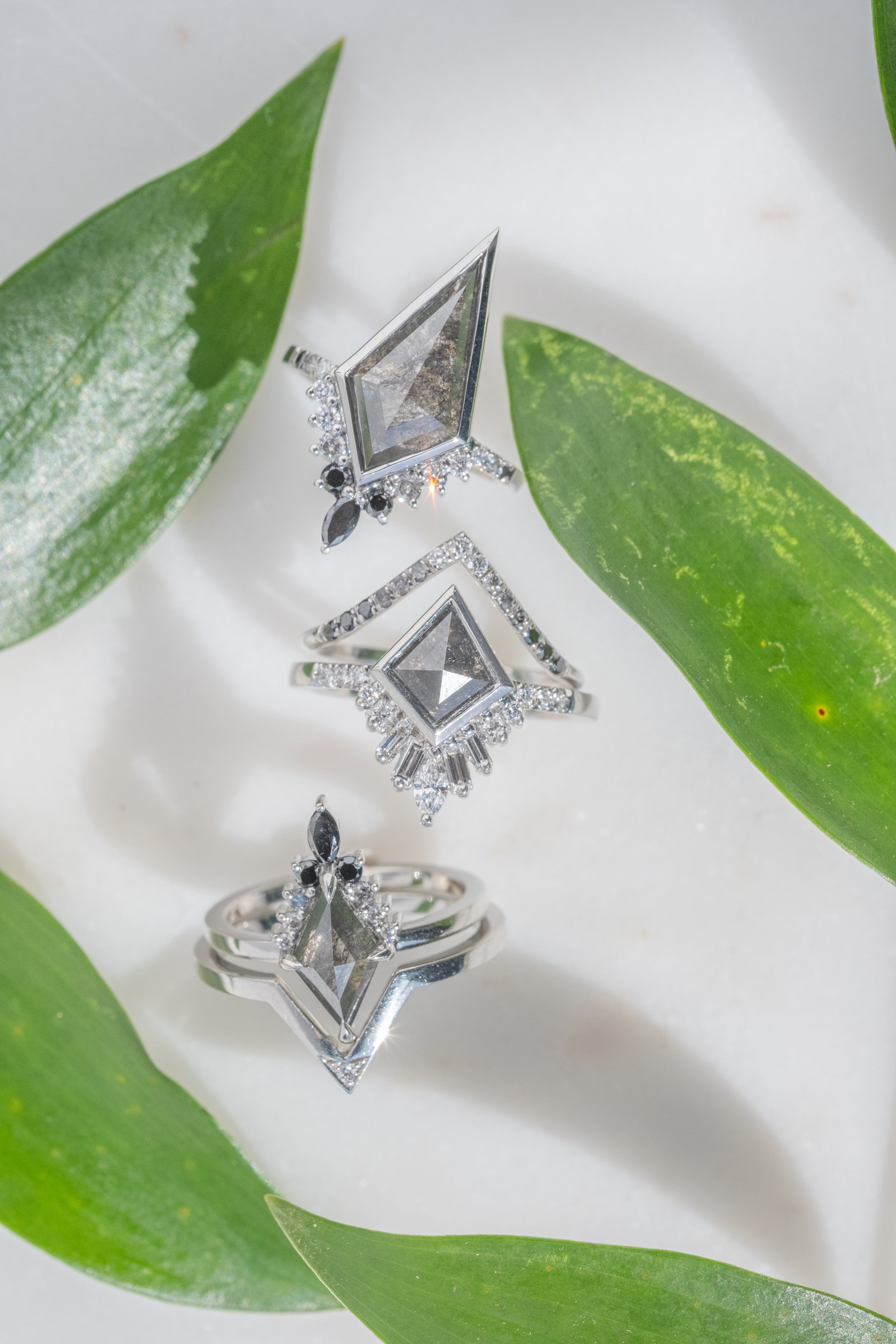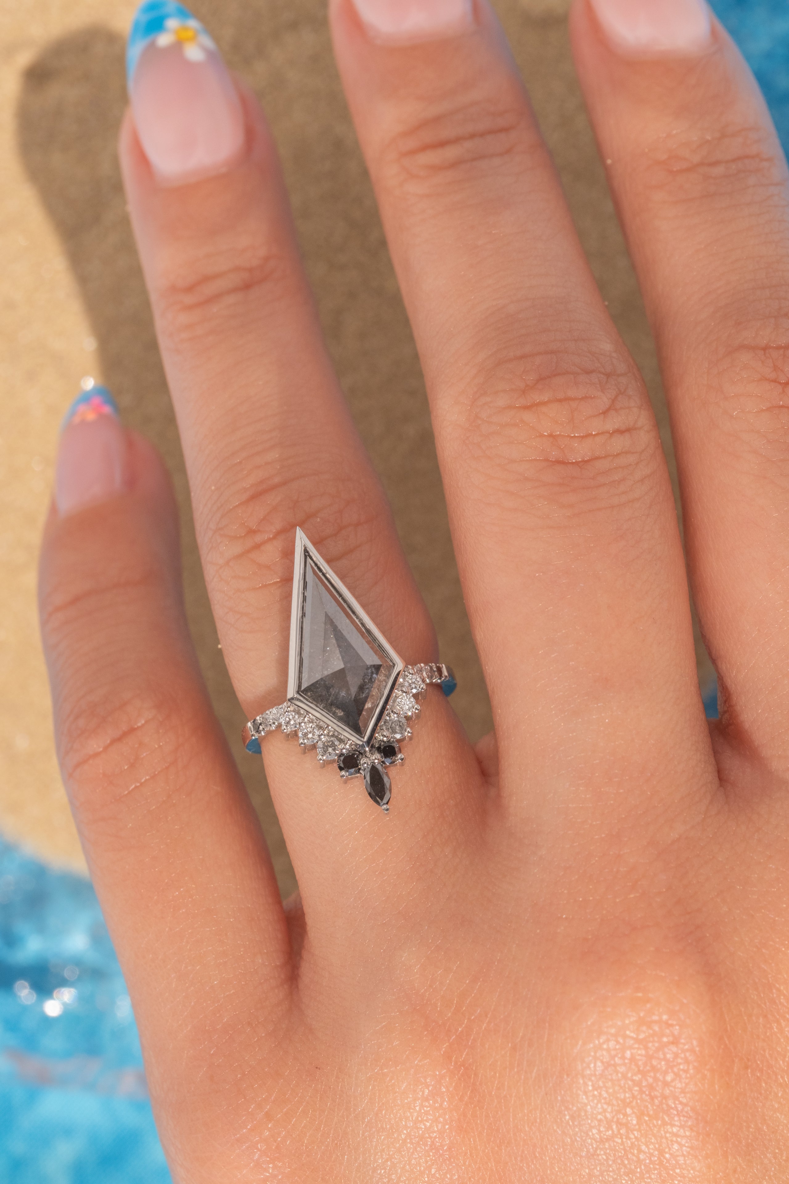This timeless engagement ring features a 1.88 carat black speckled kite shaped diamond. The diamond is a top quality un-enhanced natural diamond; it is semi-translucent with unique tones and facets that catch the light. The diamond is surrounded by a gradient of round brilliant cut diamonds with a sparkly black marquise diamond as the focal point. Followed by one white, grey and black brilliant cut diamond set into the band to complete the look!