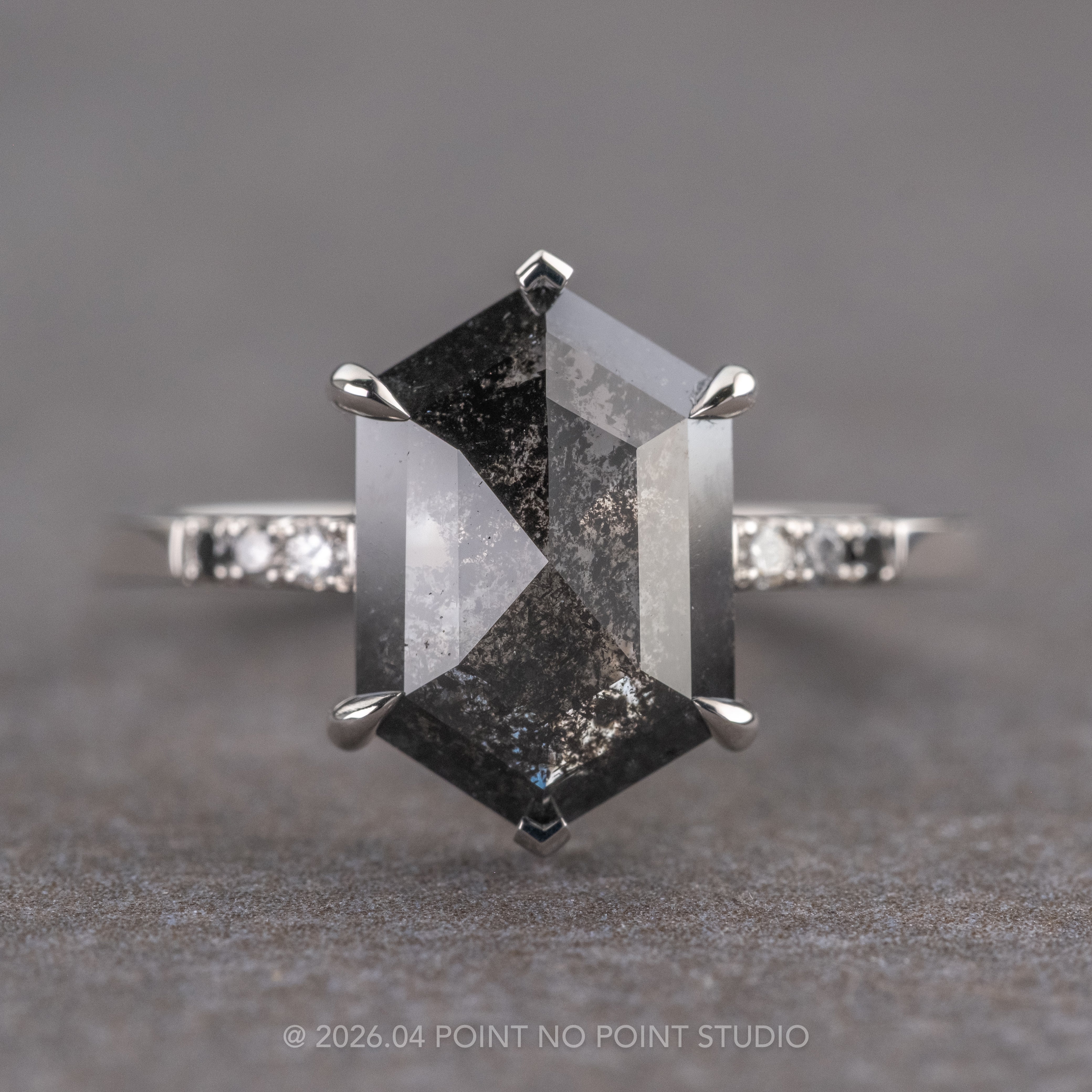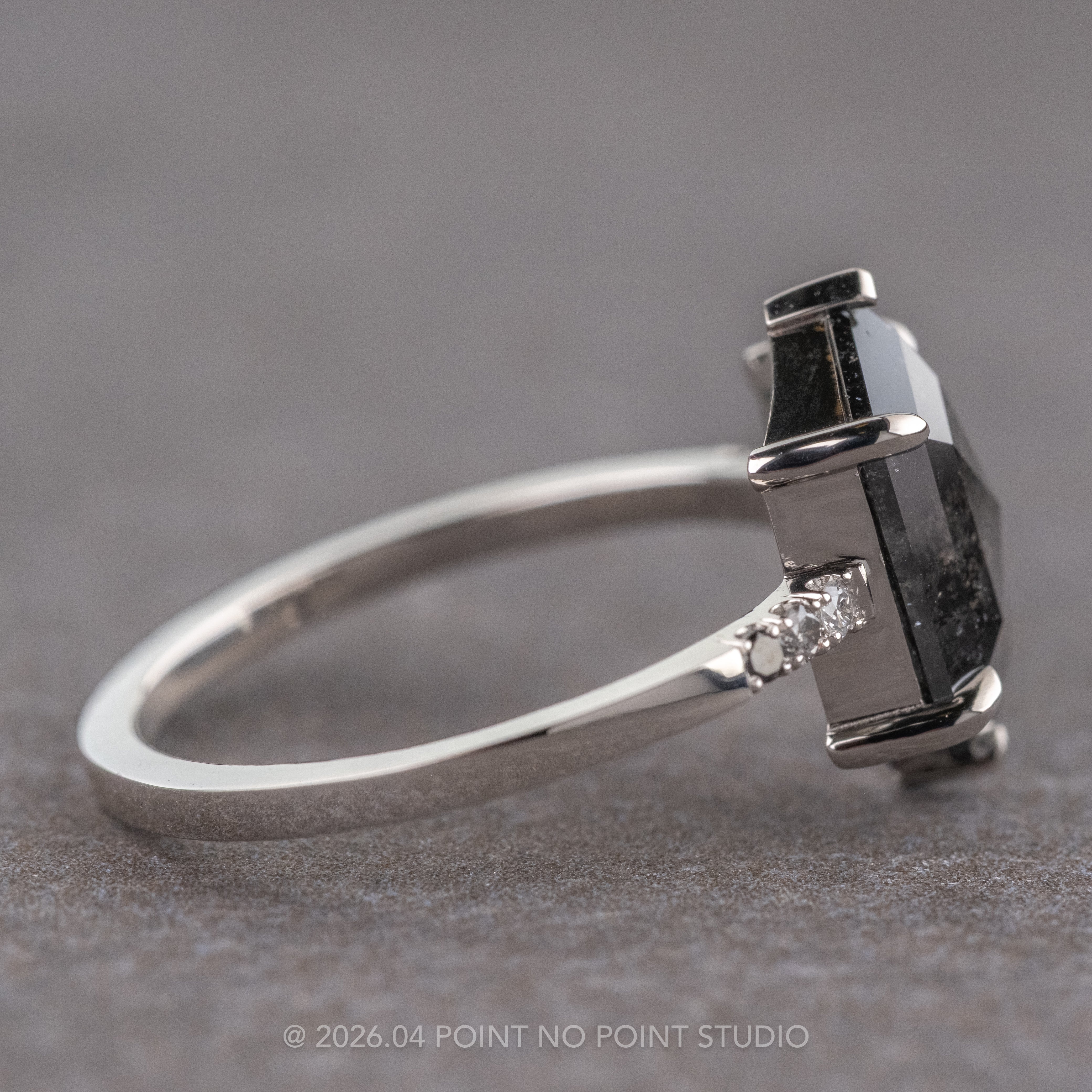 Set on either side of the center stone are three ombre diamonds that gradient in color. Each side of the hexagon diamond has one white, grey, and black diamond most outward set into the ring band.