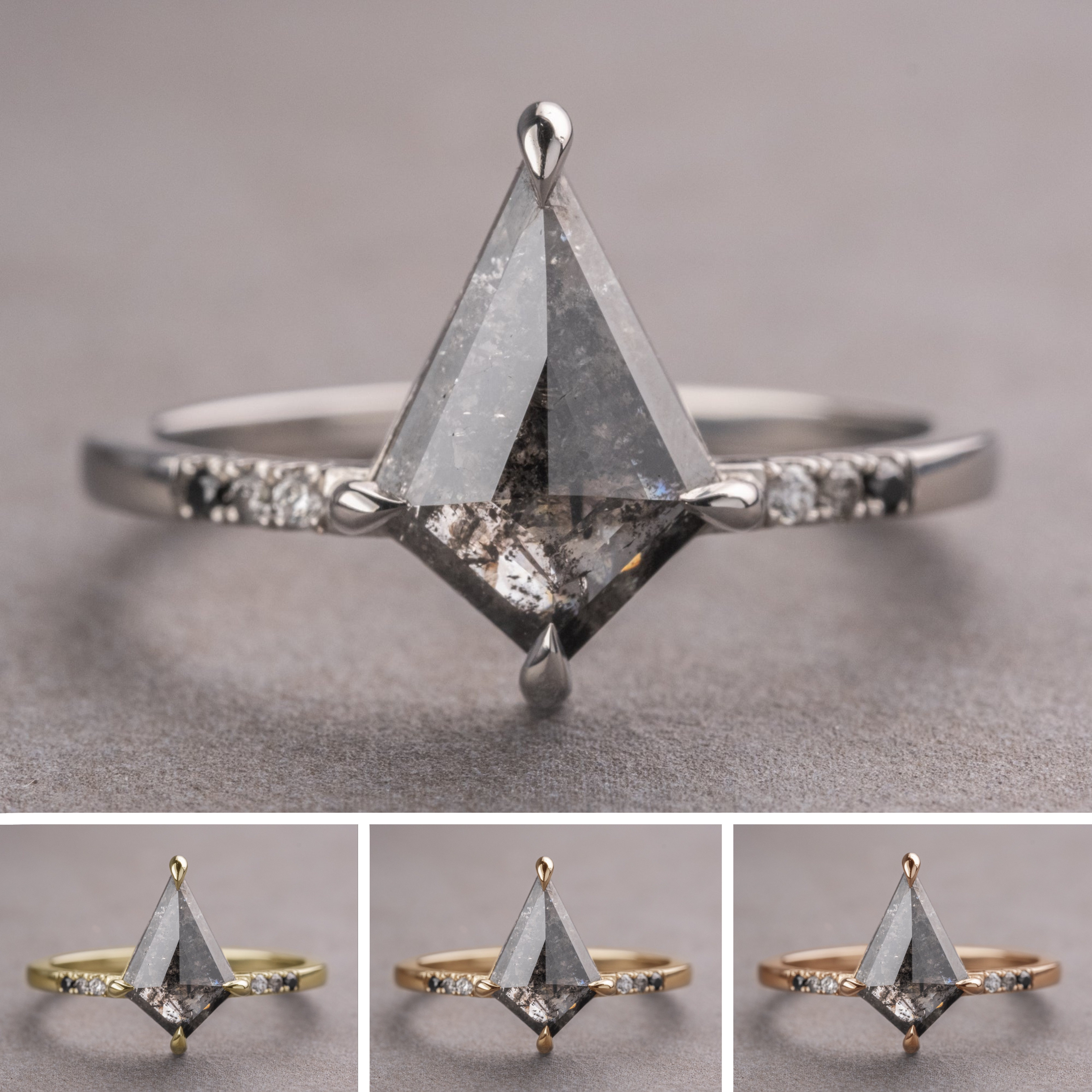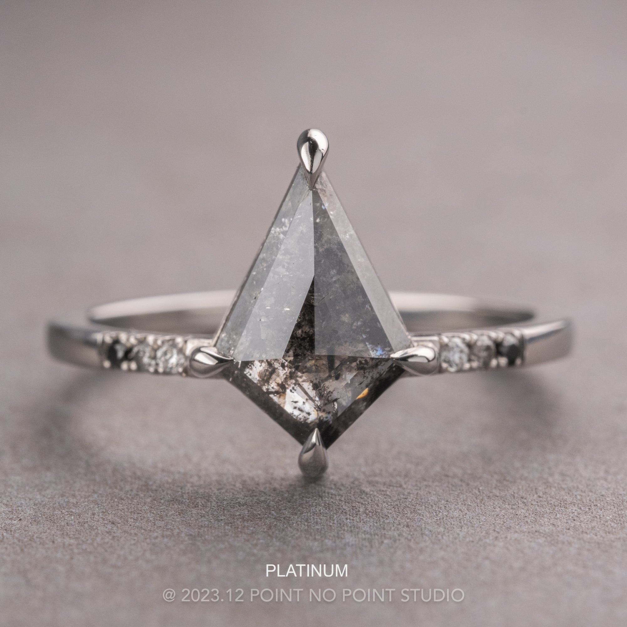 This ring features a stunning 1.21 carat natural black speckled kite diamond. The diamond is a top quality un-enhanced diamond; it is semi-translucent with unique tones and facets that catch the light. Each side of the kite diamond has one white, grey, and black diamond set into the ring band to complete the look.