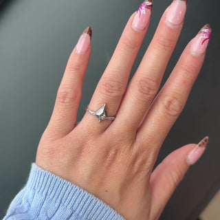 This ring features a stunning 1.16 carat natural black speckled kite diamond. The diamond is a top quality un-enhanced diamond; it is semi-translucent with unique tones and facets that catch the light. Each side of the kite diamond has one white, grey, and black diamond set into the ring band to complete the look.