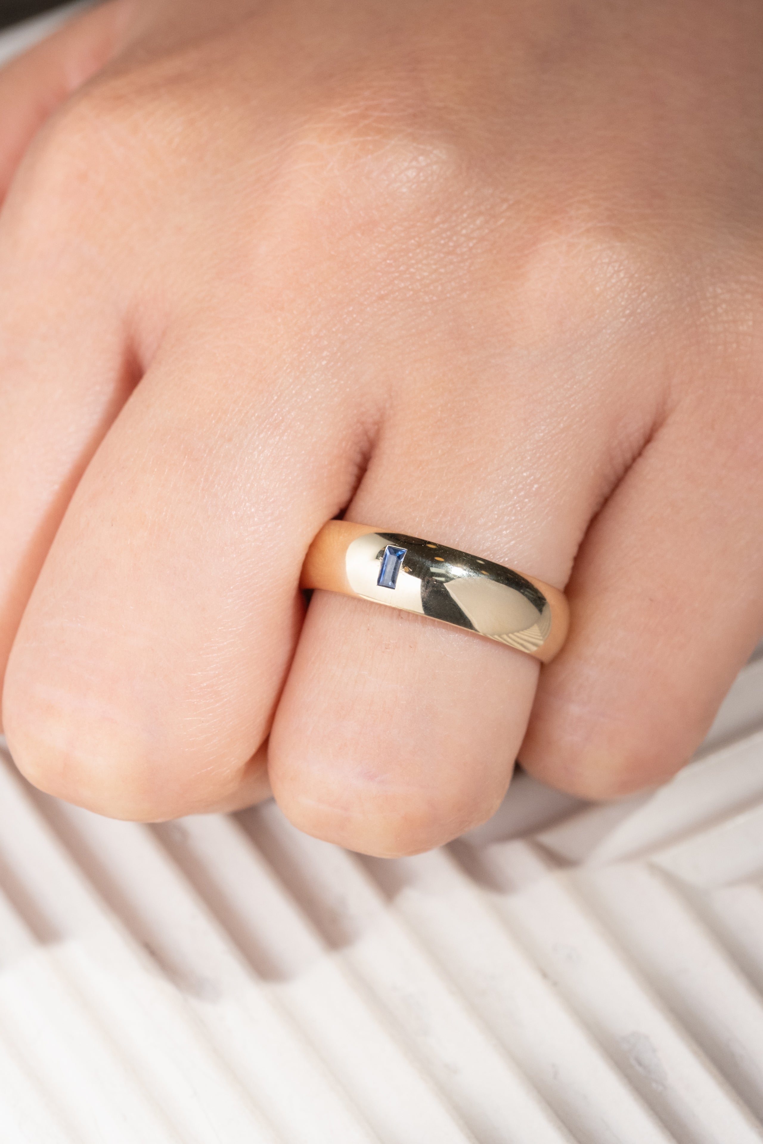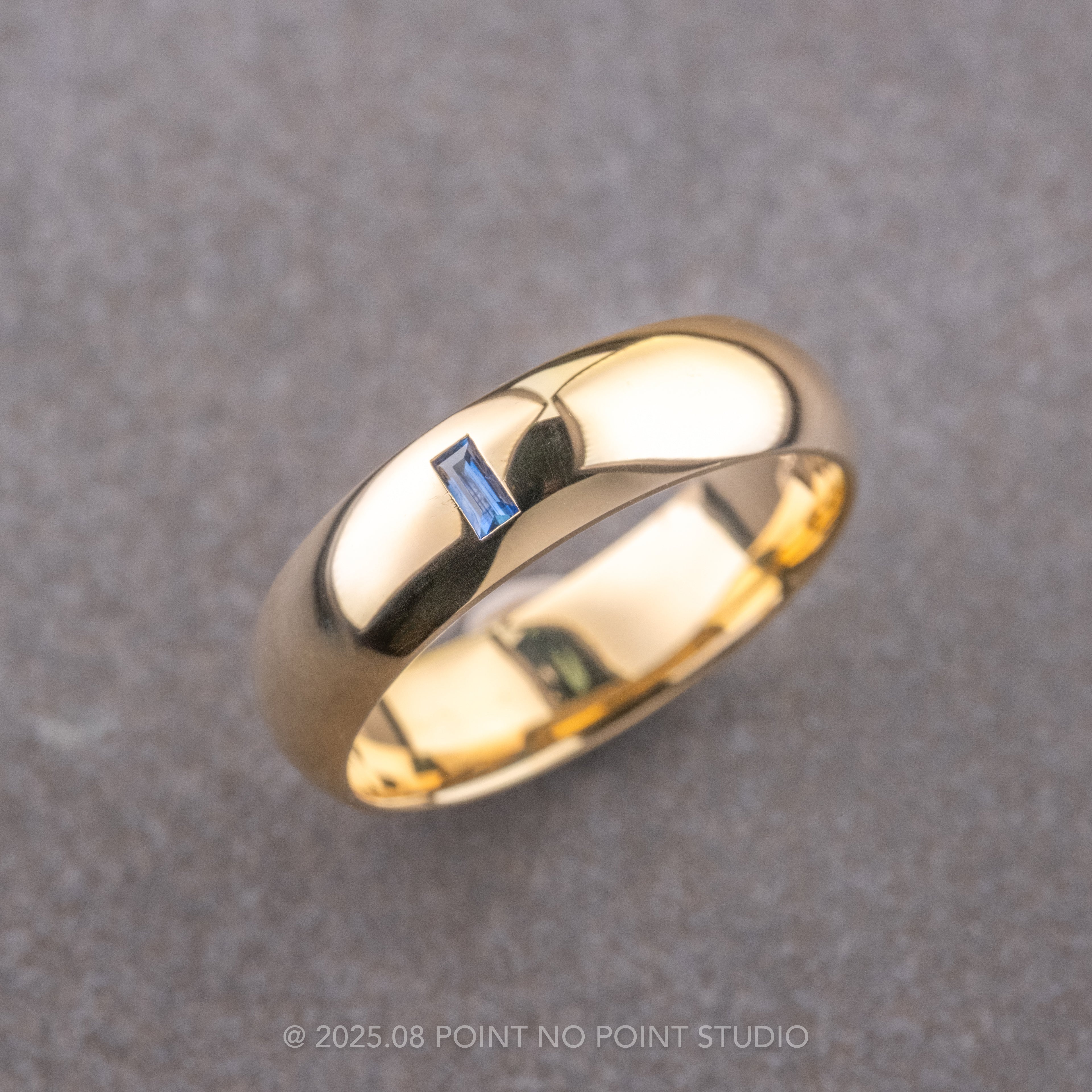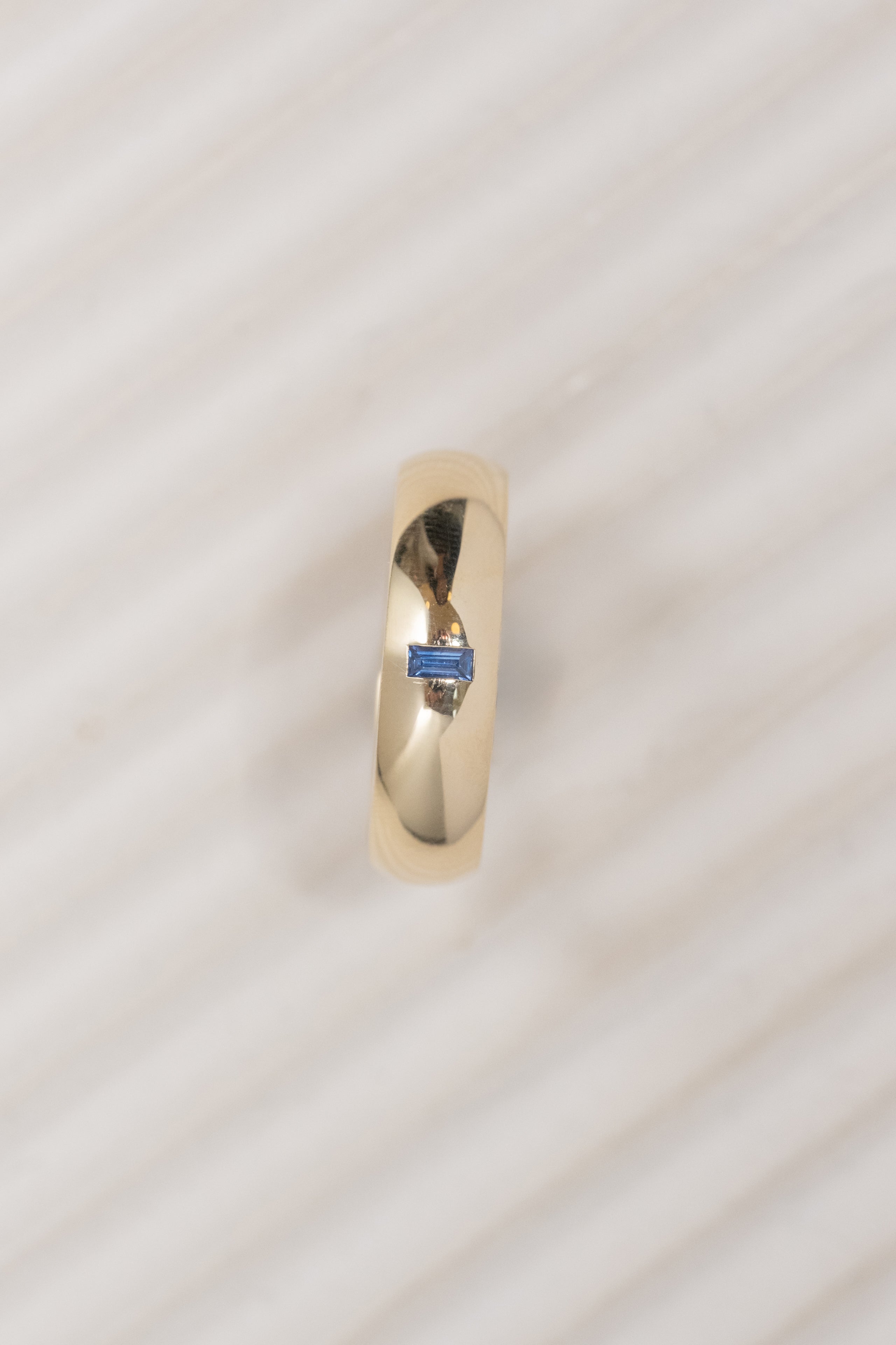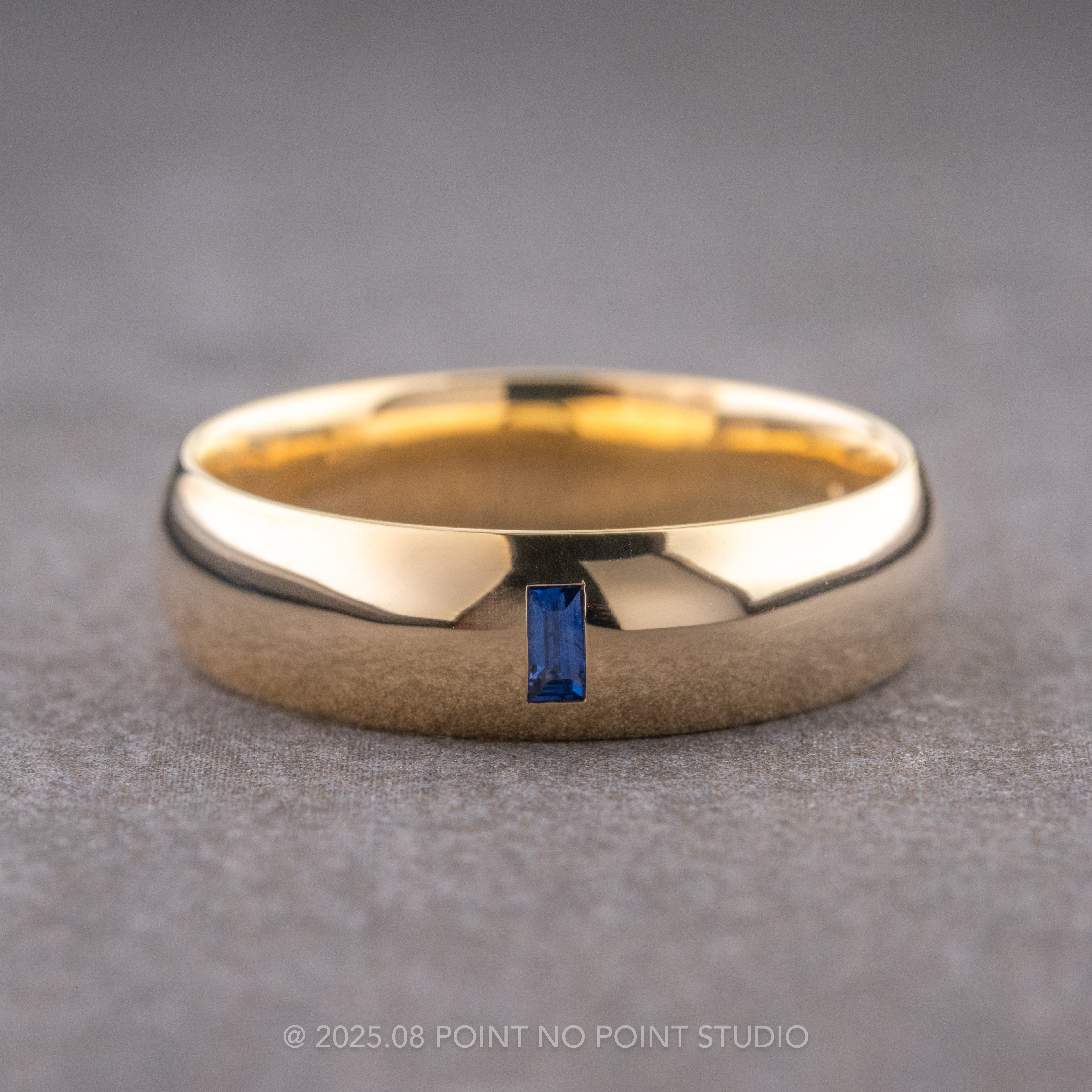 Baguette Blue Sapphire Mens Wedding Band, Comfort Fit, 14K Yellow Gold