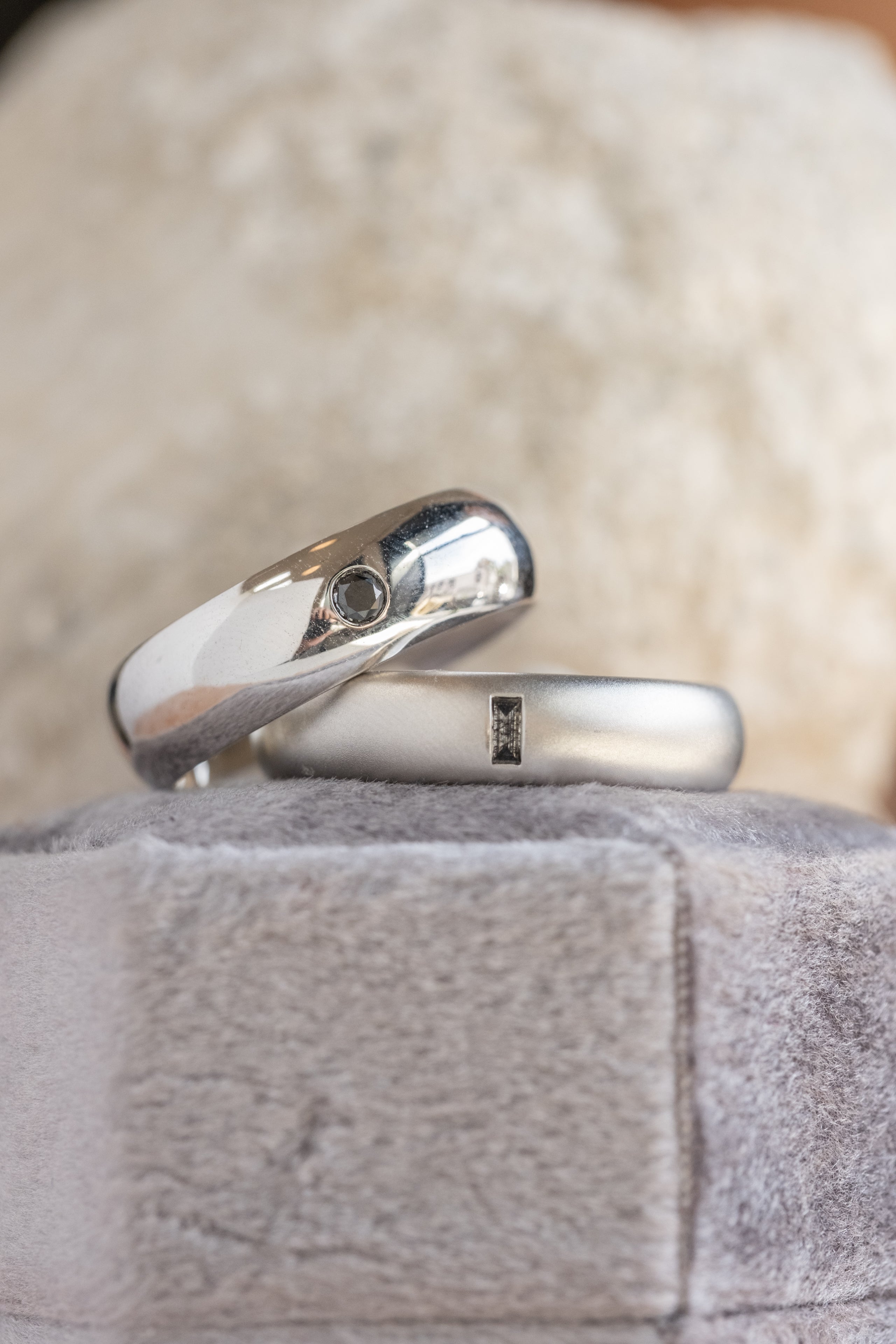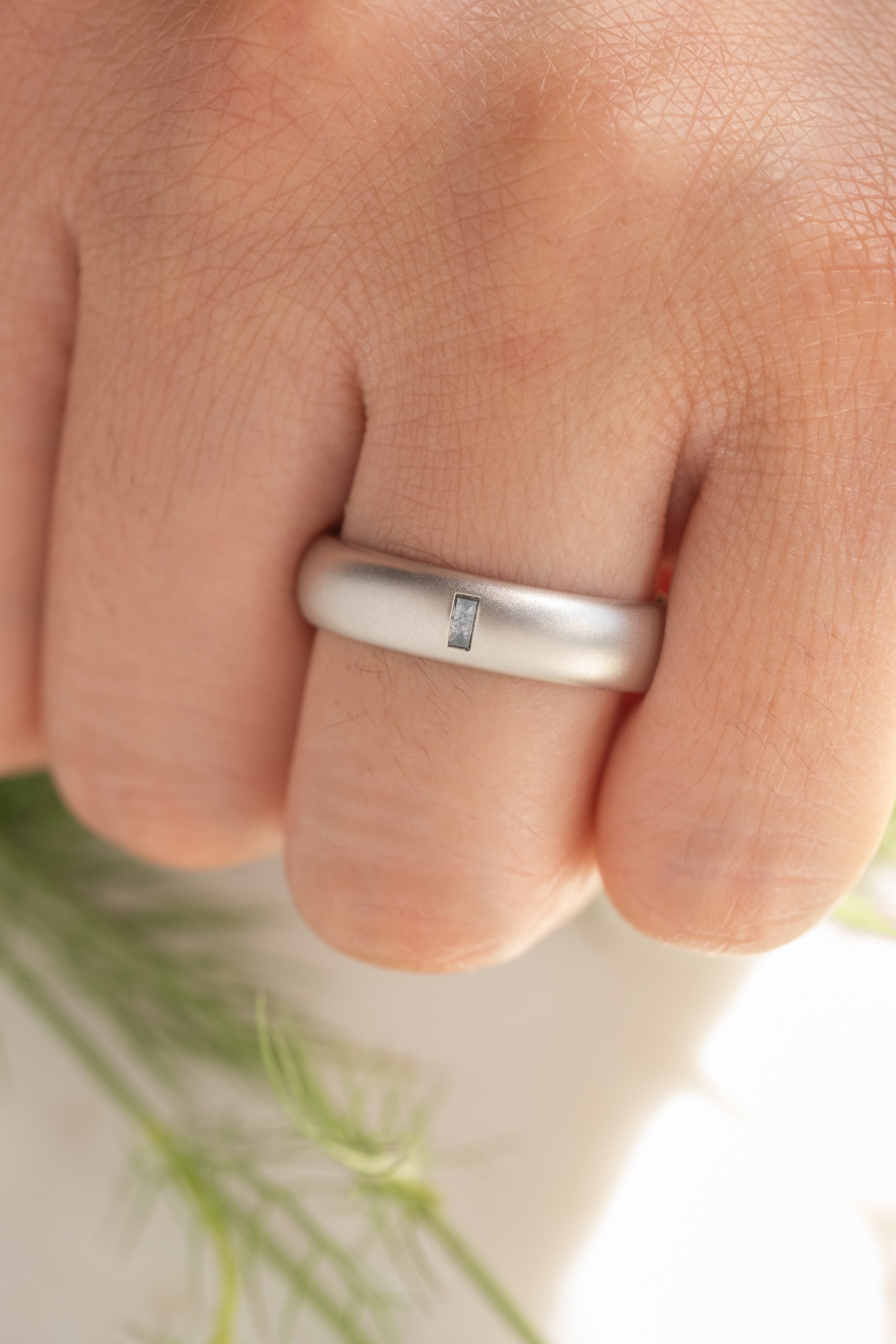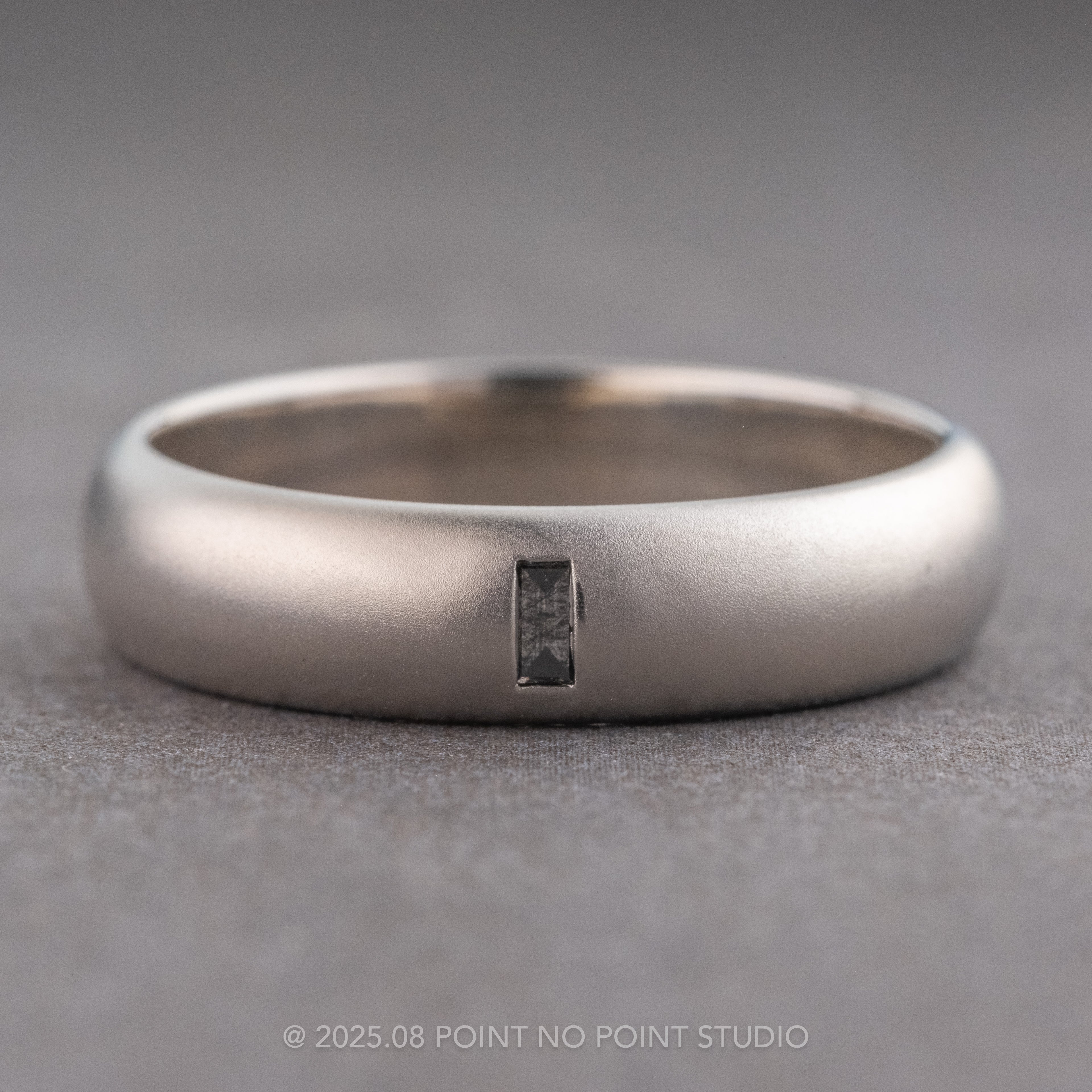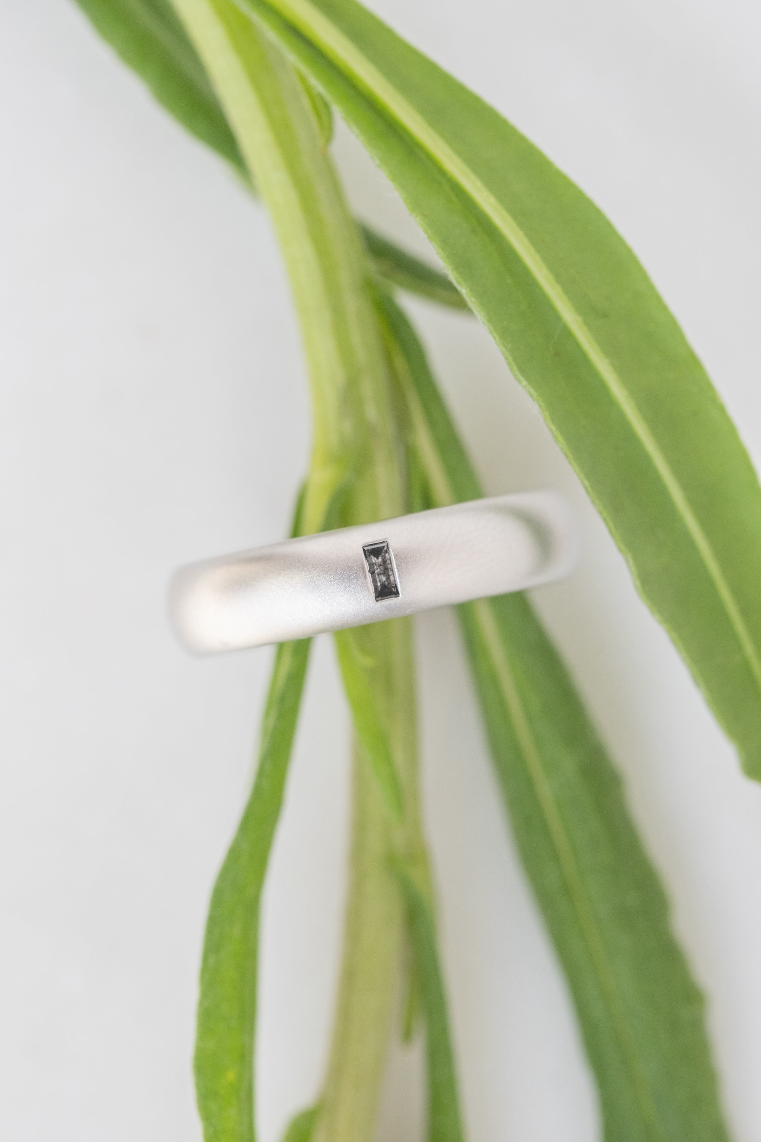This ring is made of solid recycled eco friendly recycled platinum. The band is so simple and traditional. The outside of the ring has been given an ultra matte sandblasted finish while the inside/edges of the ring are high polished. Set vertically into the center of the half rounded band is a step cut salt and pepper baguette diamond.