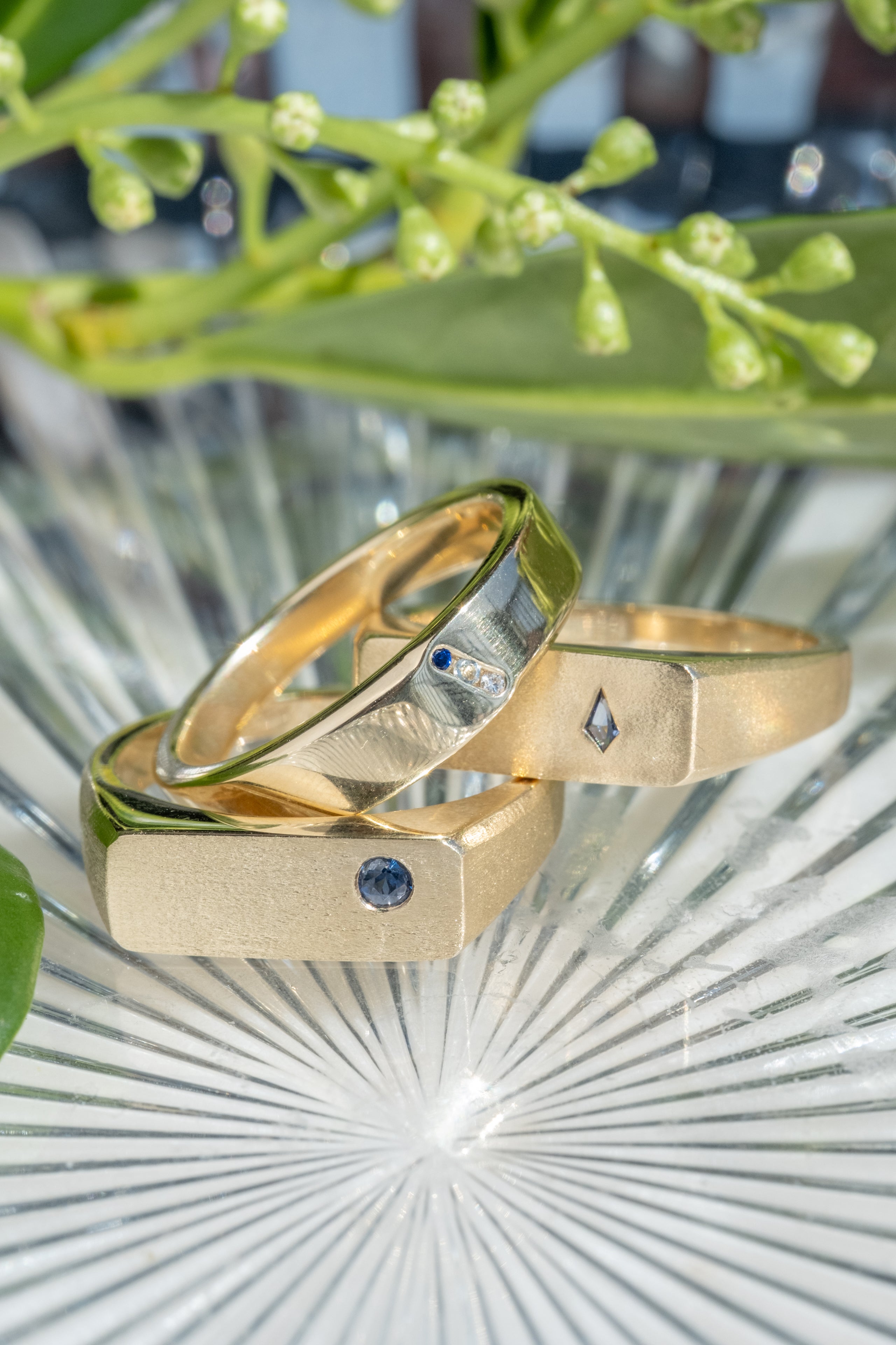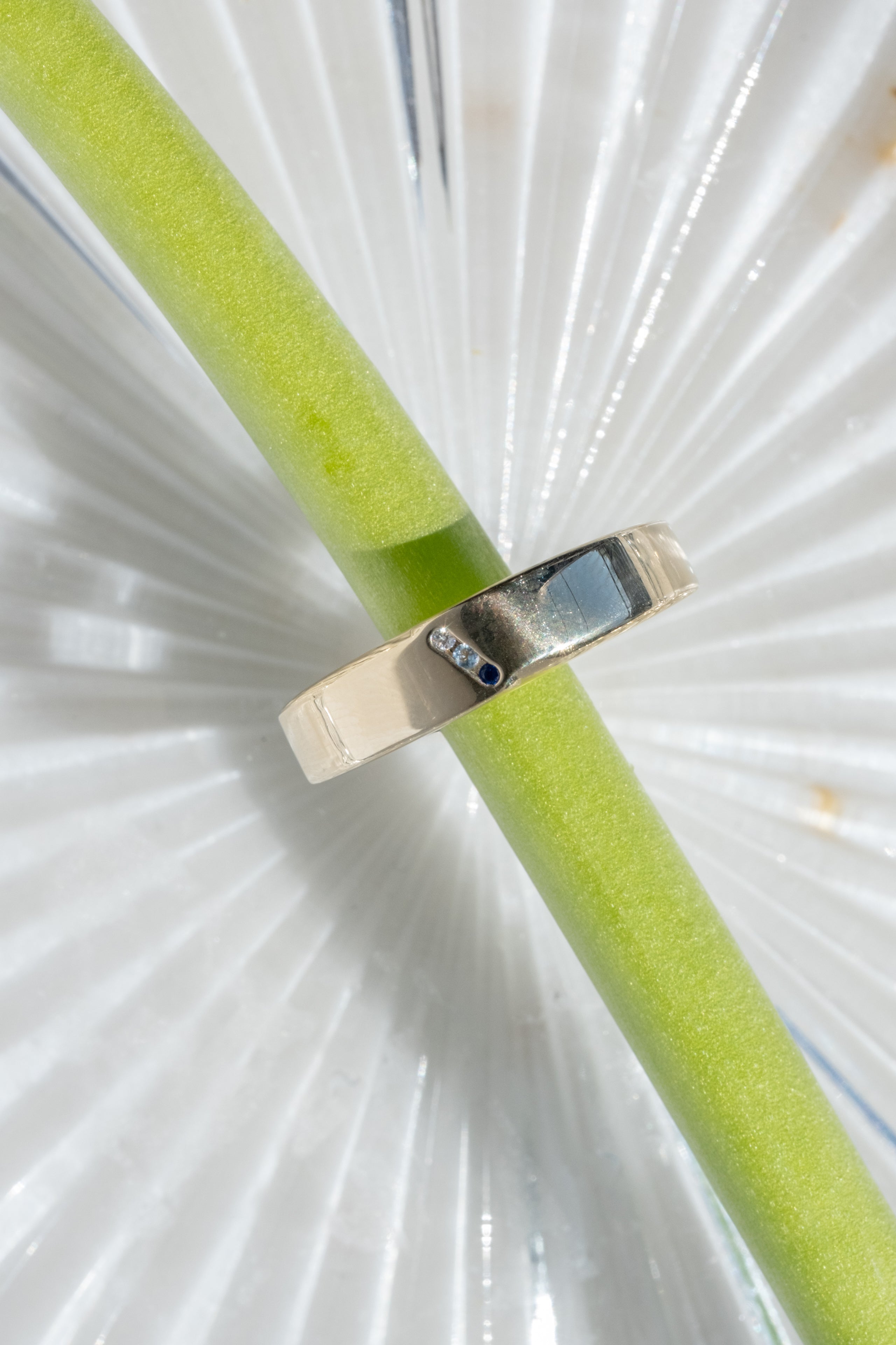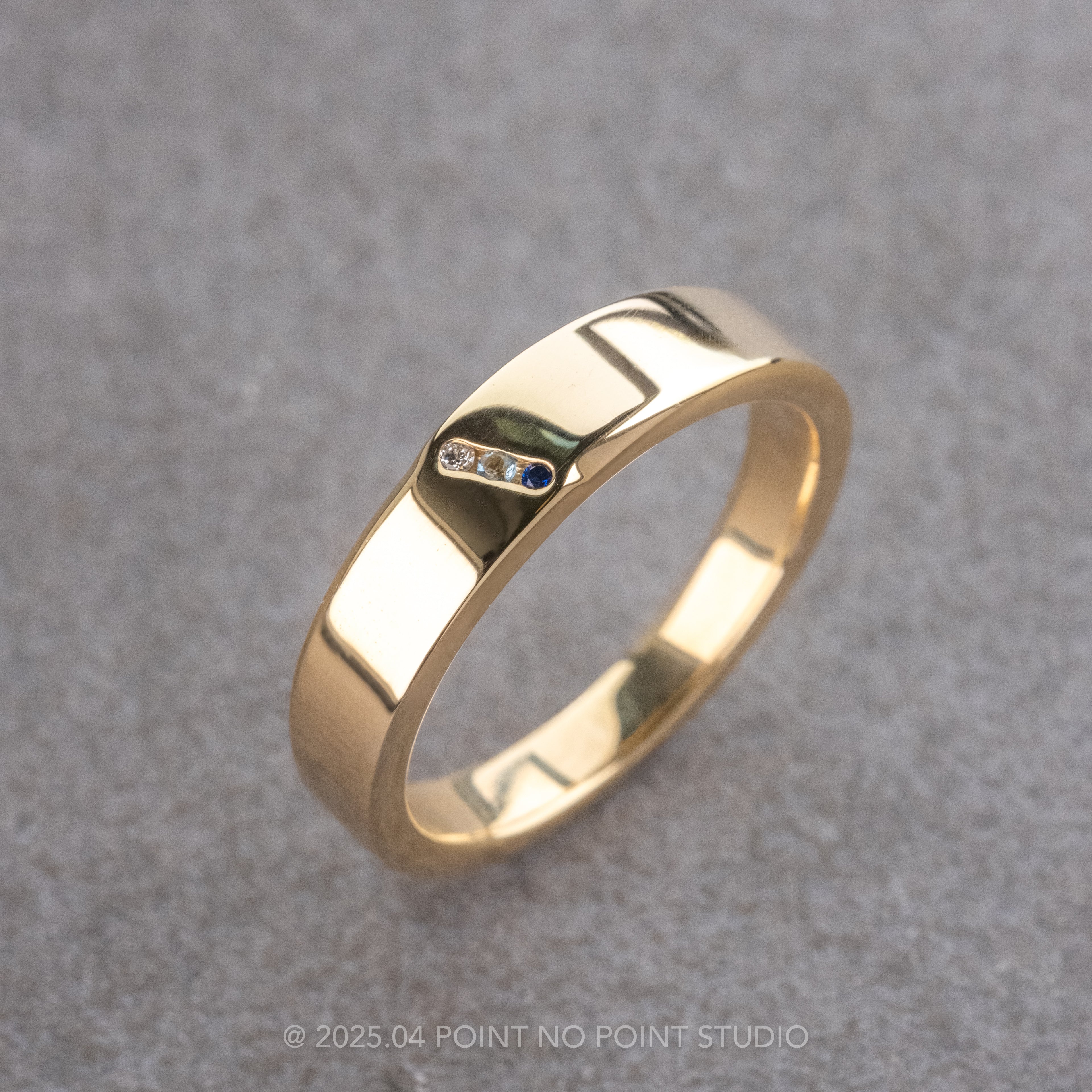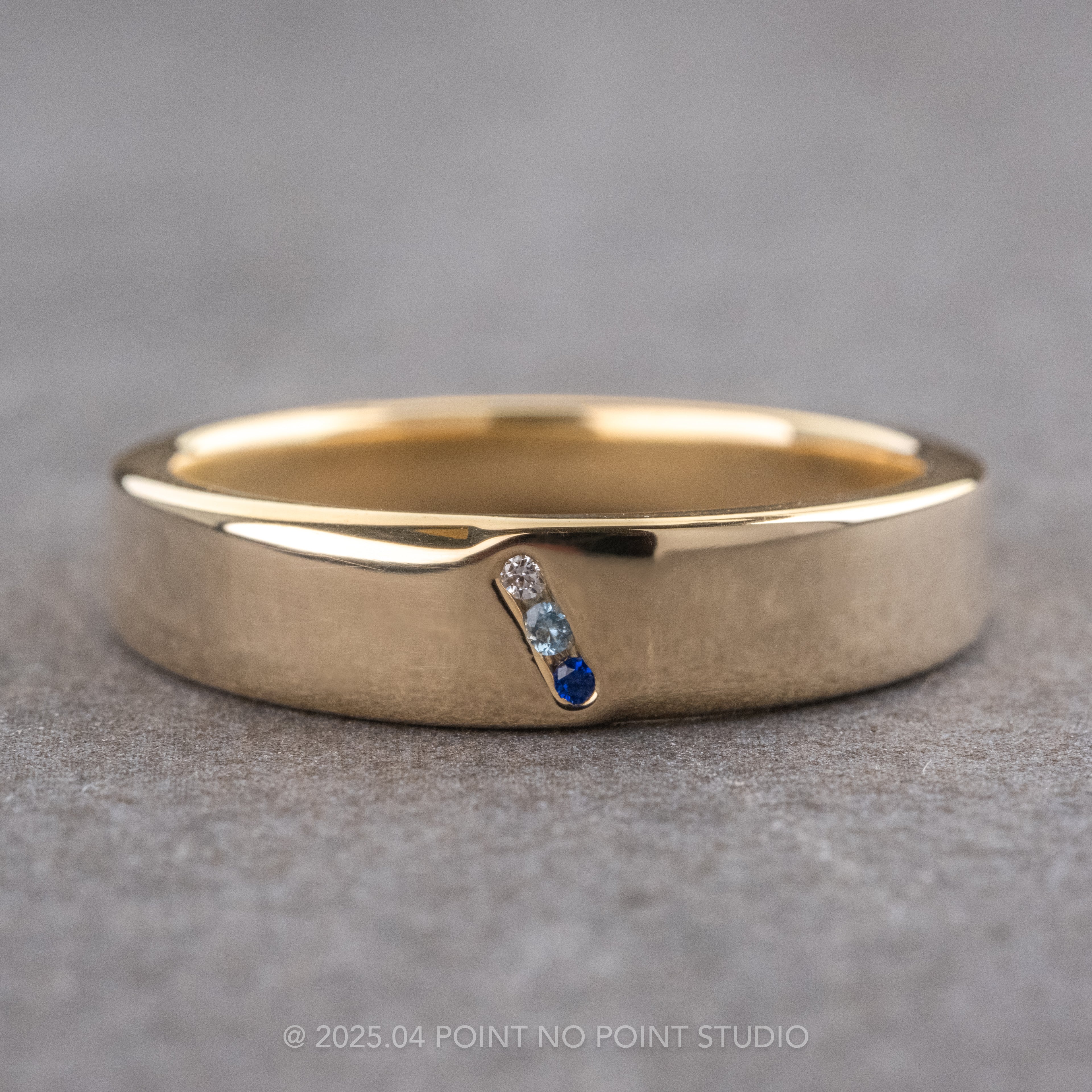 This customer wanted to create a truly unique men's band. They were inspired by one of our signet ring designs and wanted to include the birthstones of each of their loved ones in a beautiful gradient. The wave detail in the band follows the angle of the channel set stones. The tapered ring band has a high polished finish.