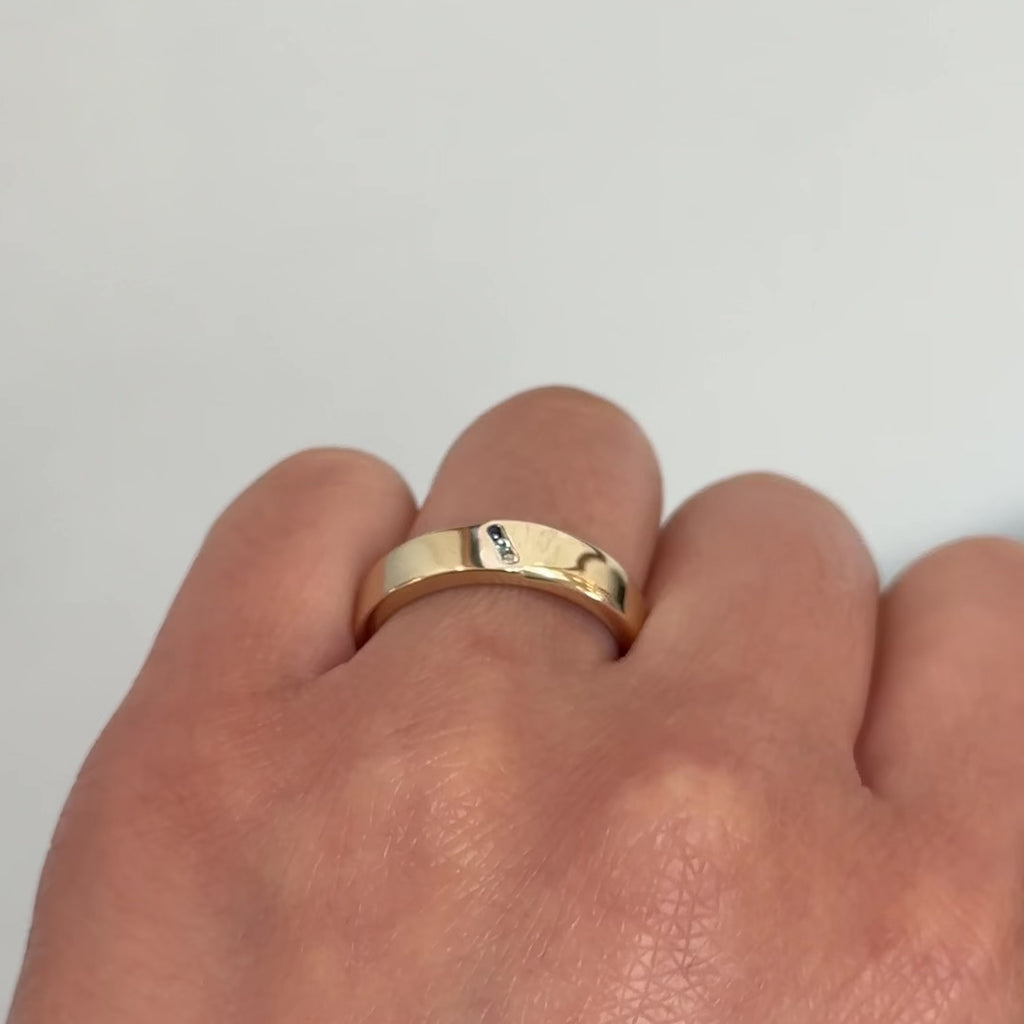 They opted for a standard fit band measuring approximately 5mm wide. The ring is made of recycled eco-friendly 14k yellow gold.