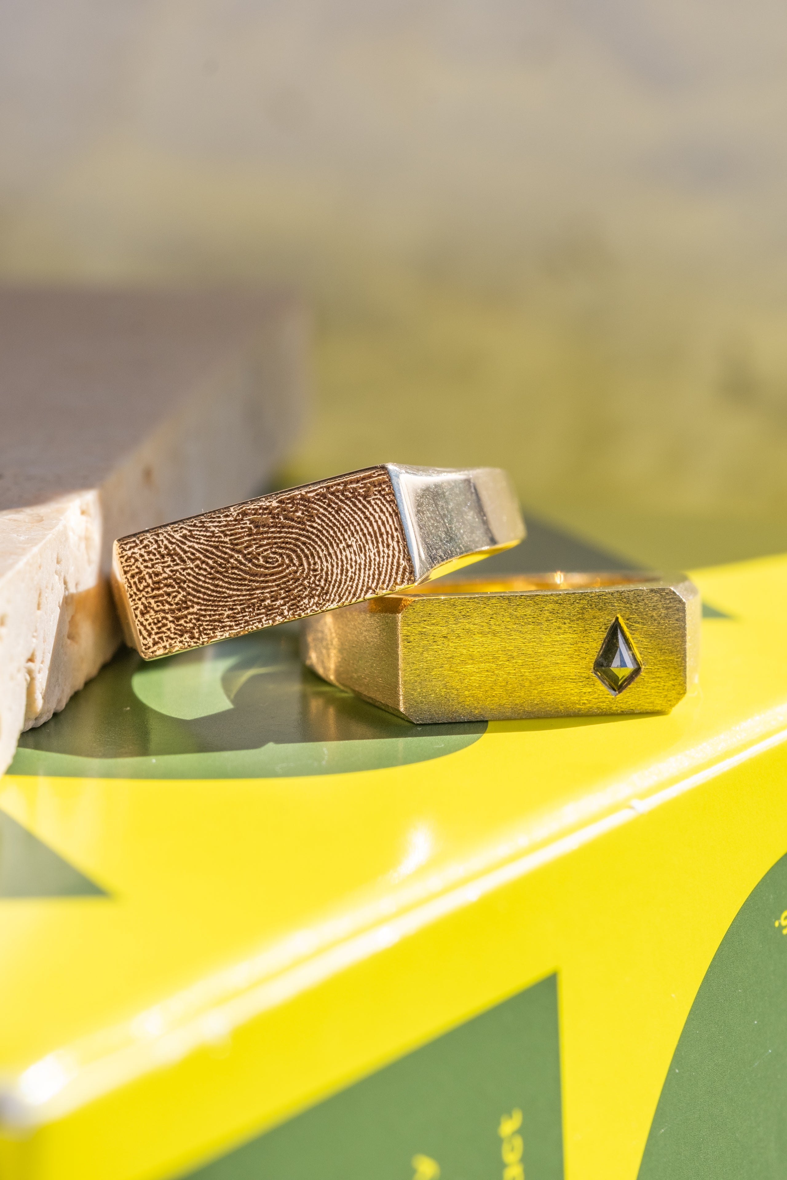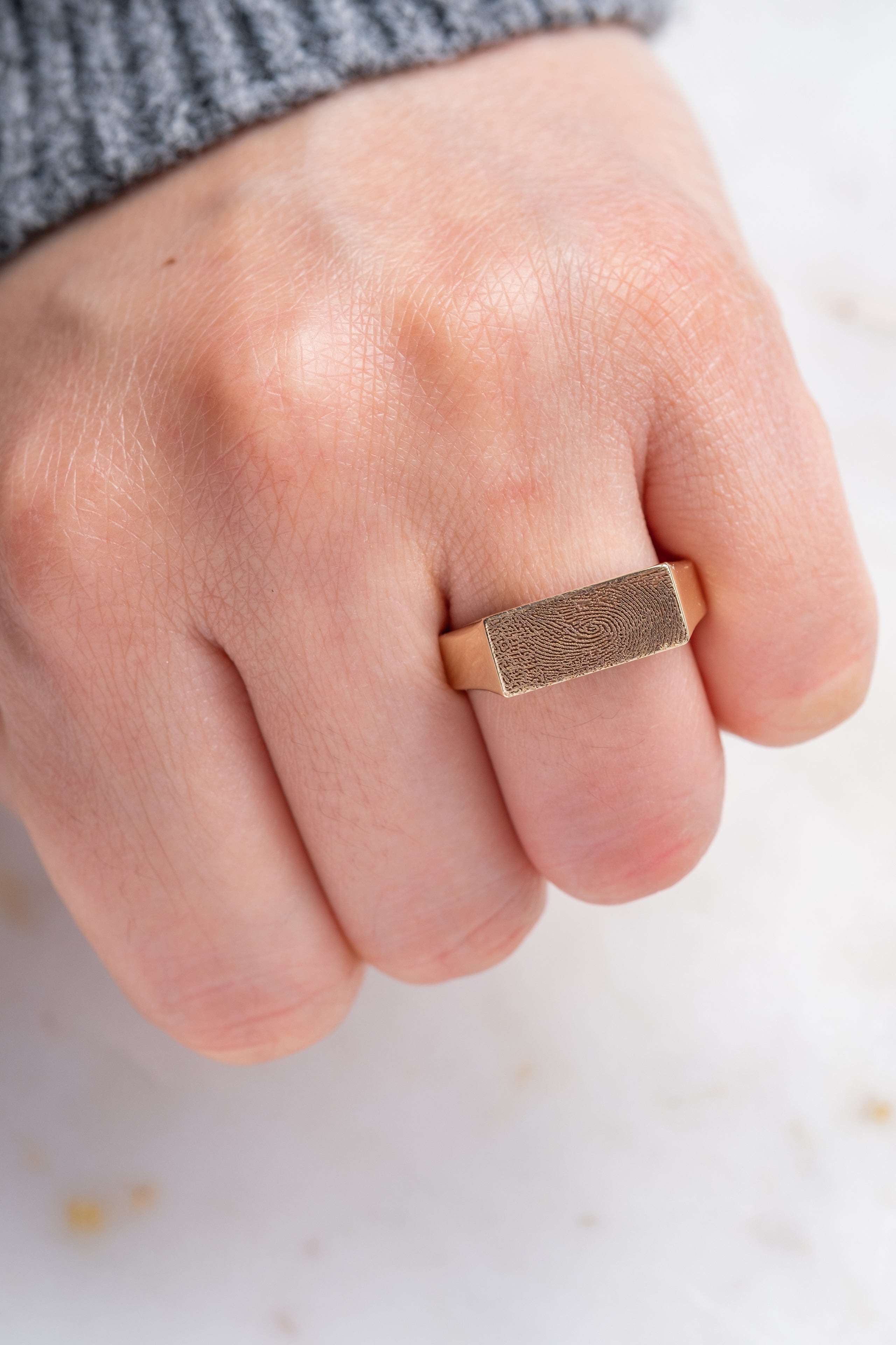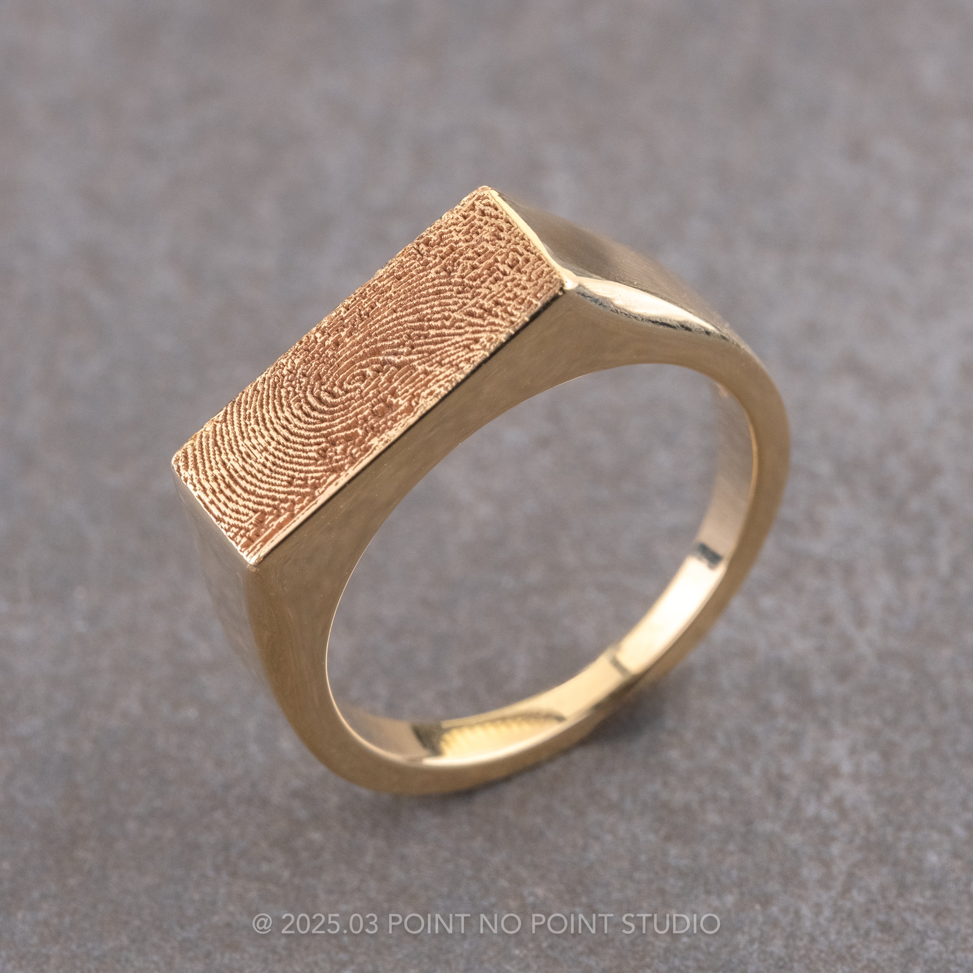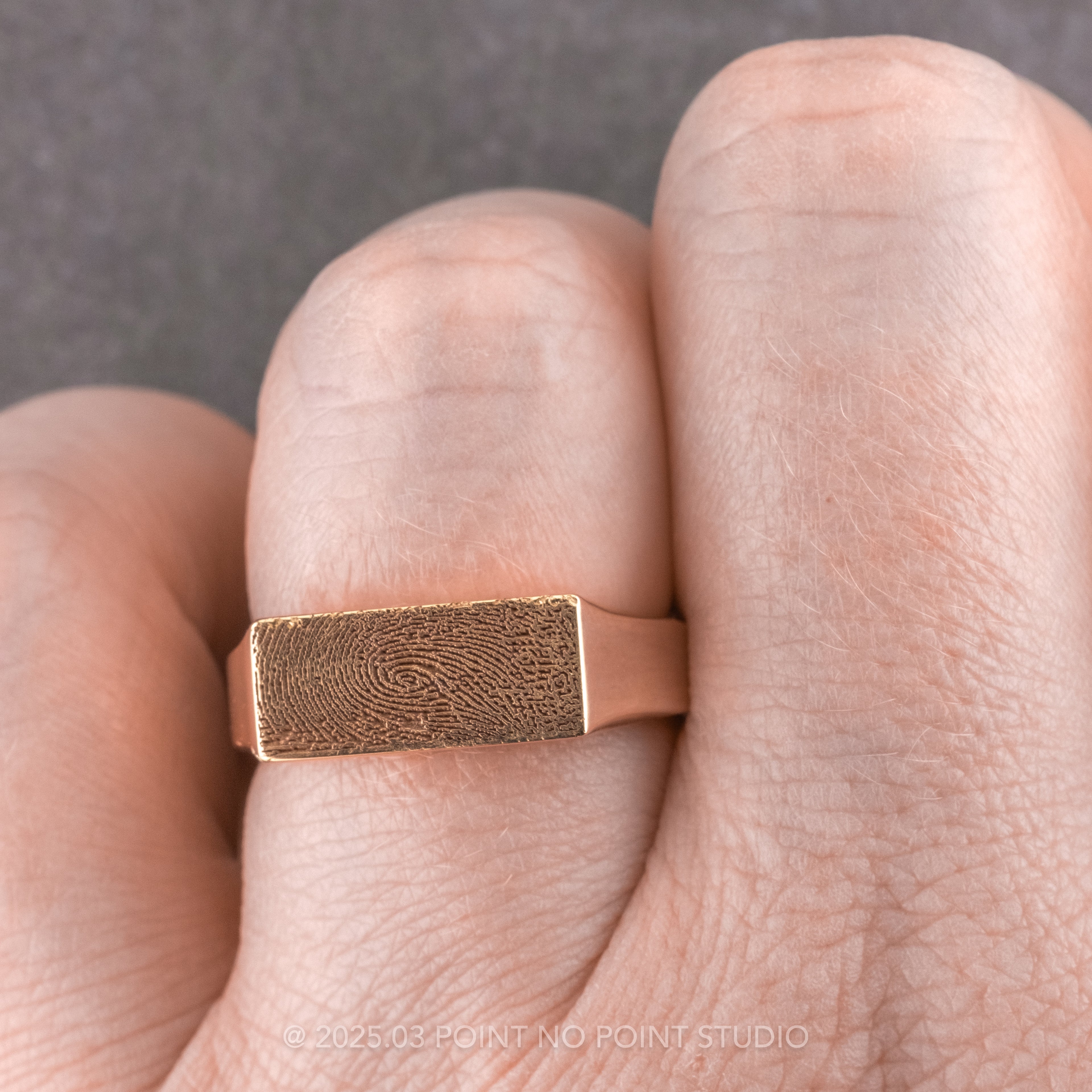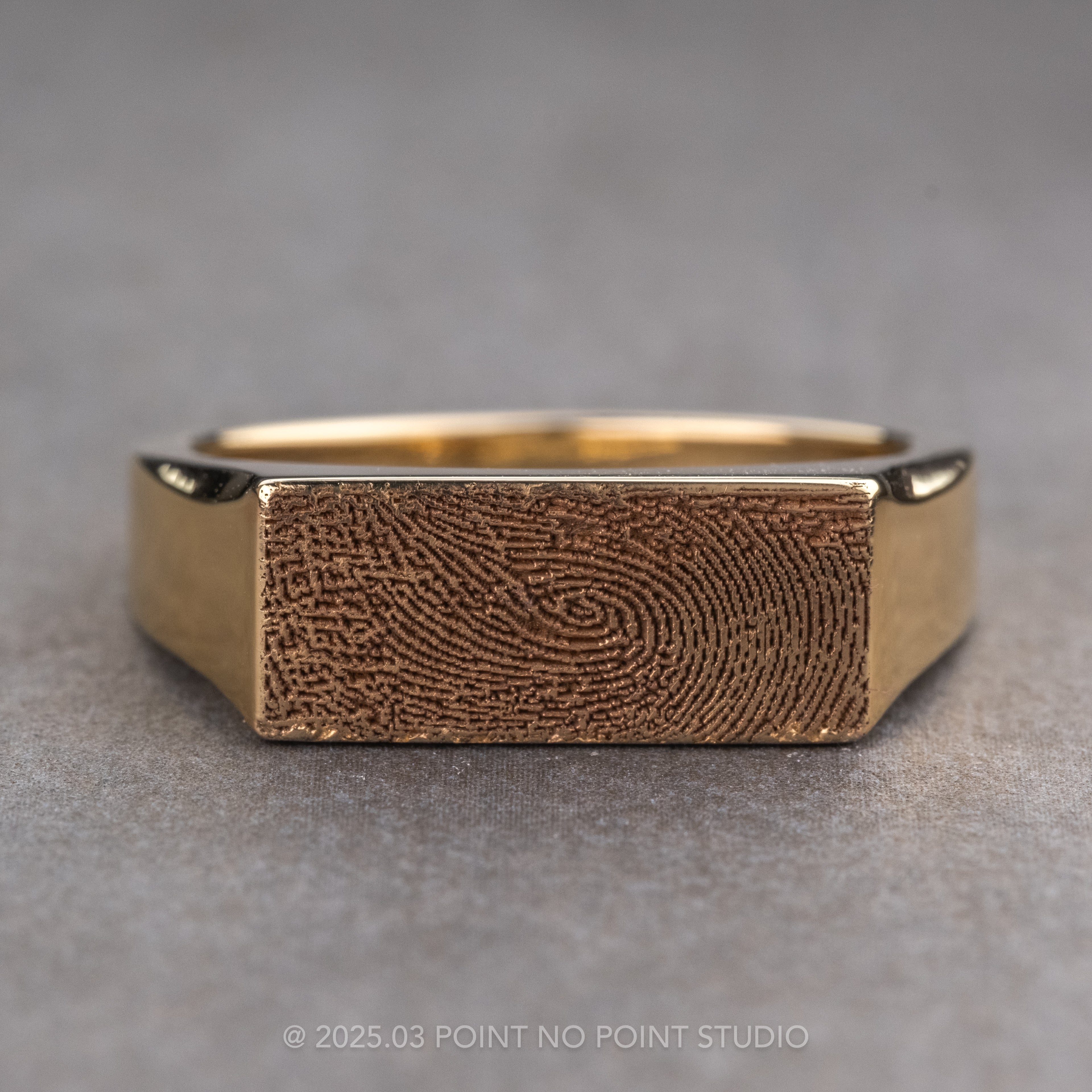 This customer wanted to create a truly unique men's wedding band. They were inspired by their loved one themselves and wanted to make them truly apart of this ring. In this design, our customer sent us a clear image of the fingerprint they wanted engraved on the face of the signet and we got right to work! The tapered ring band has a high polished finish.