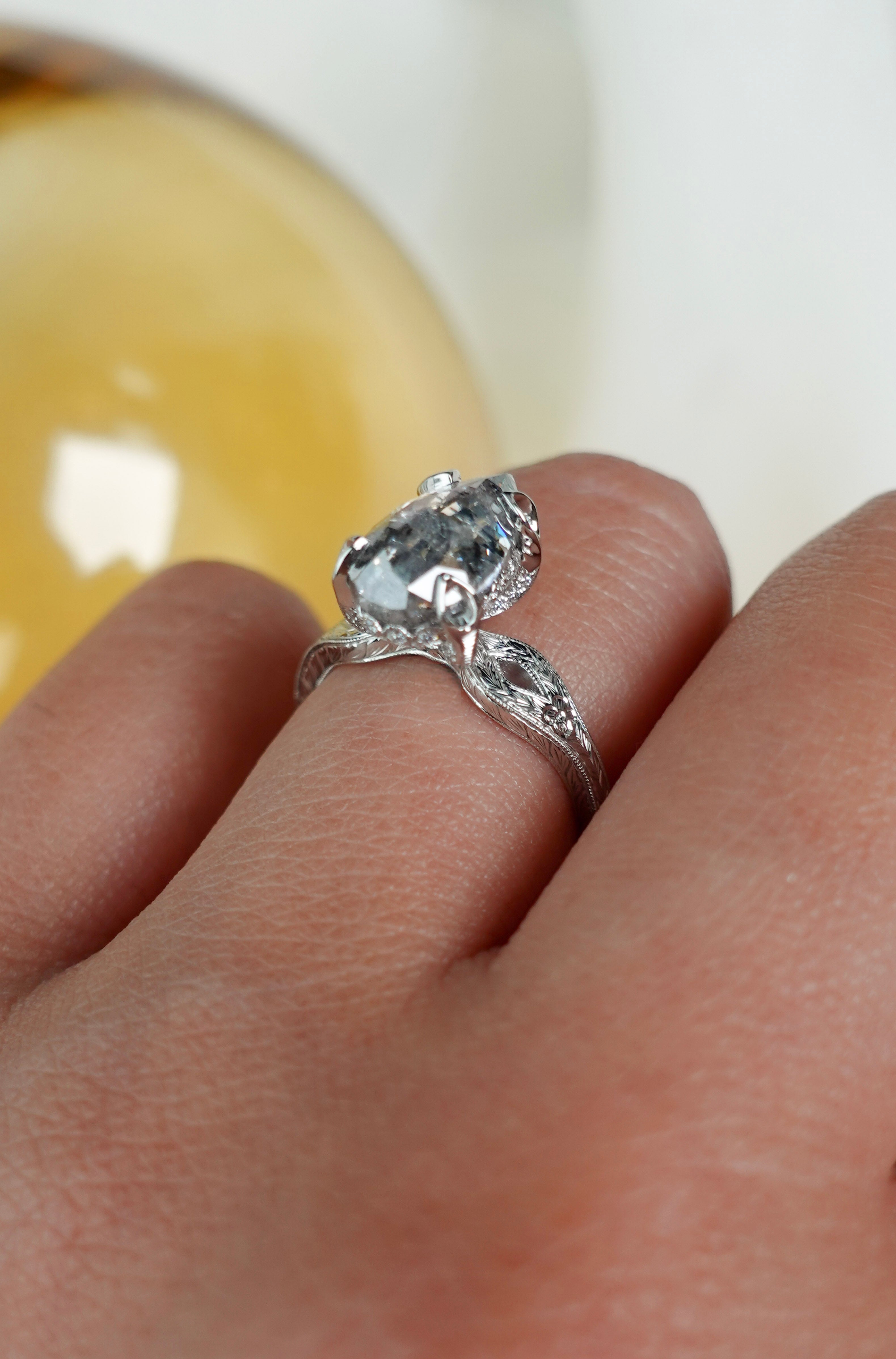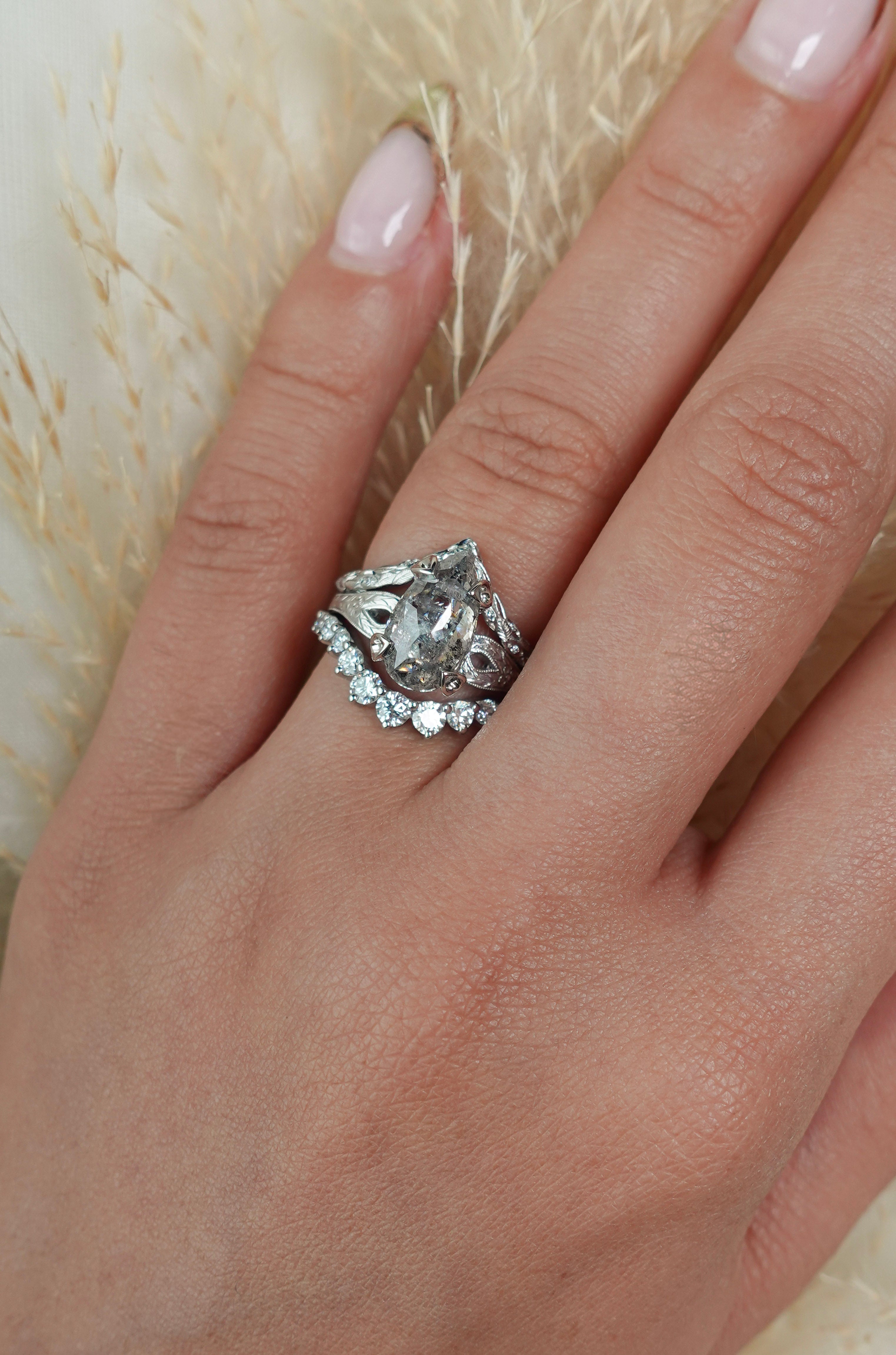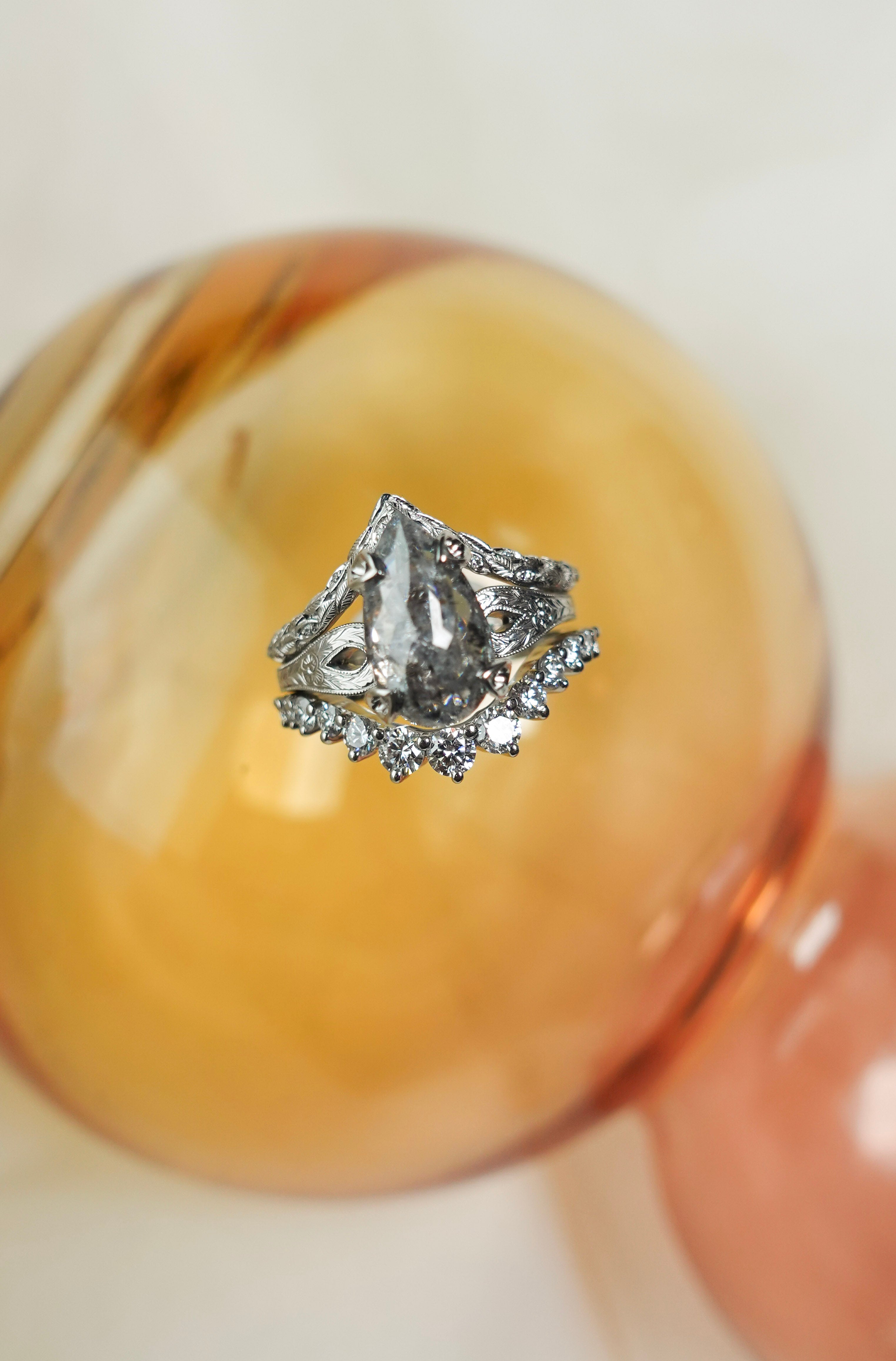 The Faye features hand engraved details, tiny accent diamonds and milgrain detailing with a central 2.01ct salt and pepper pear diamond.
