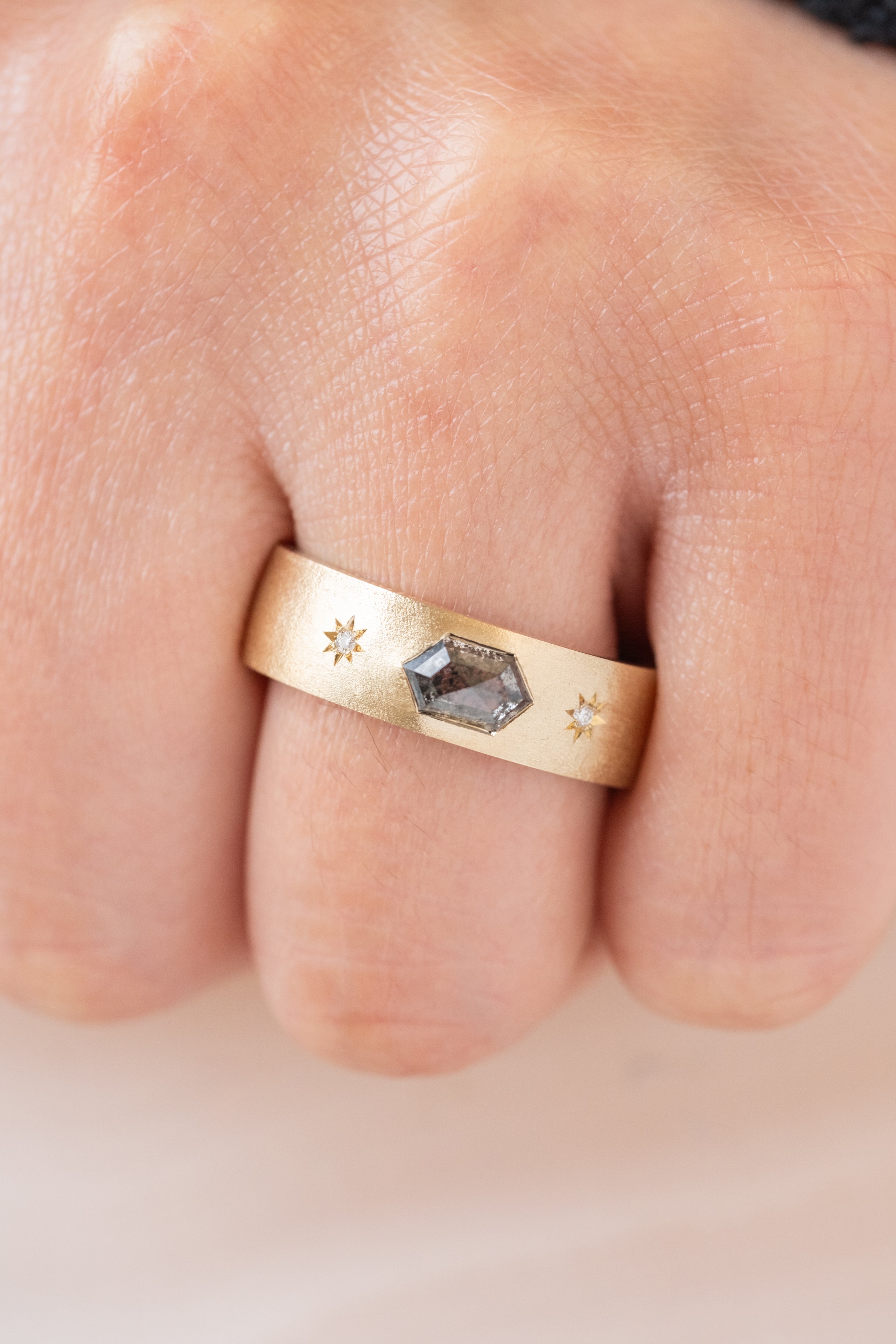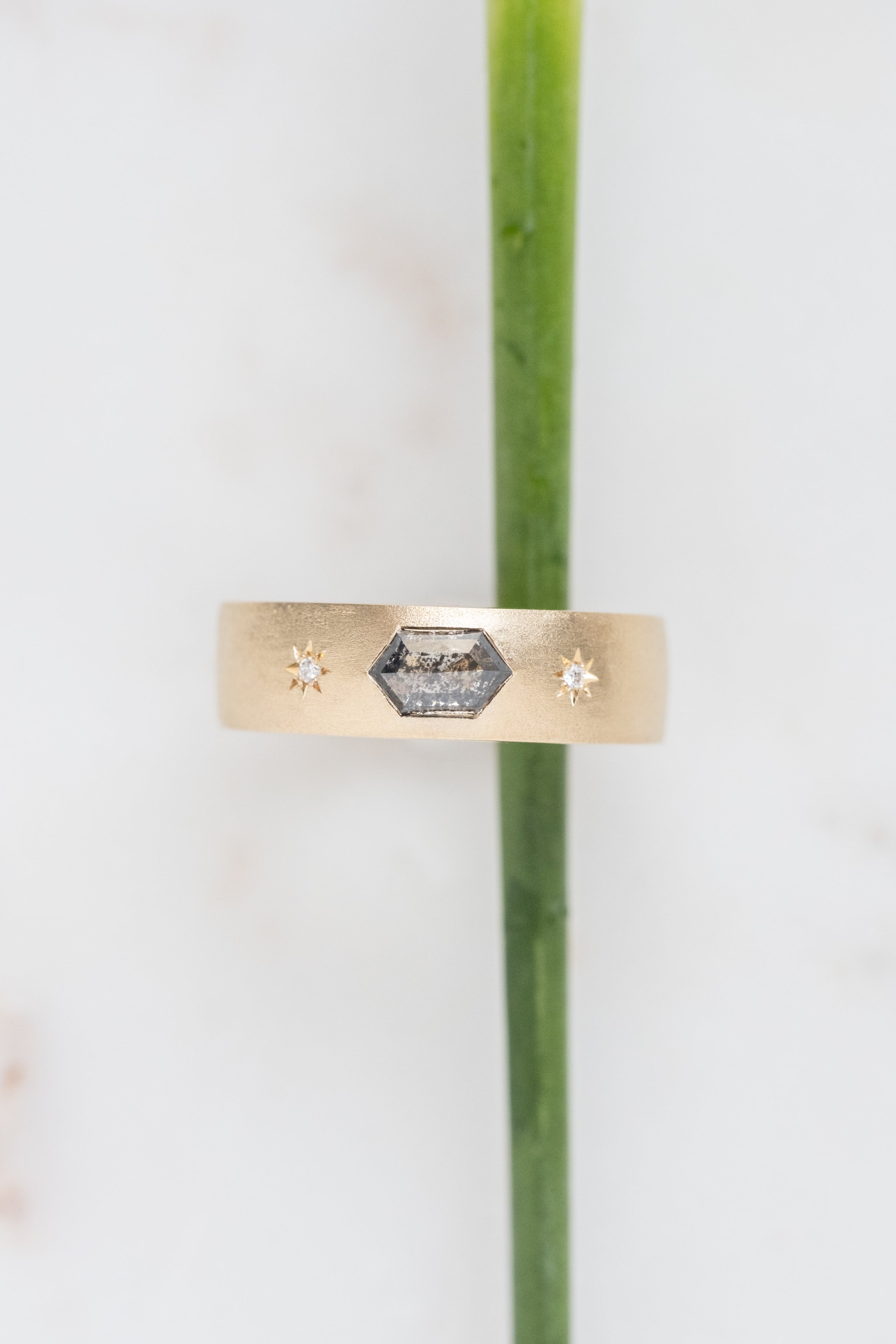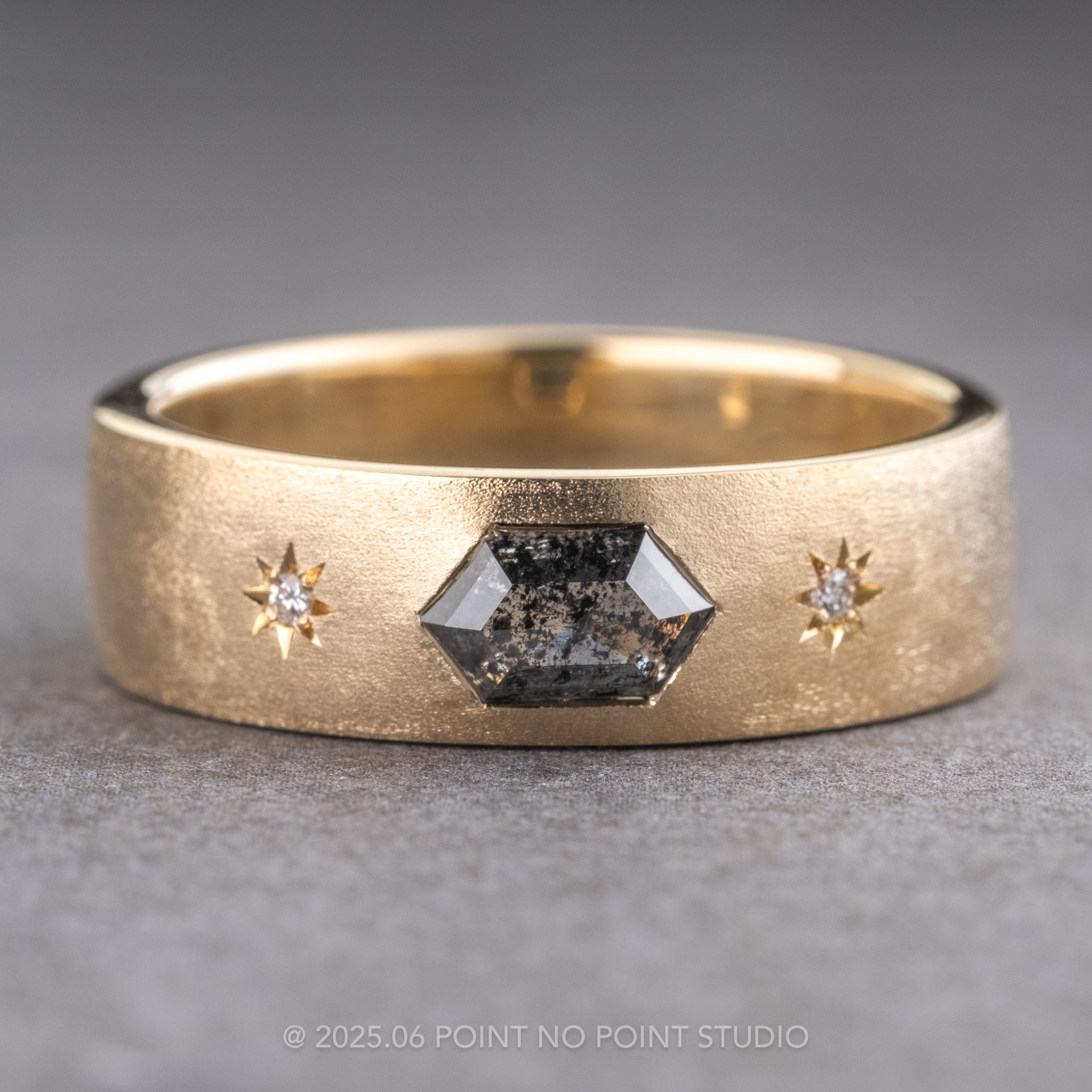 Our customer really loved a hexagon band, but really wanted a little something more that tied their significant other's ring with theirs .They selected a stunning salt and pepper hexagon diamond set flush into the center of the band and oriented horizontally. On either side of the hexagon is a stunning GHSI round diamond star set into the band. This ring is about 6.5 in band width, brushed matte for that perfectly aged look. The entire ring is made of recycled 14k yellow gold.