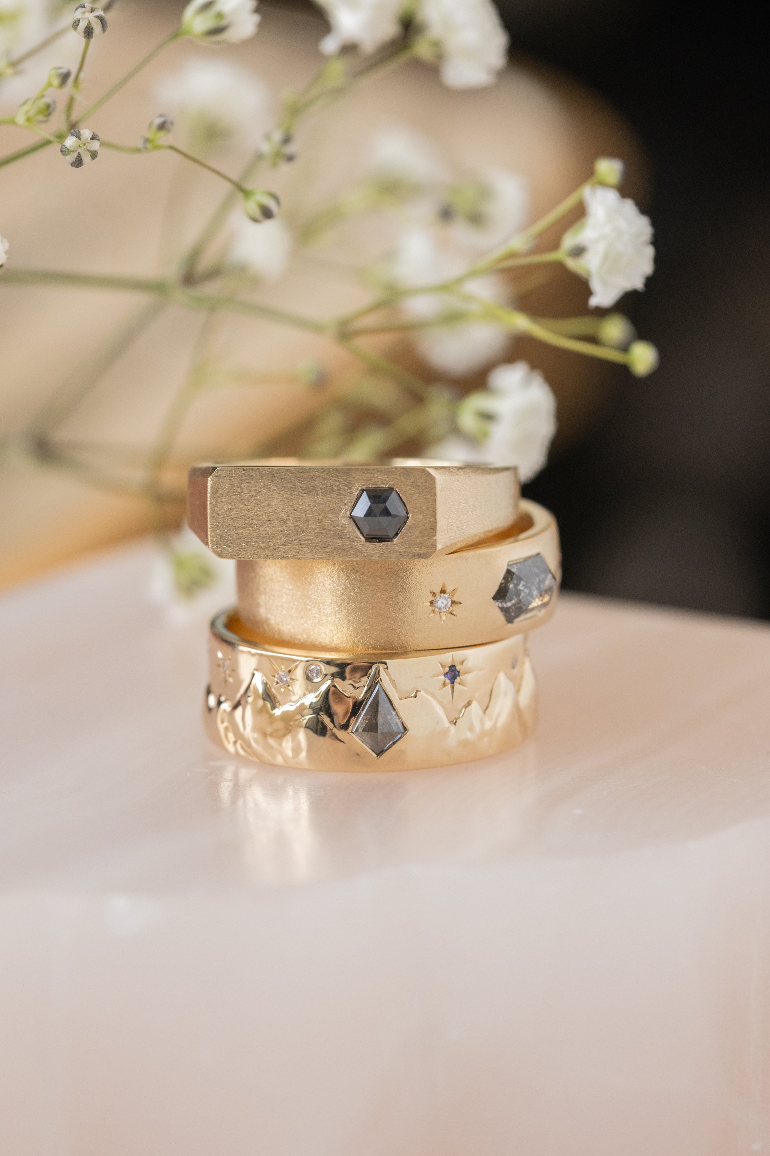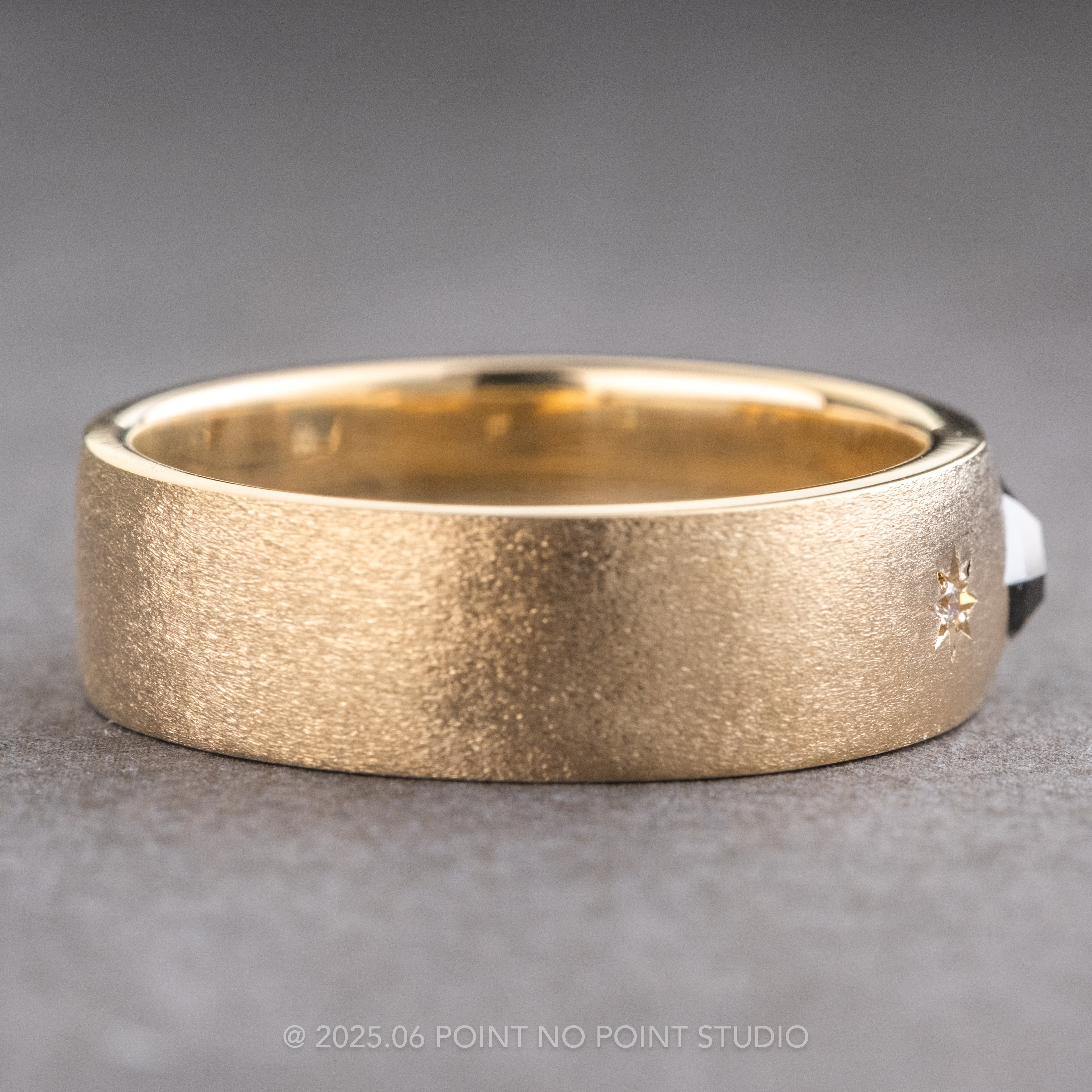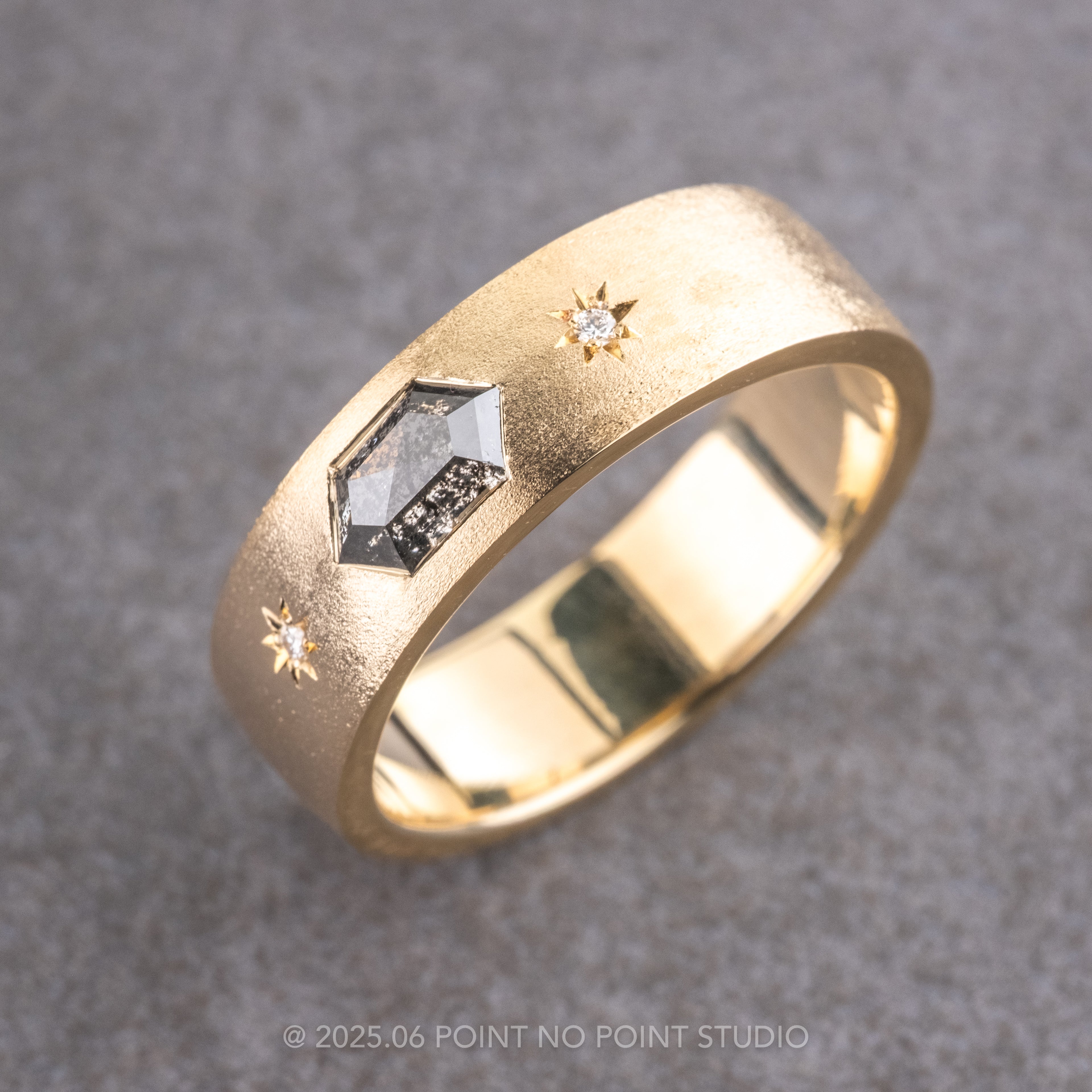 Our customer really loved a hexagon band, but really wanted a little something more that tied their significant other's ring with theirs .They selected a stunning salt and pepper hexagon diamond set flush into the center of the band and oriented horizontally. On either side of the hexagon is a stunning GHSI round diamond star set into the band. This ring is about 6.5 in band width, brushed matte for that perfectly aged look. The entire ring is made of recycled 14k yellow gold.