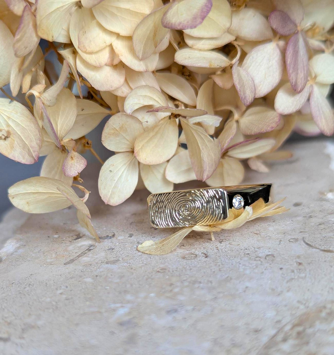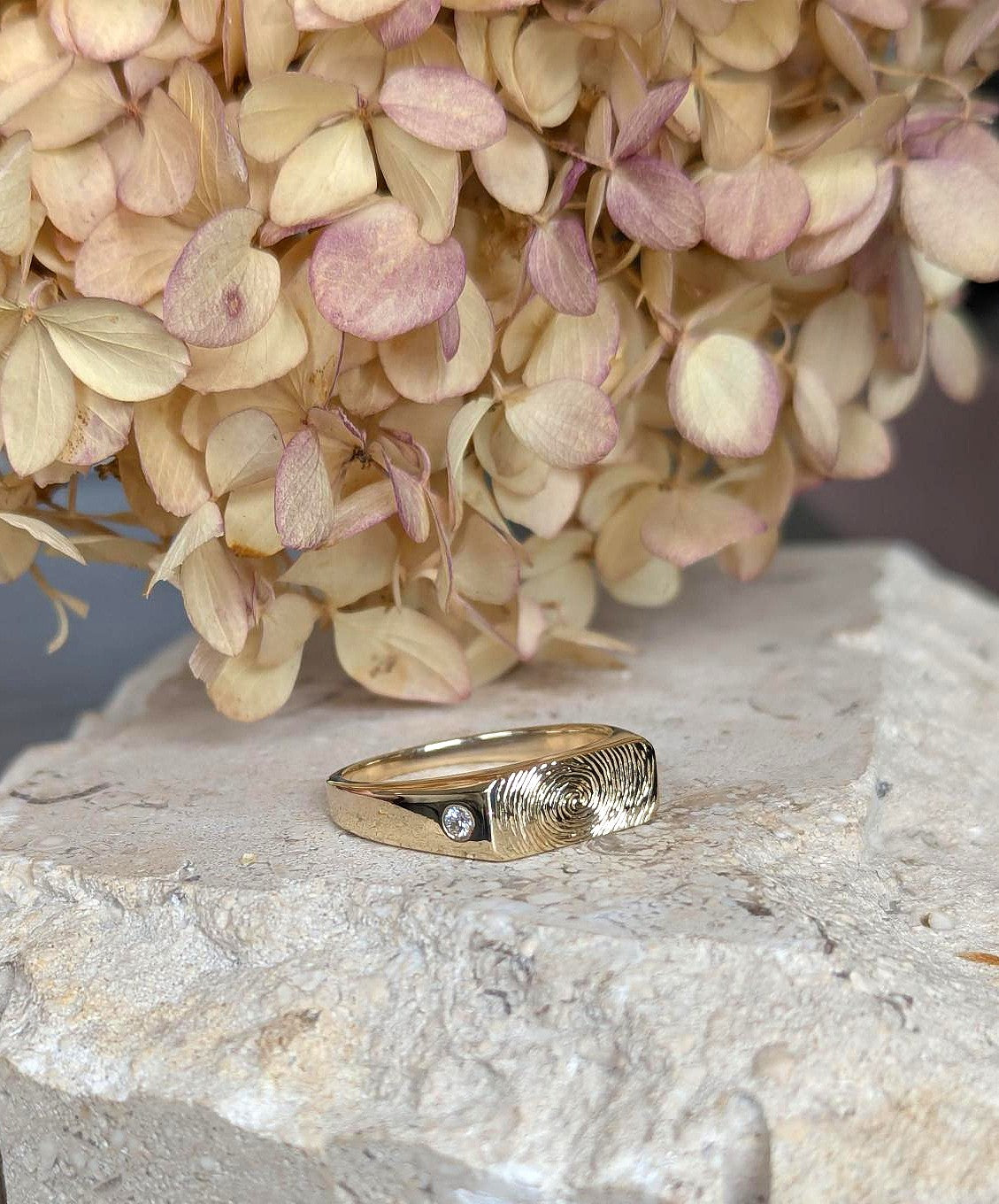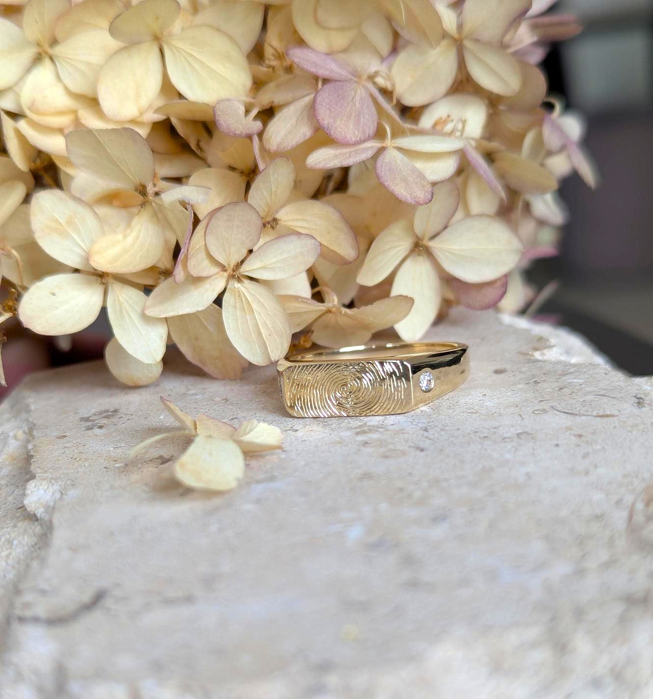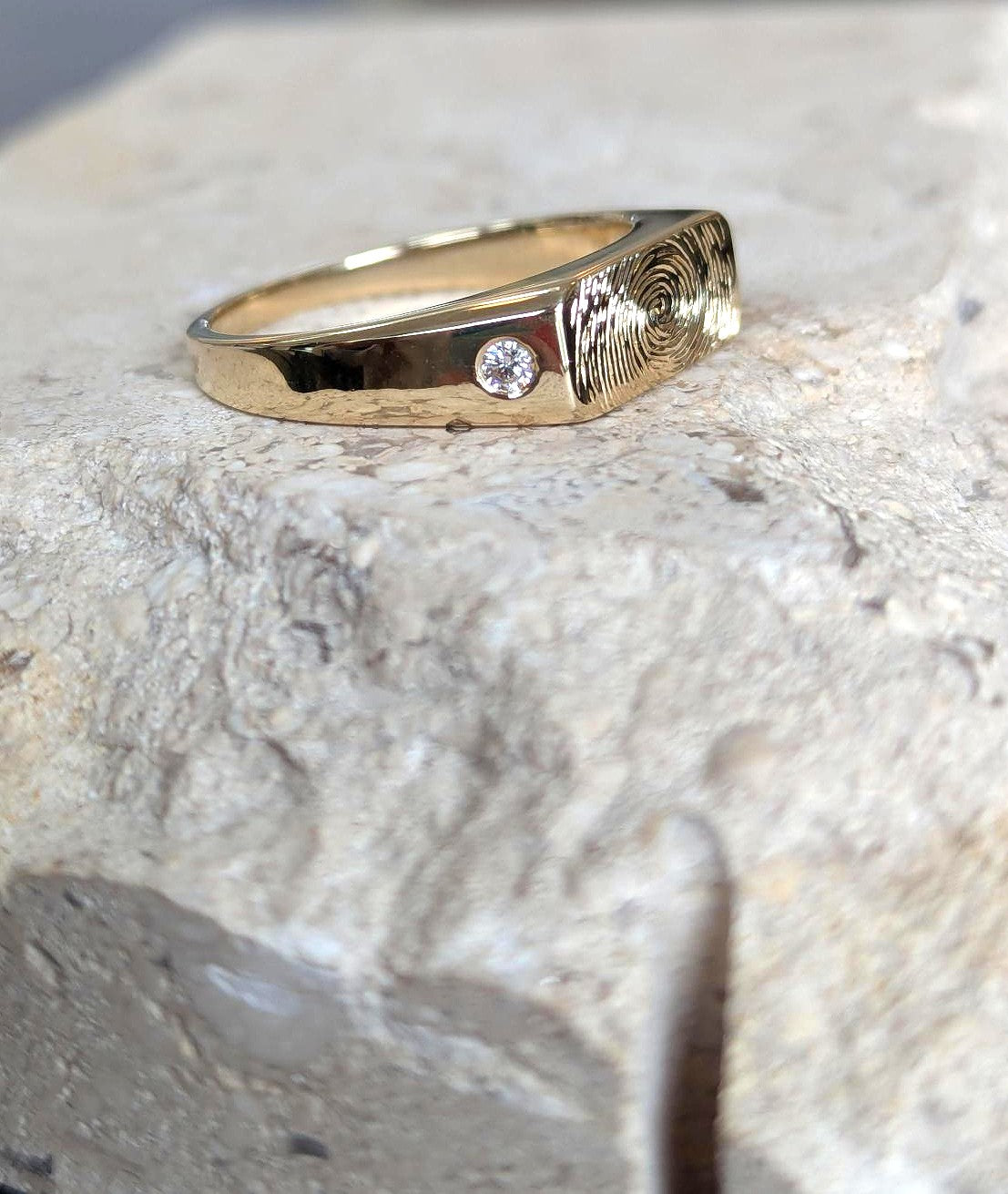 This couple wanted a custom fingerprint signet ring with diamonds on each side of the tapered band!