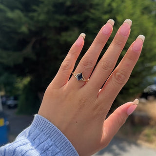 The kite has been set in a 4 prong basket setting, which allows you to see and admire the unique inner structure, tones of the sapphire. The entire ring is made out of eco friendly recycled 14k yellow gold with a round split shank measuring 1.7mm wide. The setting for the kite sits raised off the finger.