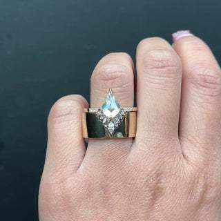 This timeless and unique engagement ring features a striking 2 carat kite moissanite. The backplate for the moissanite has a window opening that allows light to illuminate through beautifully! The center kite sits on top of a gorgeous half-halo of GH-SI diamonds in varying shapes with a marquise focal point, followed by 3 brilliant cut accent diamonds set into the band on either side.