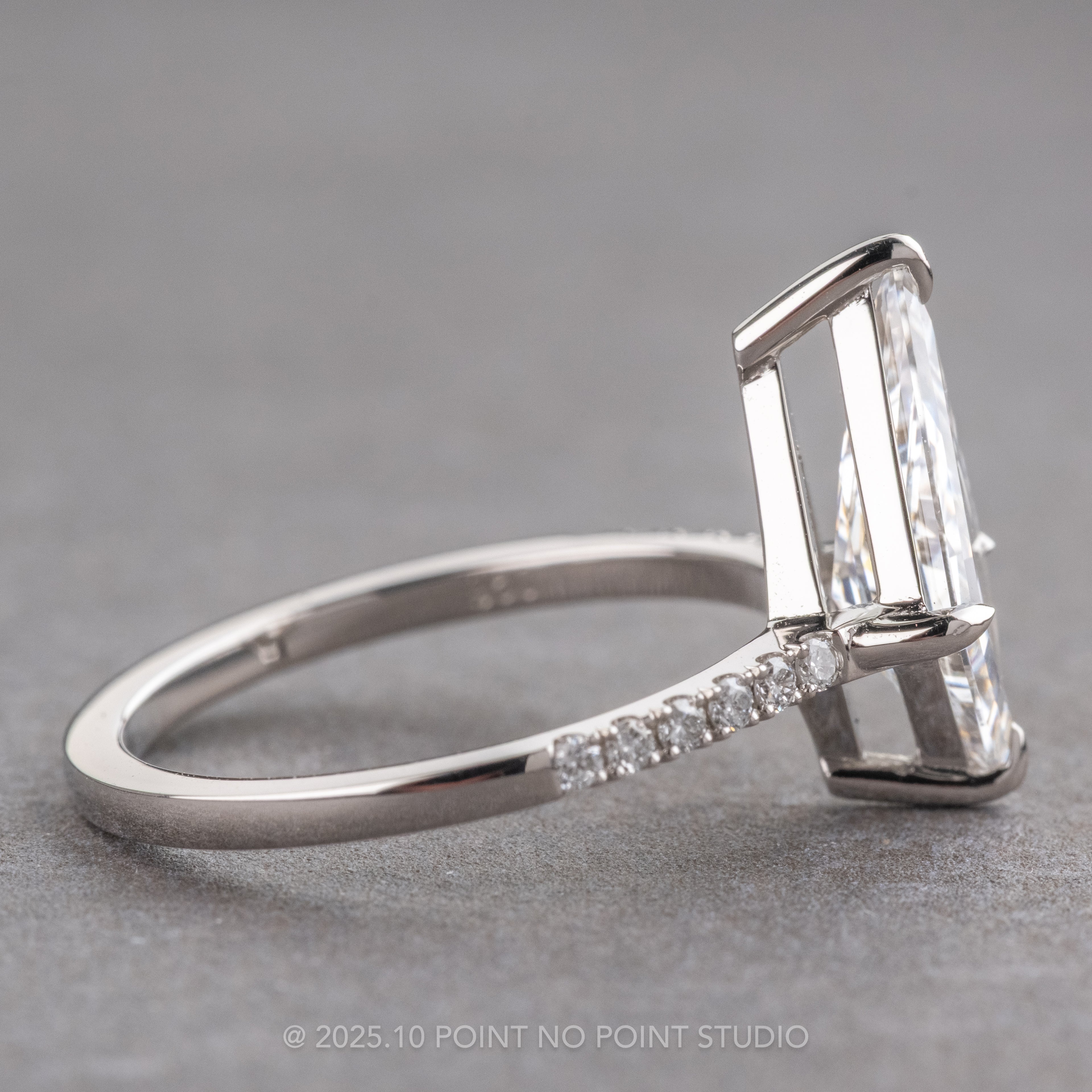 This captivating lab diamond engagement ring is a stunner! The ring features a top quality step cut kite shaped lab diamond; it is completely translucent and catches the light beautifully! The center stone is flanked by six sparkly GHSI white round accent lab diamonds down each side of the band to complete the look.