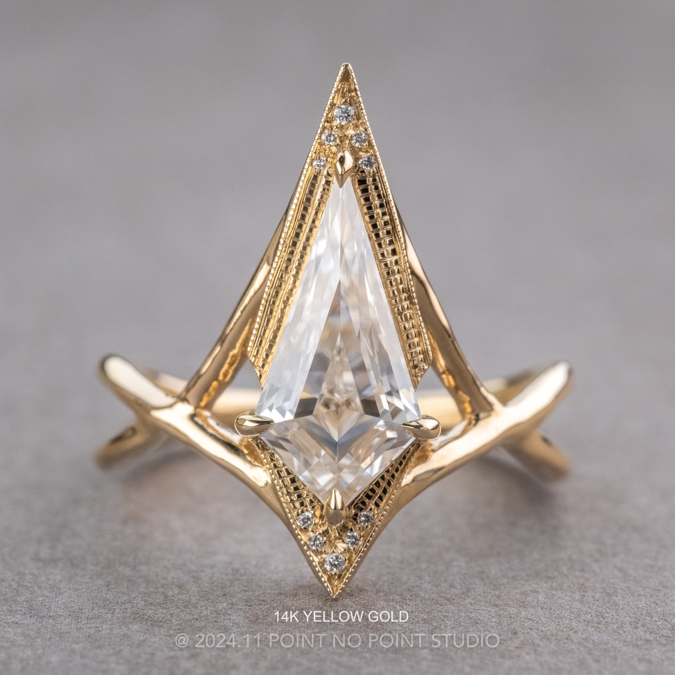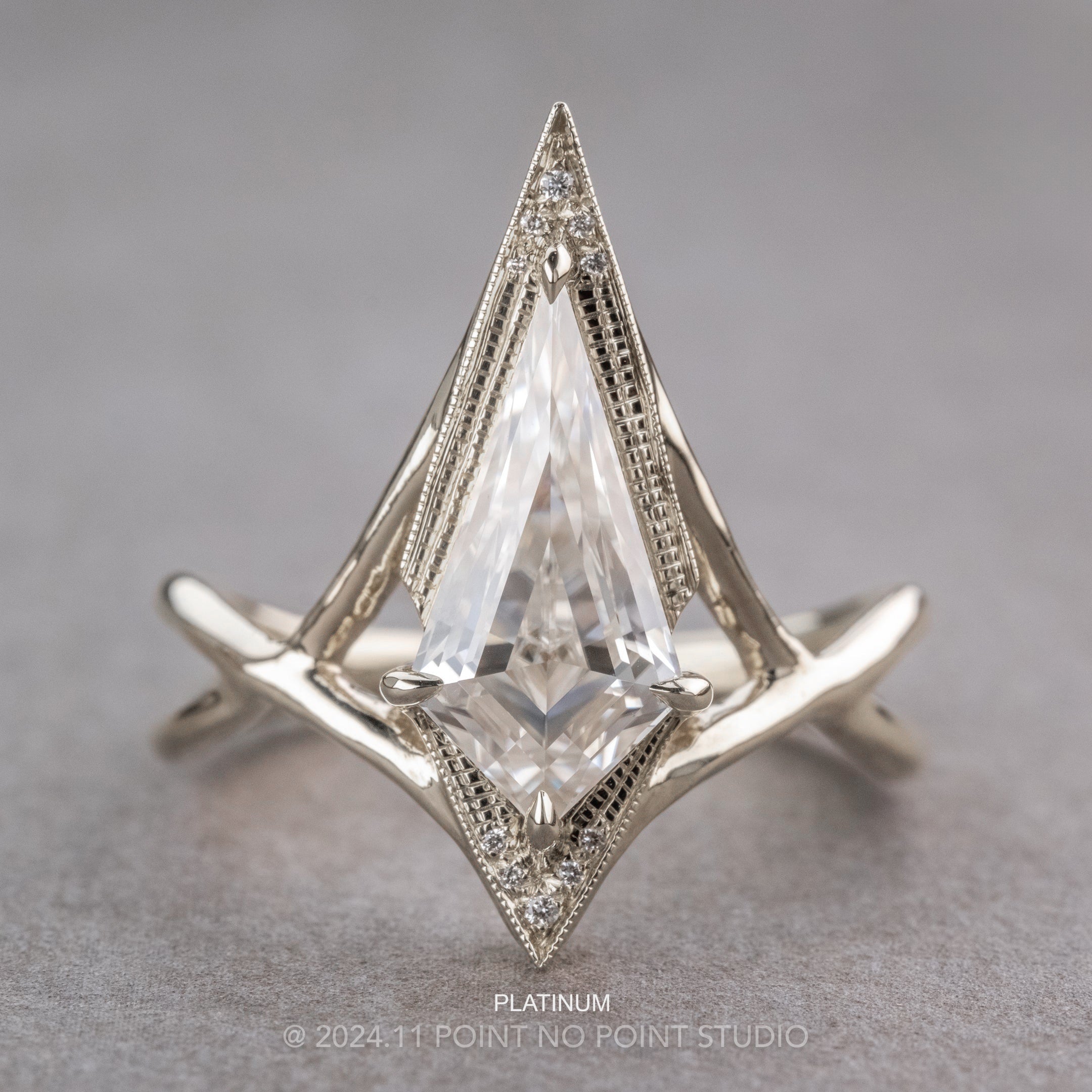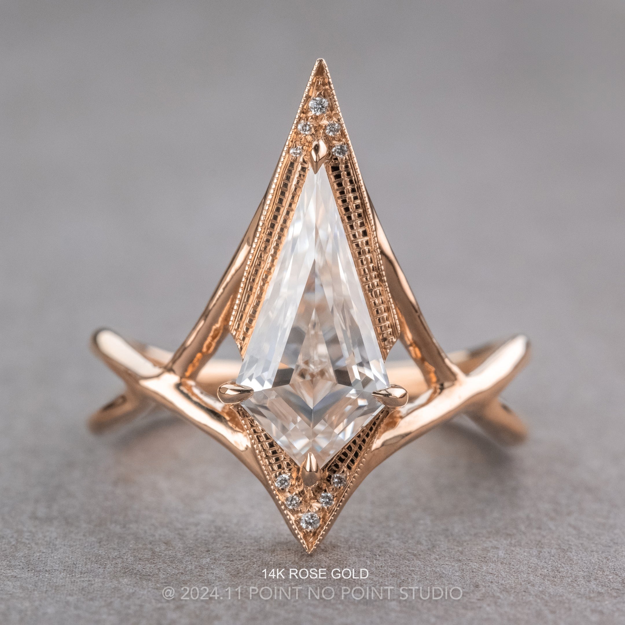 This magical ring features a stunning kite shaped step cut moissanite. The kite is set into an open back setting to allow the light to shine through the stone. The setting has hand engraved milgrain around the sparkly GHSI accent diamonds.