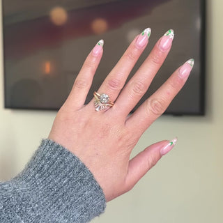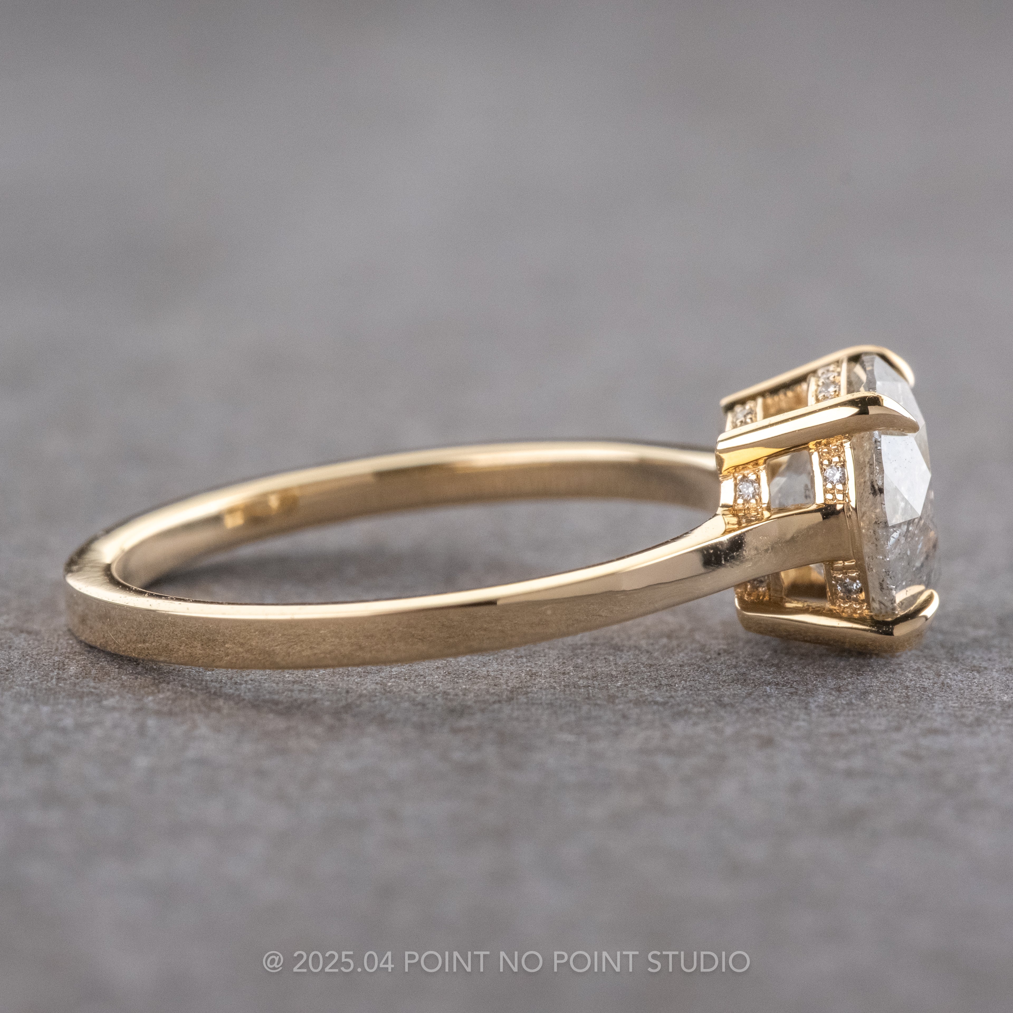 The entire ring is made of recycled 14k yellow gold with a ring band measuring 1.7mm wide. The diamond is secured by 4 prongs and set in a raised setting that combines elements of our basket and cathedral settings, showcasing the diamond's unique structure and tones.