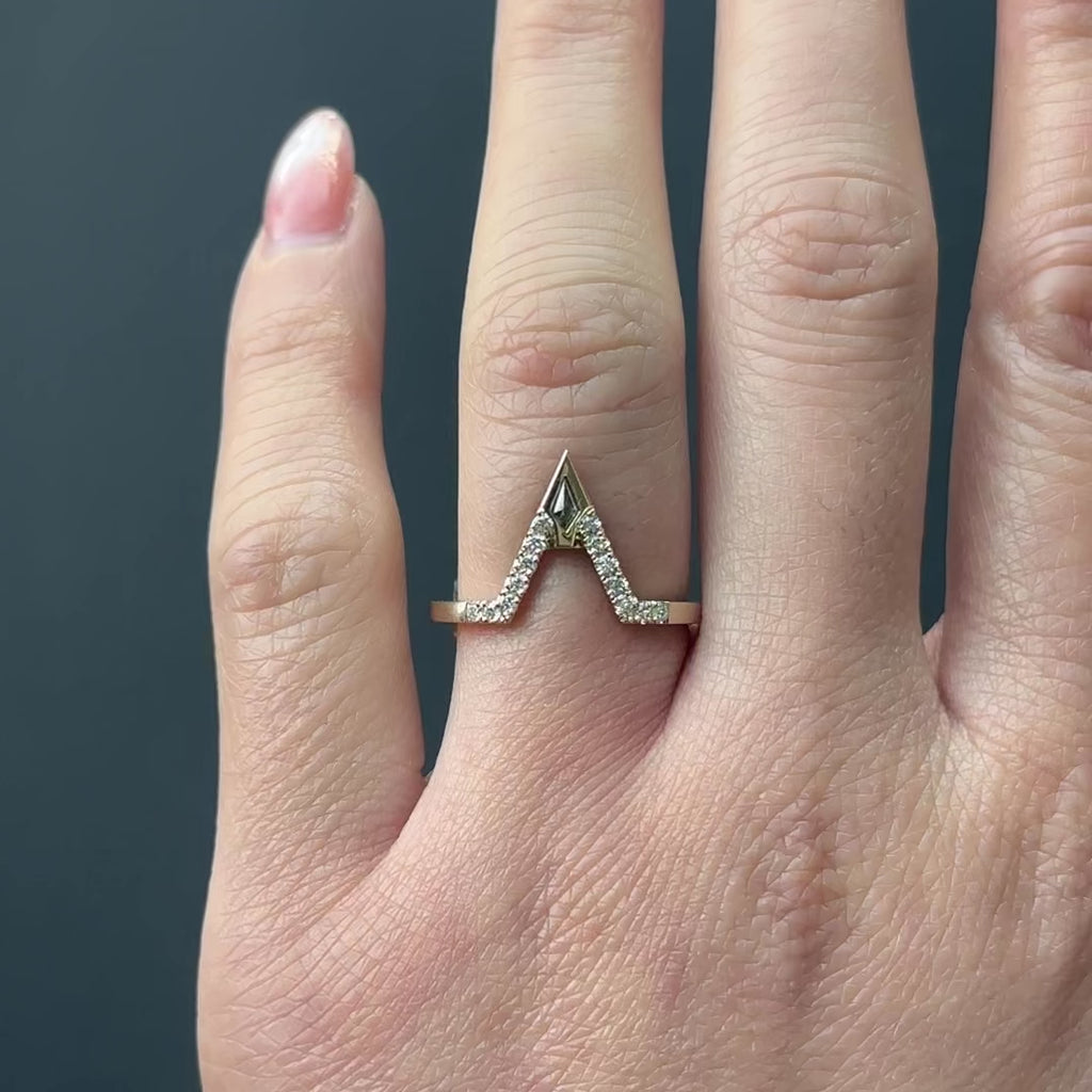 This timeless and unique wedding ring features a striking natural salt and pepper kite shaped diamond bezel set at the center of the v-shaped contour. The kite diamond is accented by dazzling white faceted diamonds set into the band.