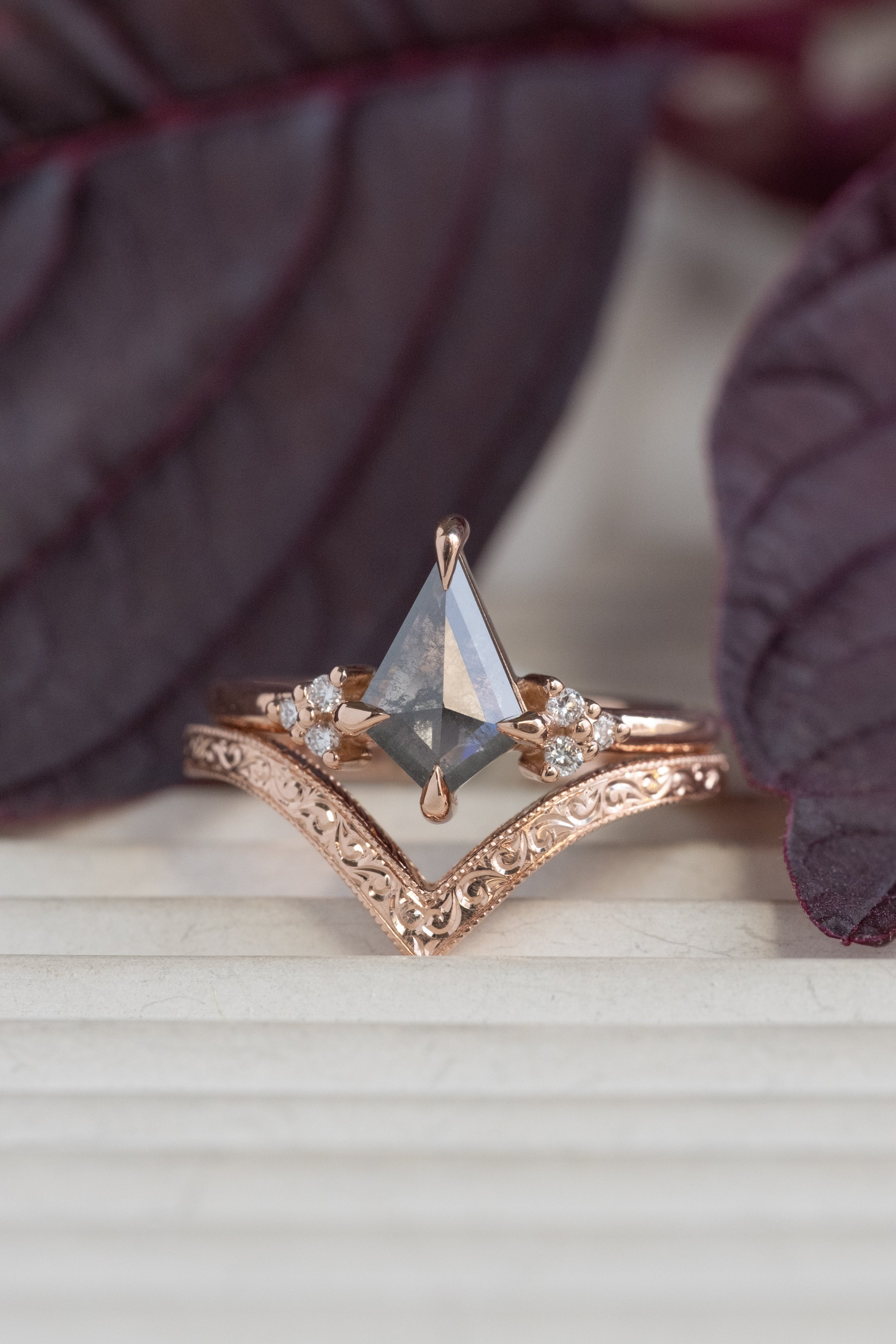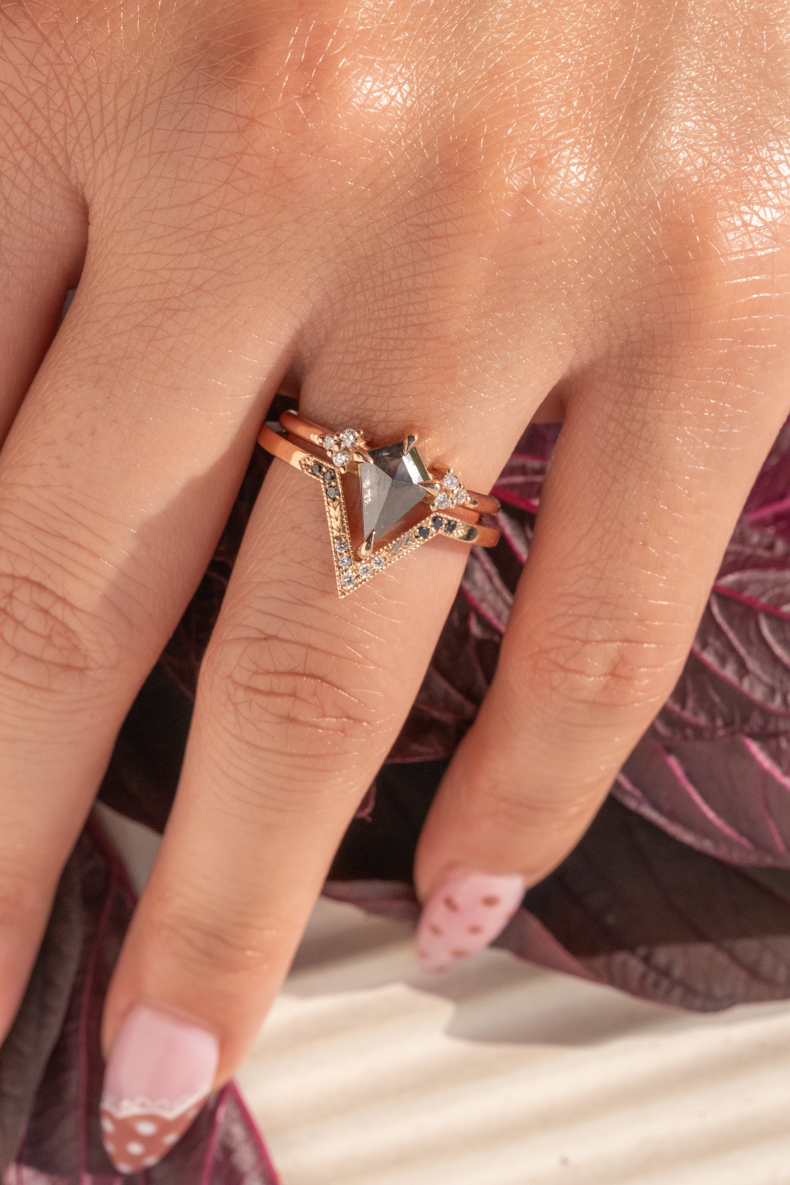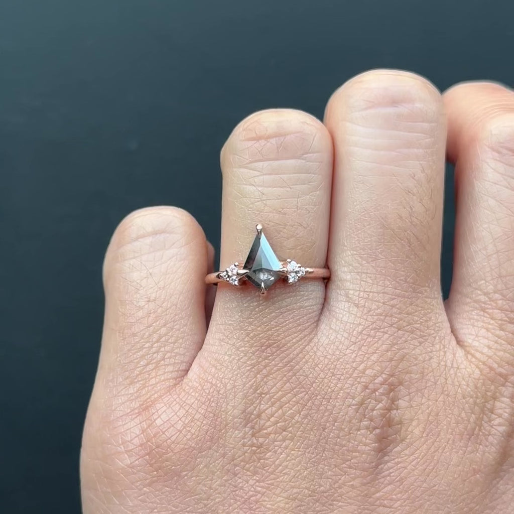 This beautiful and dainty ring features a salt and pepper kite rose cut diamond. The diamond is a top quality un-enhanced natural diamond; it is semi-translucent with unique tones and facets that catch the light. The kite diamond is flanked on either side by a cluster of sparkly GHSI white round accent diamonds that taper seamlessly into the band.