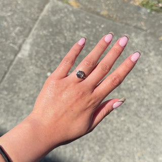 This engagement ring features a 1.93 carat semi-translucent salt and pepper speckled rose cut hexagon shaped diamond. The diamond is a top quality, all-natural stone that has not been heat treated or enhanced in any way. There are five sparkly GHSI white brilliant cut round accent diamonds set into the ring band on each side of the hexagon diamond for that extra sparkle!
