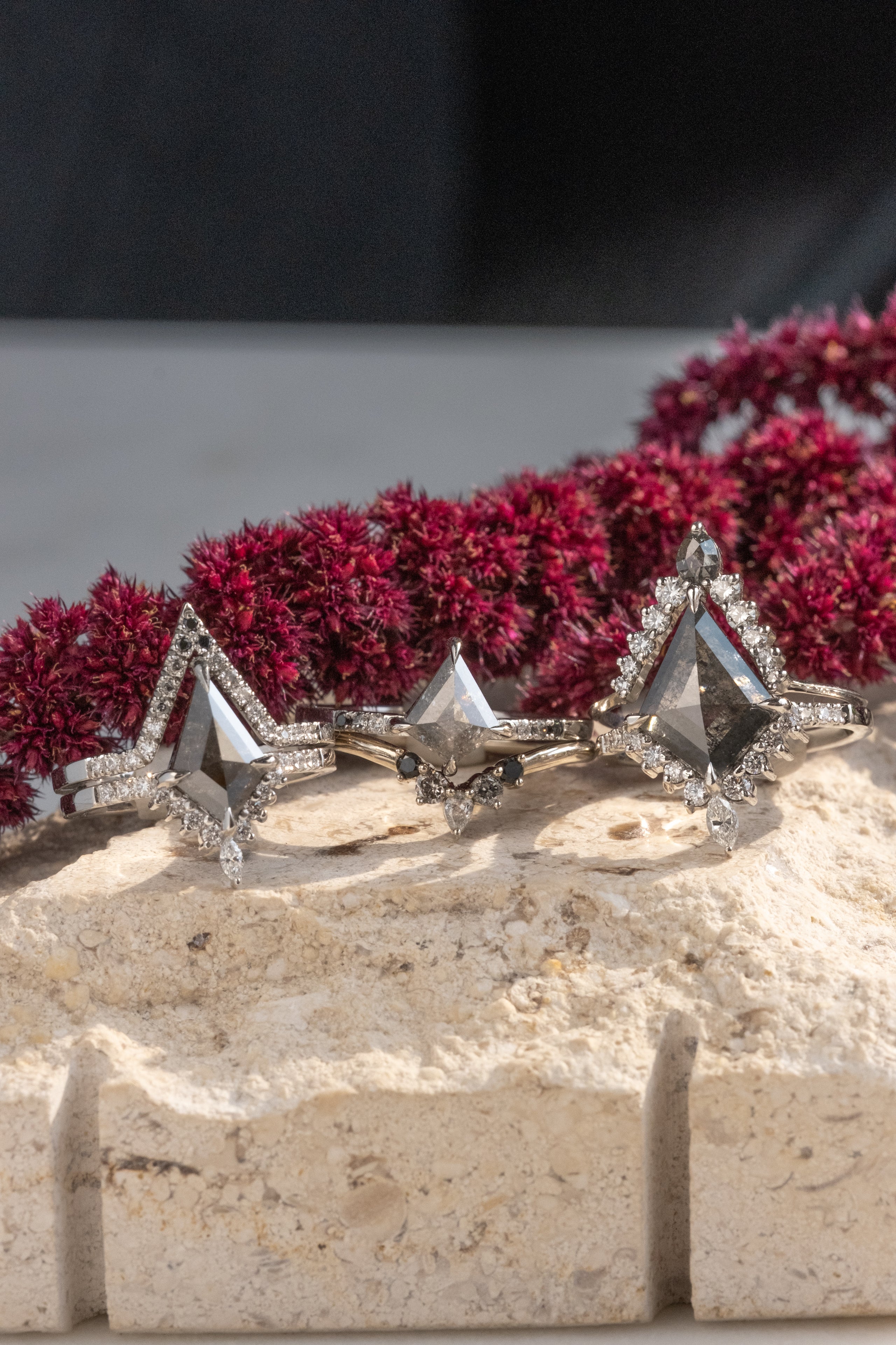This timeless engagement ring features a 2.03 carat salt and pepper rose cut kite diamond. The diamond is a top quality un-enhanced natural diamond; it is semi-translucent with unique tones and facets that catch the light.