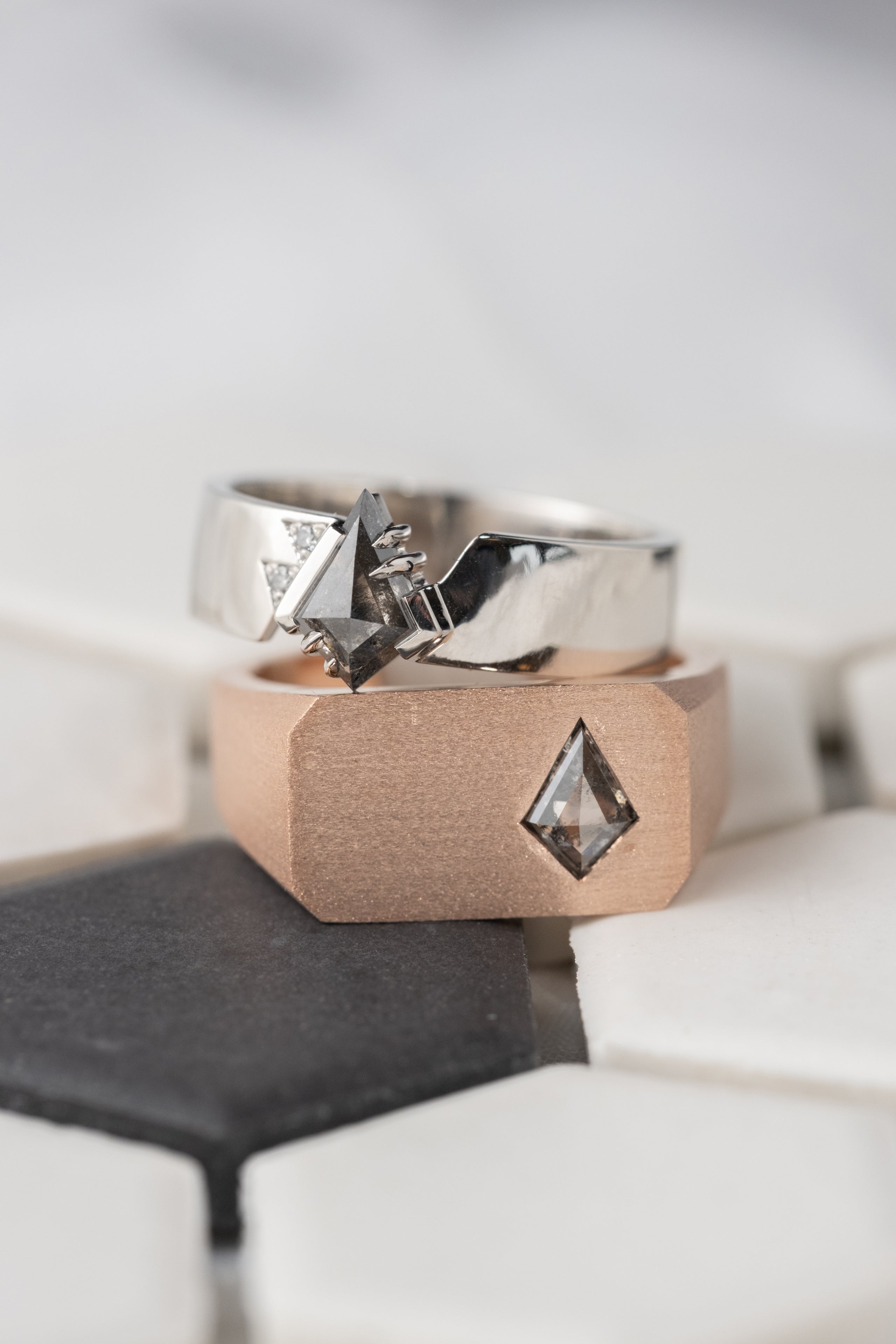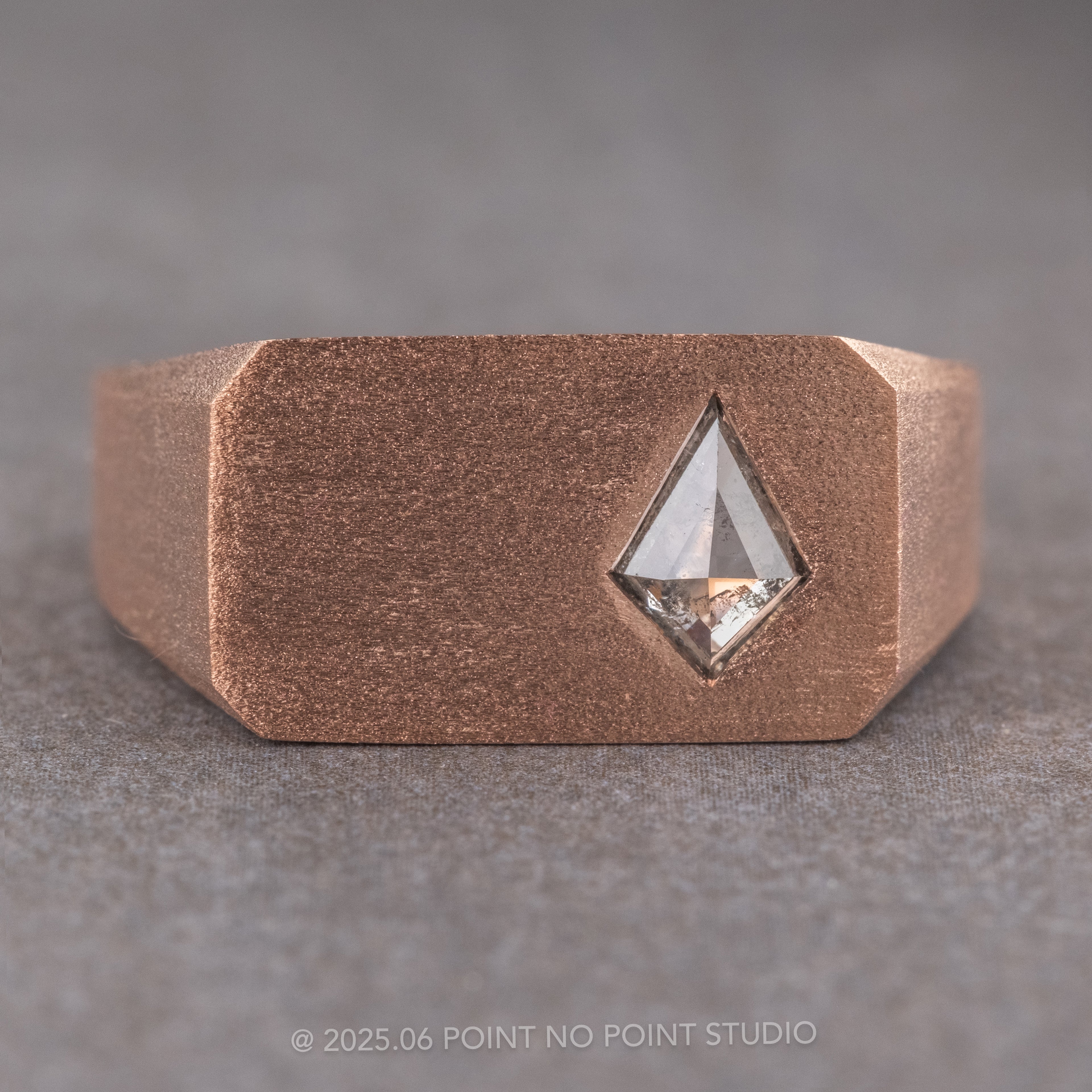 This unique ring has a kite rose cut diamond flush set into the band. The stone is a natural salt and pepper diamond.