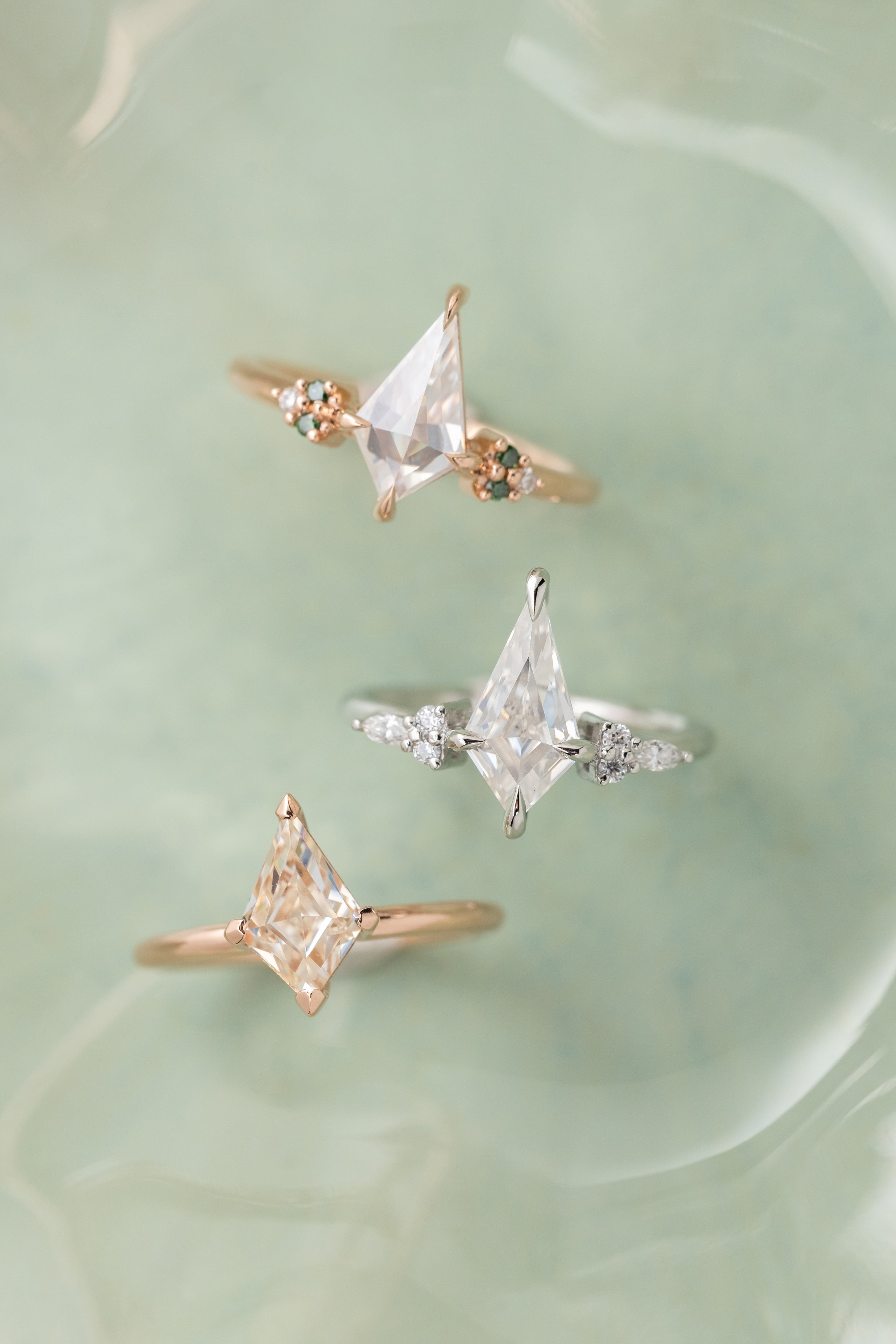 The kite has been set in a 4 prong basket setting, which allows you to see and admire the unique inner structure of the stone. The entire ring is made out of eco friendly recycled platinum with a ring band measuring 1.7mm wide. The setting for the moissanite sits raised off the finger.