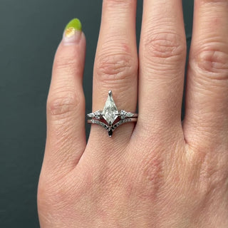 This engagement ring features a beautiful 1.19 carat step cut kite shaped moissanite. The stone is completely translucent and sparkles like there is no tomorrow! The kite is flanked on either side by a cluster of sparkly round and marquise accent moissanites that taper seamlessly into the band.