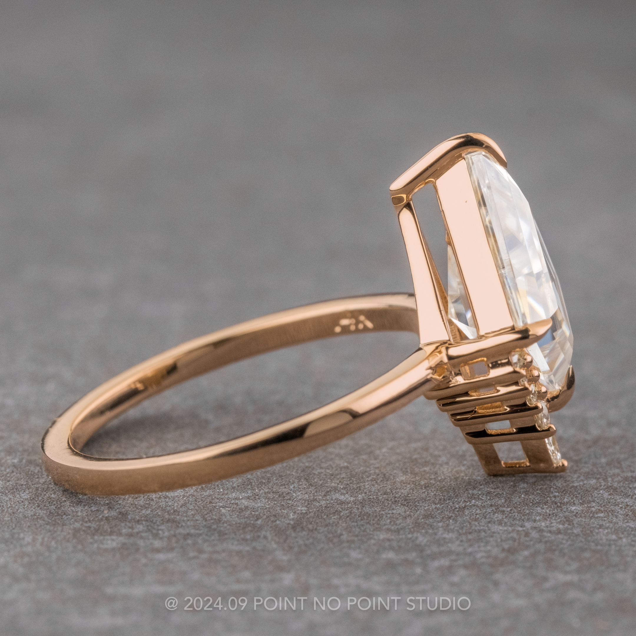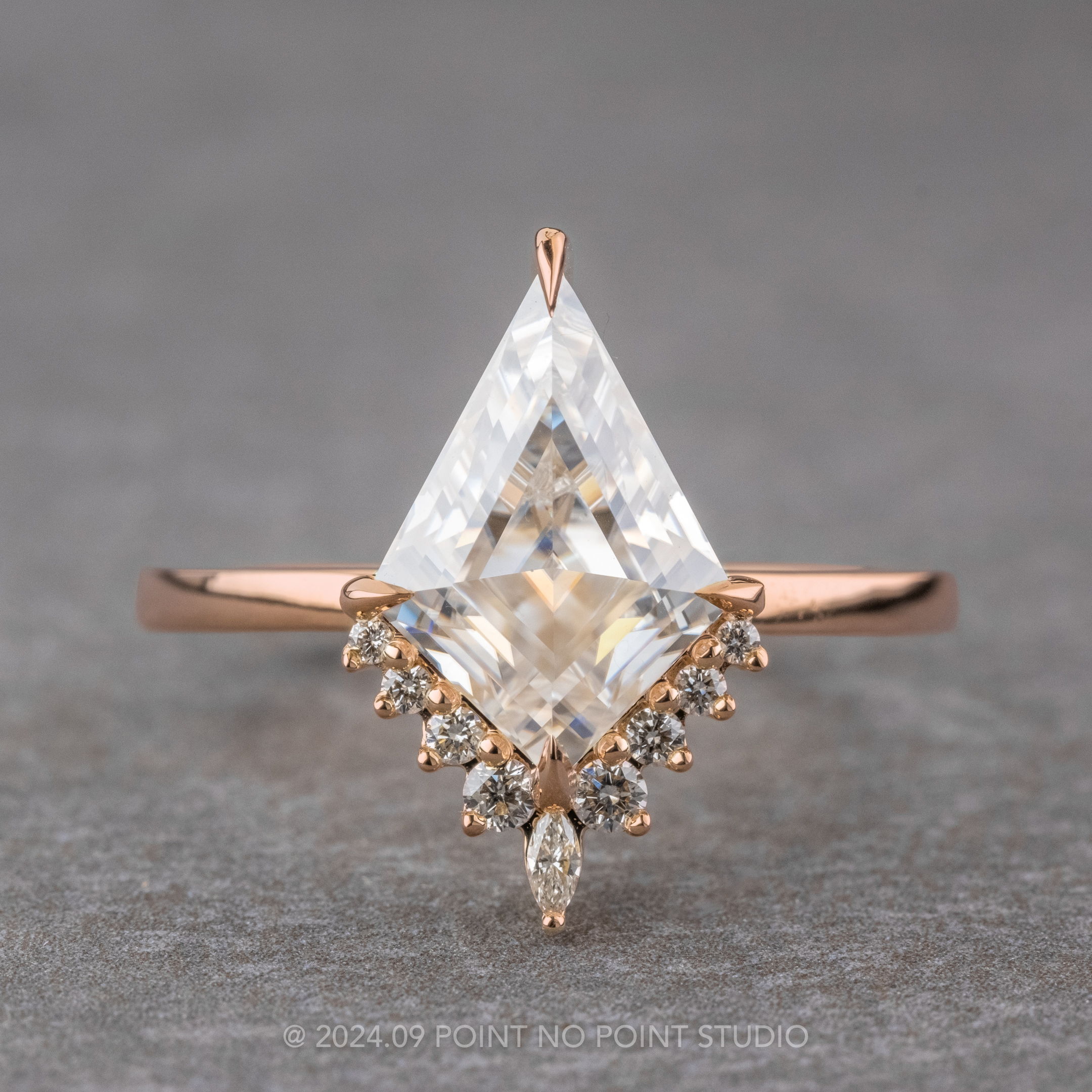 2.39 Carat Kite Moissanite and Diamond Engagement Ring, Ava Setting, 14k Rose Gold