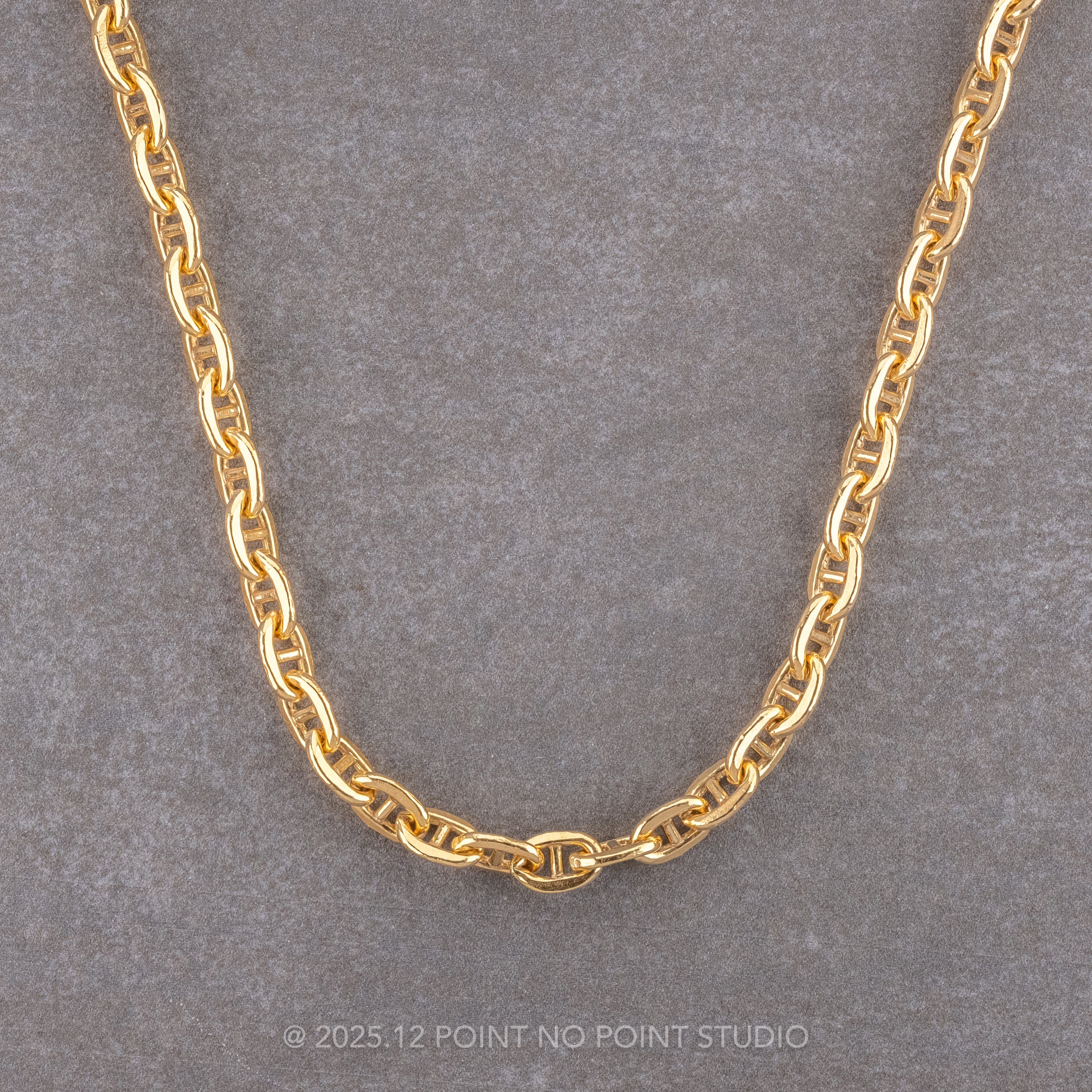 This 14k yellow gold filled dainty and timeless 16" curbed anchor chain necklace drapes beautifully over the collarbone. A wonderful stacking piece to add dimension to your look! Measuring 4.5mm wide with a lobster clasp style closure.