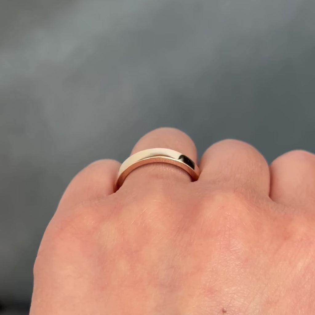 This ring is made of solid recycled eco friendly 14k recycled rose gold. The band is so simple and traditional; the entirety of the ring has been given a high polished finish. The inside of the ring is comfort fit which means that it is slightly domed making it an extremely comfortable ring to wear.