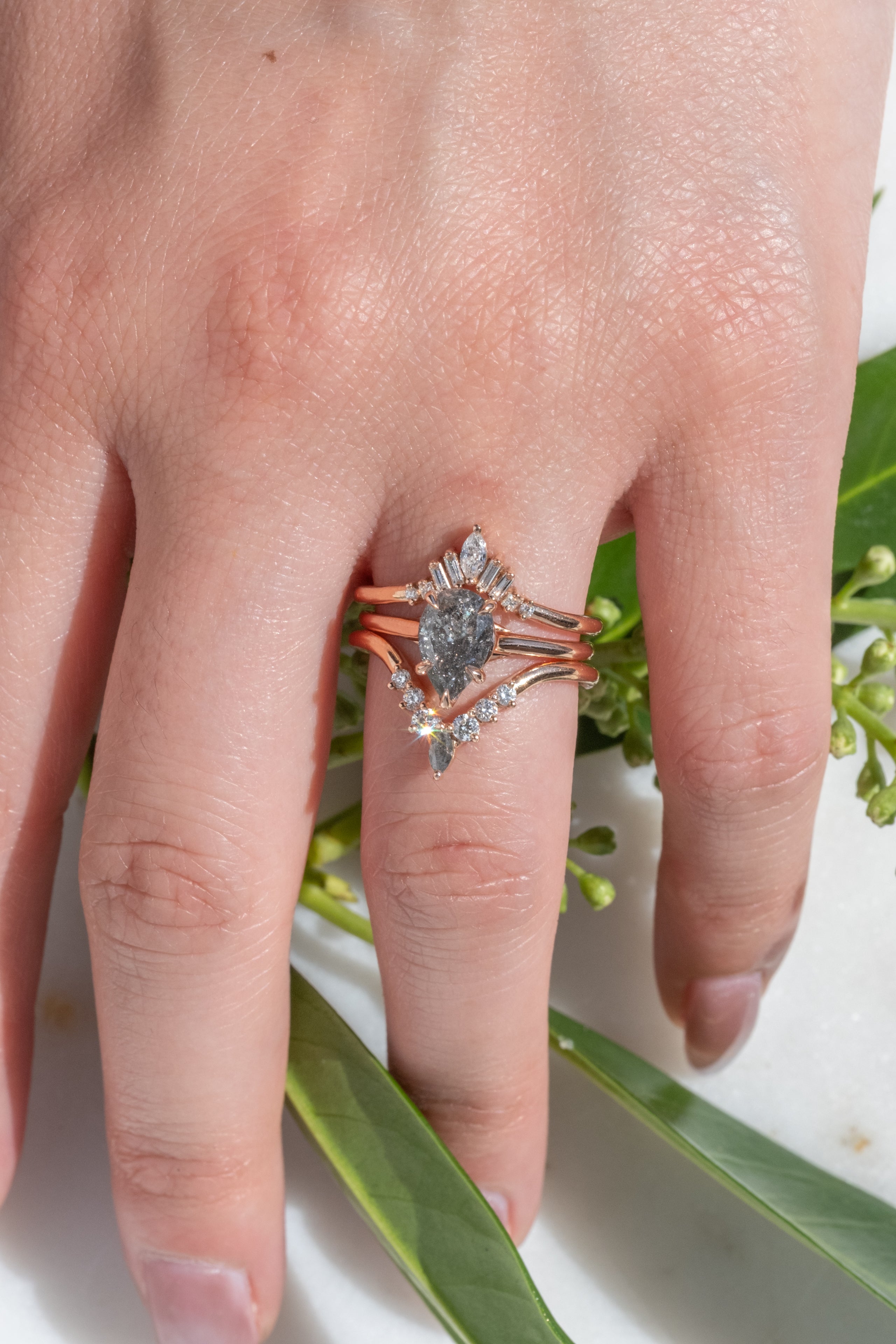 Shown pictured with our Wren and Salt and Pepper Marquise Cassiopeia wedding bands, sold separately here.