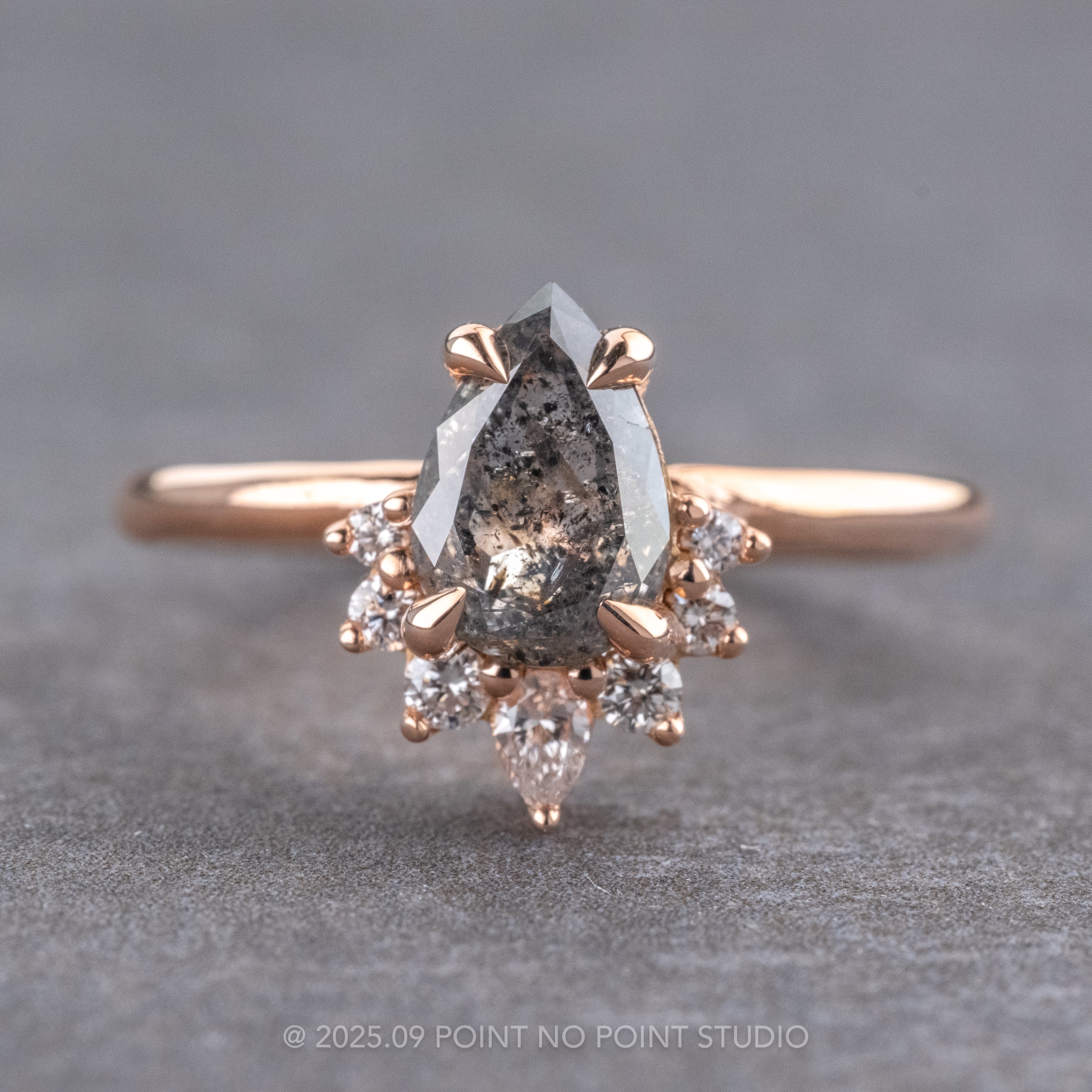 1.31 Carat Salt and Pepper Pear Diamond Engagement Ring, Ava Setting, 14K Rose Gold