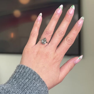 This engagement ring features a beautiful 3.19 carat fancy grey brilliant cut pear shaped diamond. The diamond is a top quality natural diamond that has not been heated or treated in any way; it is semi-translucent with unique inner tones and facets that catch the light.