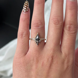 This timeless engagement ring features a .86 carat black kite shaped diamond. The diamond is a top quality natural diamond; it is opaque with unique facets that catch the light. The diamond is surrounded by a gradient of round brilliant cut diamonds with a sparkly black marquise diamond as the focal point. Followed by one white, grey and black brilliant cut diamond set into the band to complete the look!