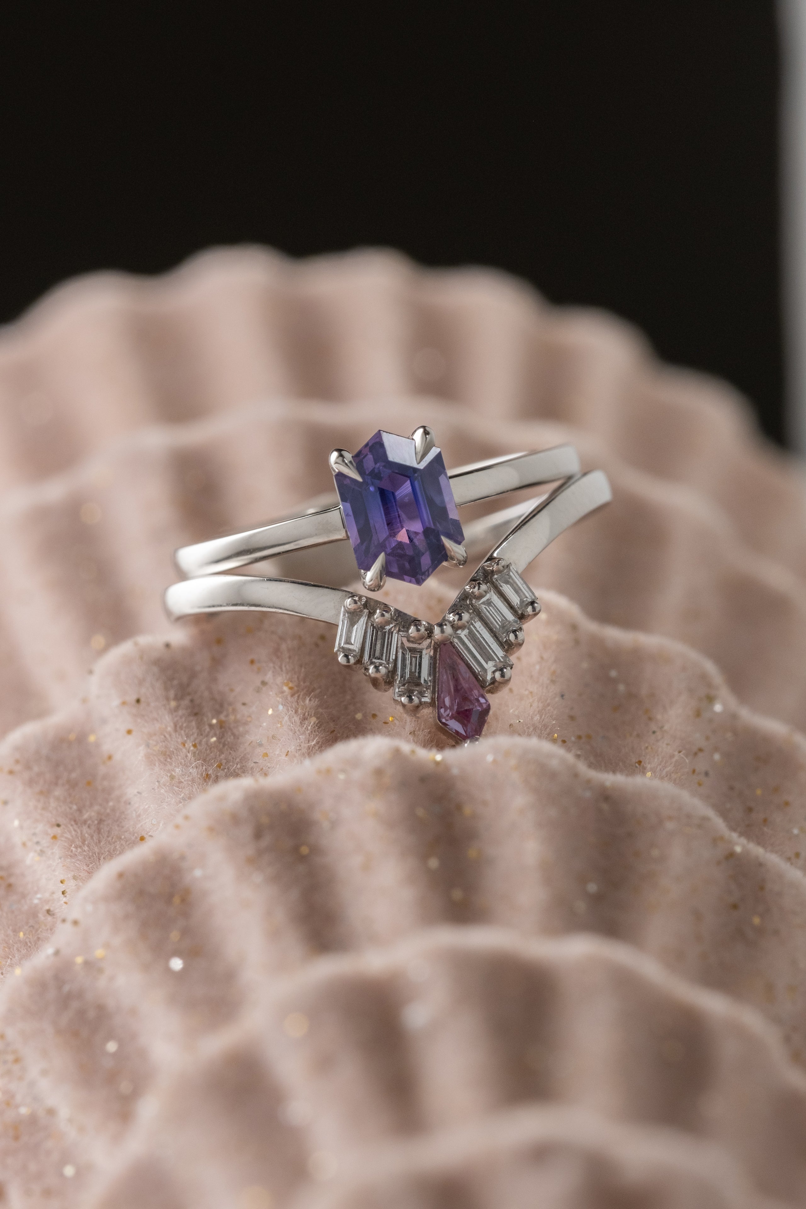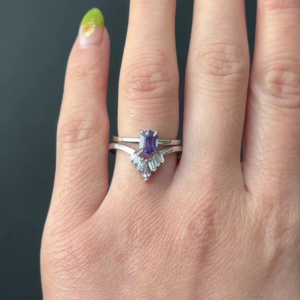 This engagement ring features a beautiful 1.04 carat step cut hexagon shaped purple sapphire. The hexagon is a top quality natural gemstone; it has been set in a 4 prong basket setting, which allows you to see and admire the unique inner structure and tones. The entire ring is made out of eco friendly recycled platinum with a ring band measuring 1.7mm wide. The setting for the hexagon sits raised off the finger.