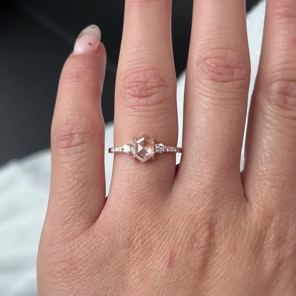 The entire ring is made of recycled 14k rose gold with a ring band measuring 1.7mm wide. The hexagon diamond is set in a 4 prong open backplate low-profile setting, making the ring extremely comfortable and suitable for everyday wear. The open backplate allows for light to illuminate through the hexagon diamond bringing the stone to life!