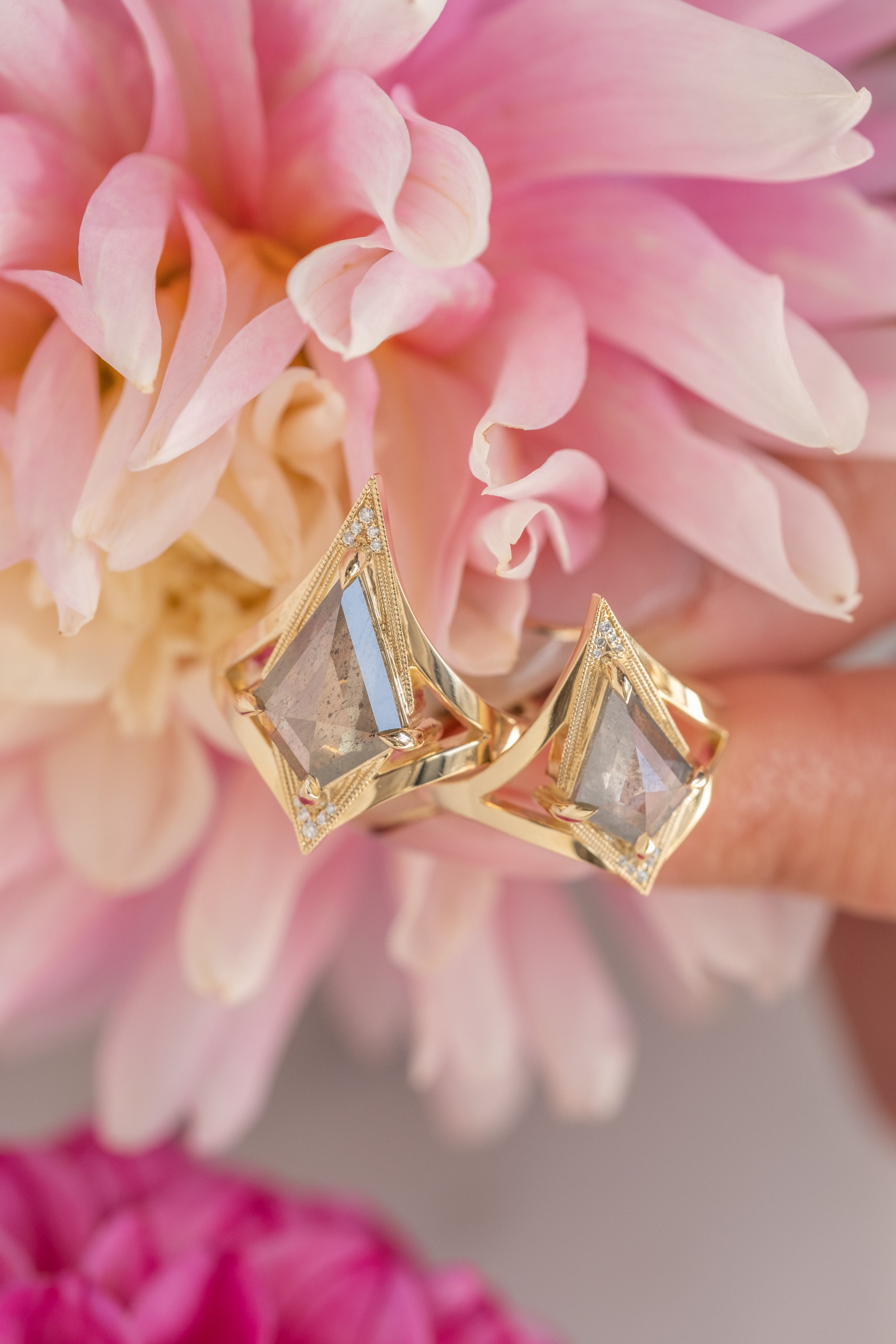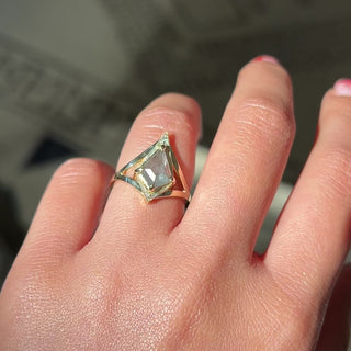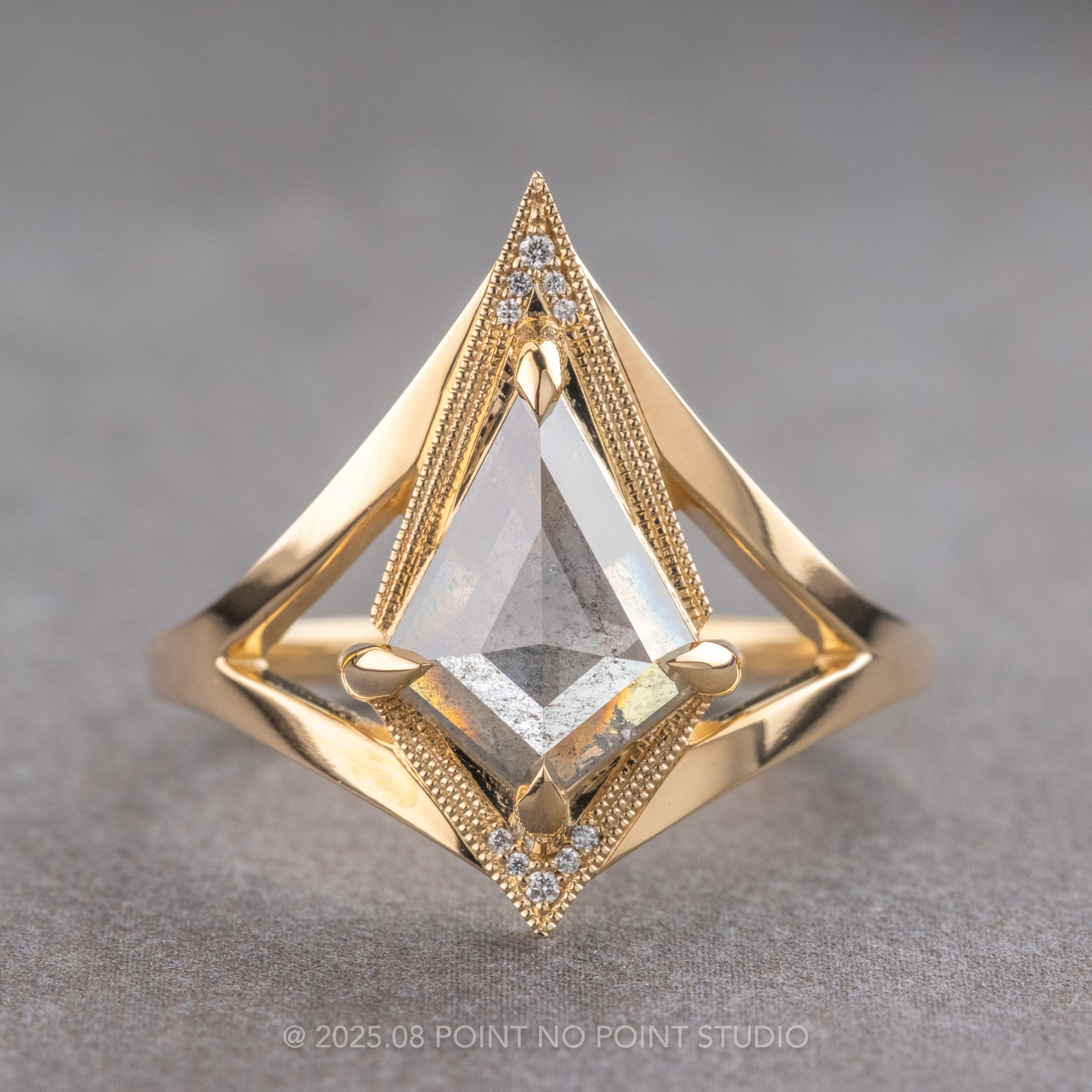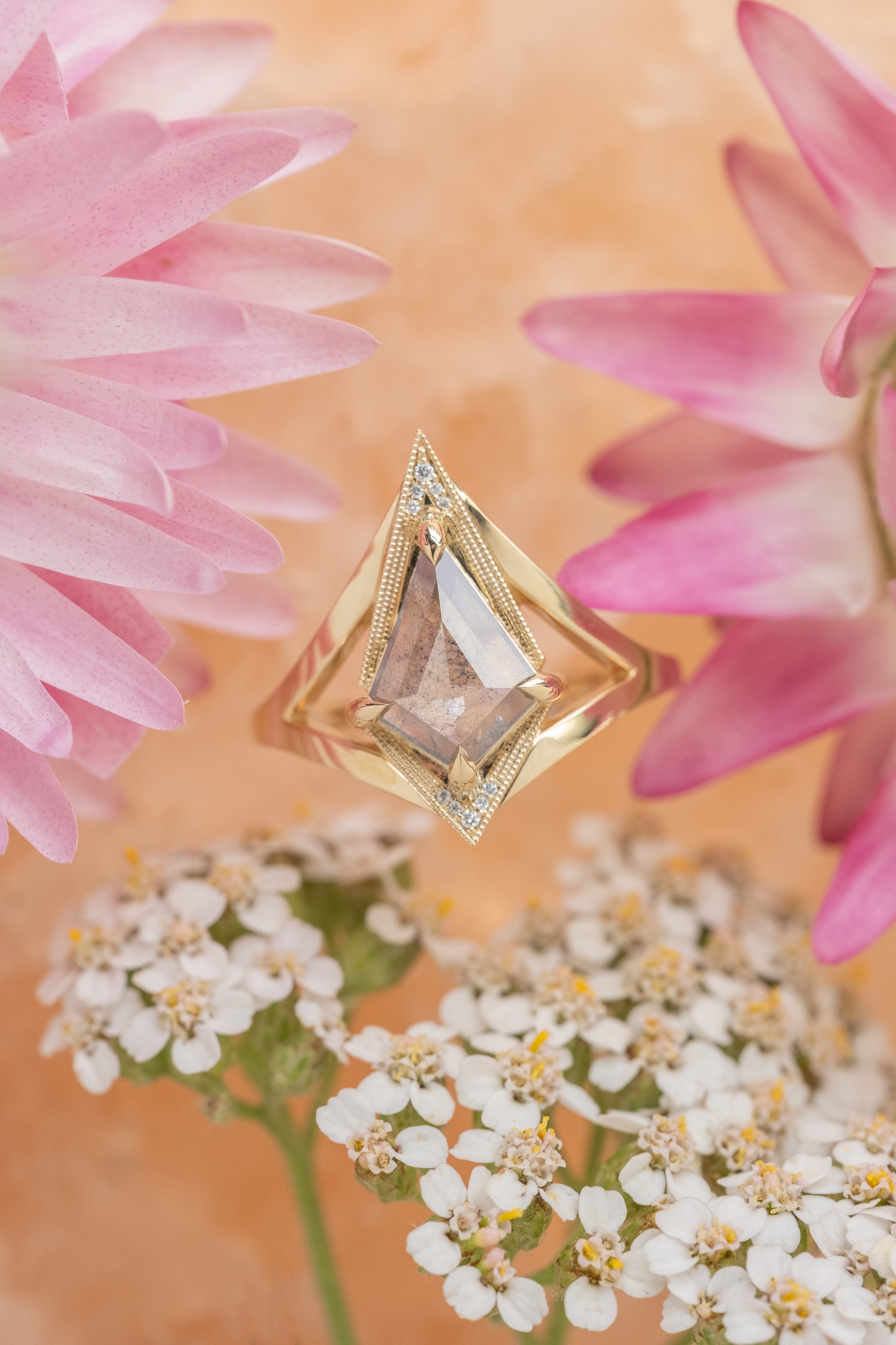 This magical ring features a stunning all-natural and hand-faceted salt and pepper kite shape rose cut diamond. The diamond is set into an open back setting to allow light to illuminate through the diamond. The setting has elegant hand engraved milgrain detailing around the GHSI white accent diamonds.