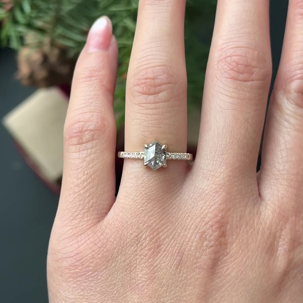 1.26 Carat Salt and Pepper Hexagon Diamond Engagement Ring, Jules Setting, 14K Yellow Gold