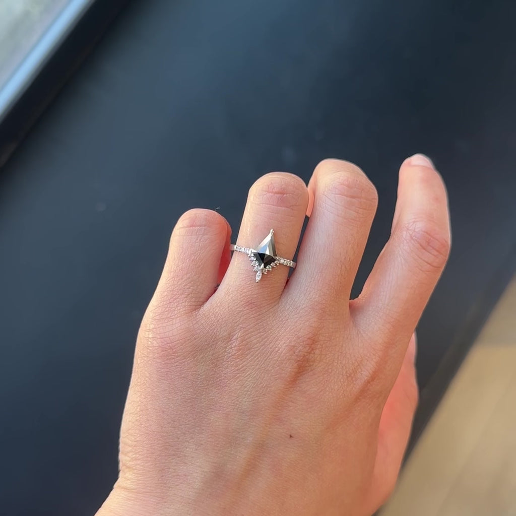 This timeless engagement ring features a 1.16 carat black rose cut kite diamond. The kite is a top quality, natural diamond; it is opaque with unique facets that catch the light. The diamond sits on top of a sparkly half-halo of faceted white diamonds with the focal point being a white marquise diamond. Set into the band are three GHSI faceted white diamonds to complete the look!