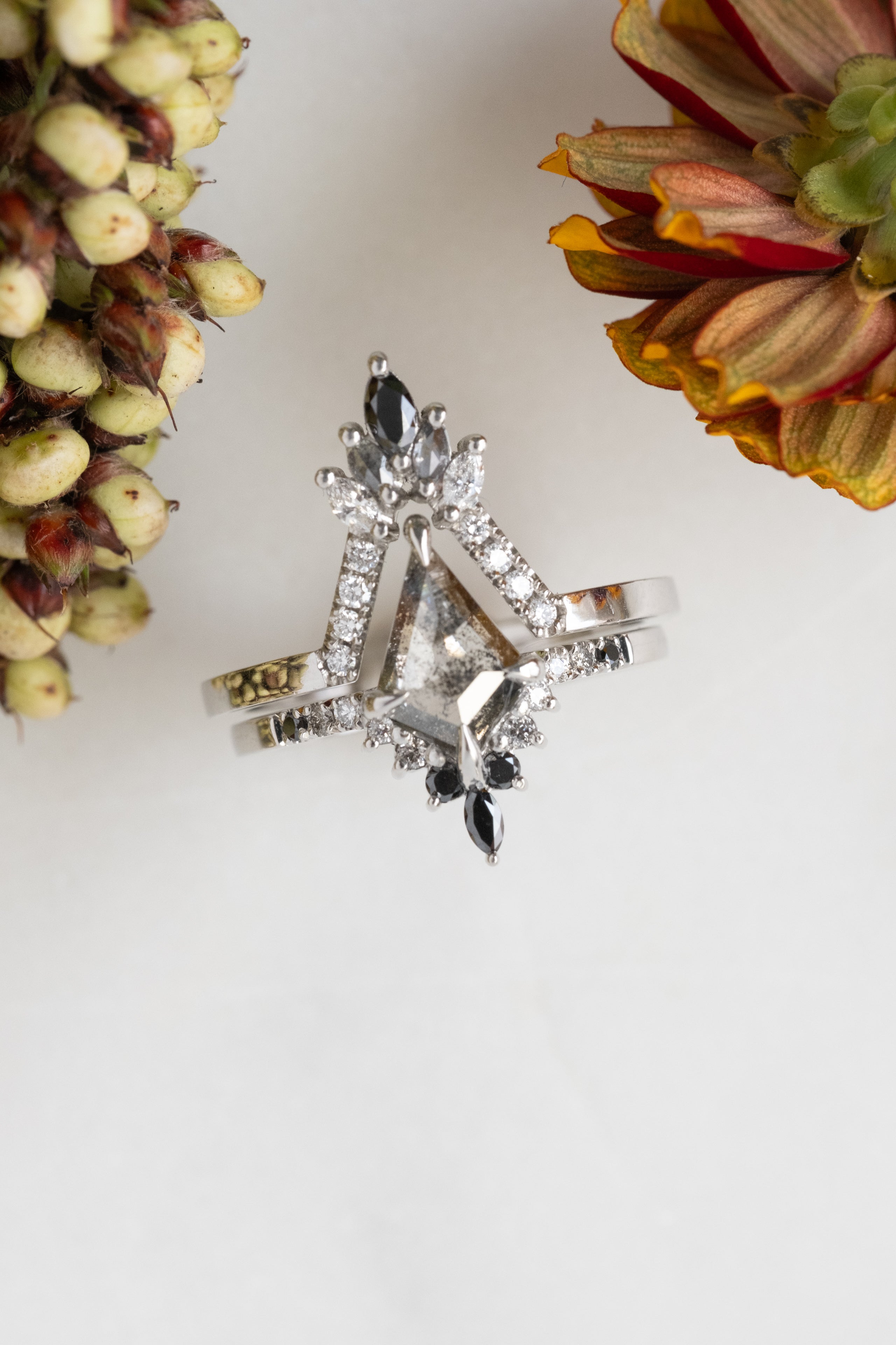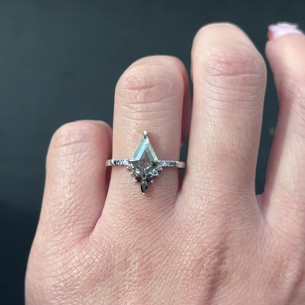 This timeless engagement ring features a striking 1.15 carat salt and pepper rose cut kite diamond. The diamond is a top quality natural diamond and has been set in a low profile 4 prong setting with a half-halo of faceted ombre diamonds with the focal point being a black marquise diamond. Followed by one white, grey and black brilliant cut diamond set into the band to complete the look!