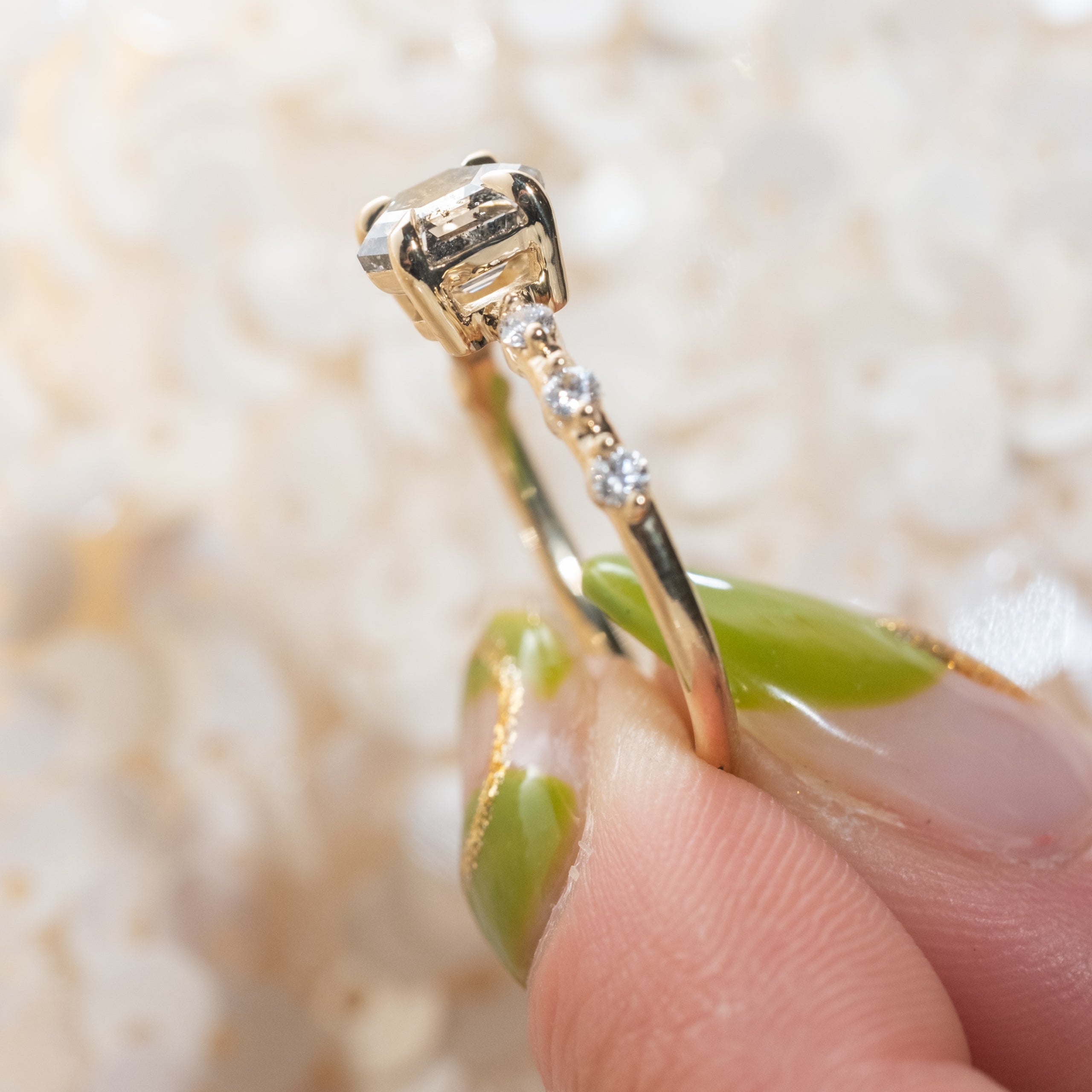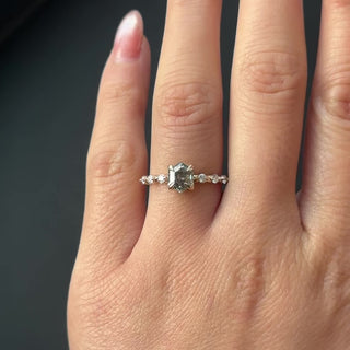 The ring features a gorgeousĀ 1.14 carat Canadian salt and pepper hexagon diamond. The diamond is a top quality natural diamond; it is semi-translucent with unique tones and facets that catch the light. The hexagon diamond is flanked on either side by sparkly GHSI white accent diamonds in the band for that extra sparkle!