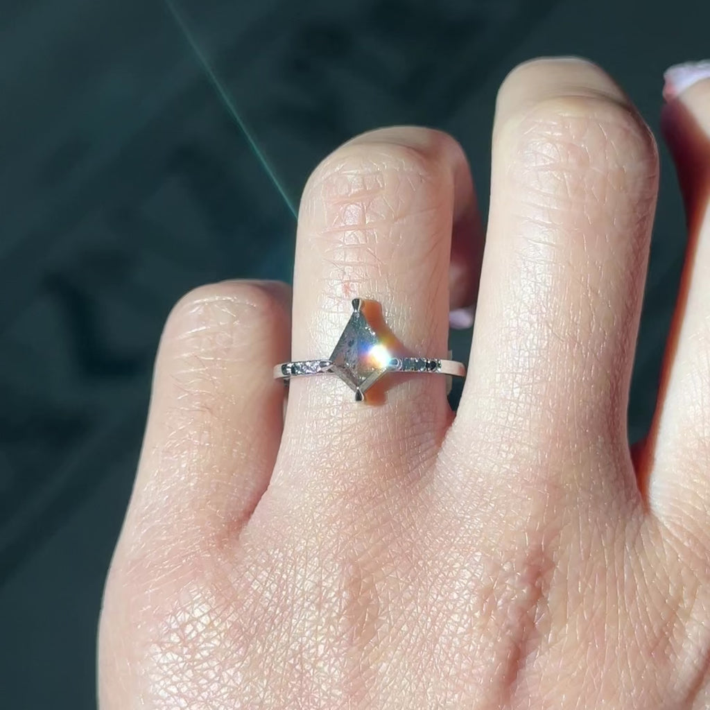 This engagement ring features a mesmerizing and incredibly sparkly 1.30 carat salt and pepper kite rose cut diamond. The diamond is a top-quality natural stone, it is semi-translucent with unique tones and facets that catch the light. Flanked on either side by white, grey and black diamonds in the band to create a flawless ombre effect.