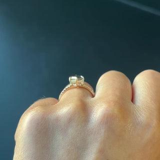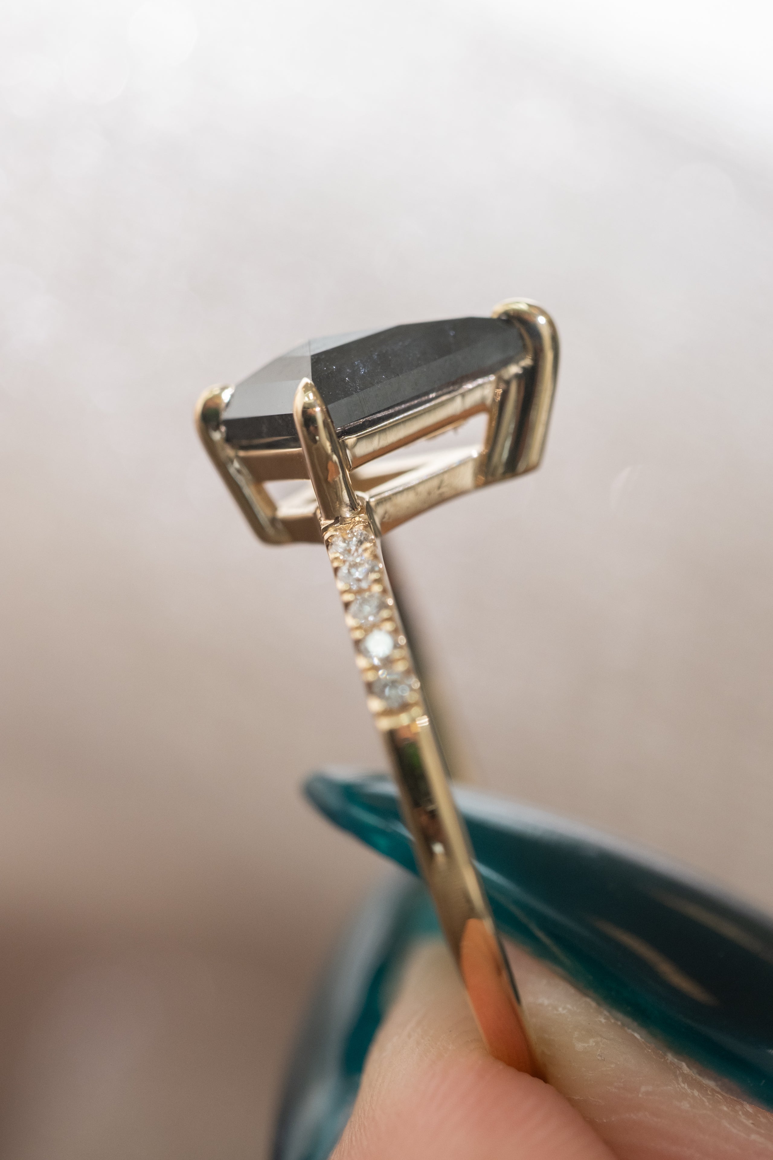 This engagement ring features a 1.28 carat semi-translucent salt and pepper kite shaped rose cut diamond. The diamond is a top quality, all-natural stone that has not been heat treated or enhanced in any way. There are five sparkly GHSI white brilliant cut round accent diamonds set into the ring band on each side of the kite diamond for that extra sparkle!