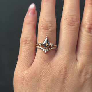 This beautiful and dainty ring features a semi-translucent black speckled rose cut kite shaped diamond. The kite is a top quality, all-natural diamond that is not heat treated or enhanced in any way. The diamond is flanked on either side by a cluster of sparkly GHSI white round accent diamonds that taper seamlessly into the band.